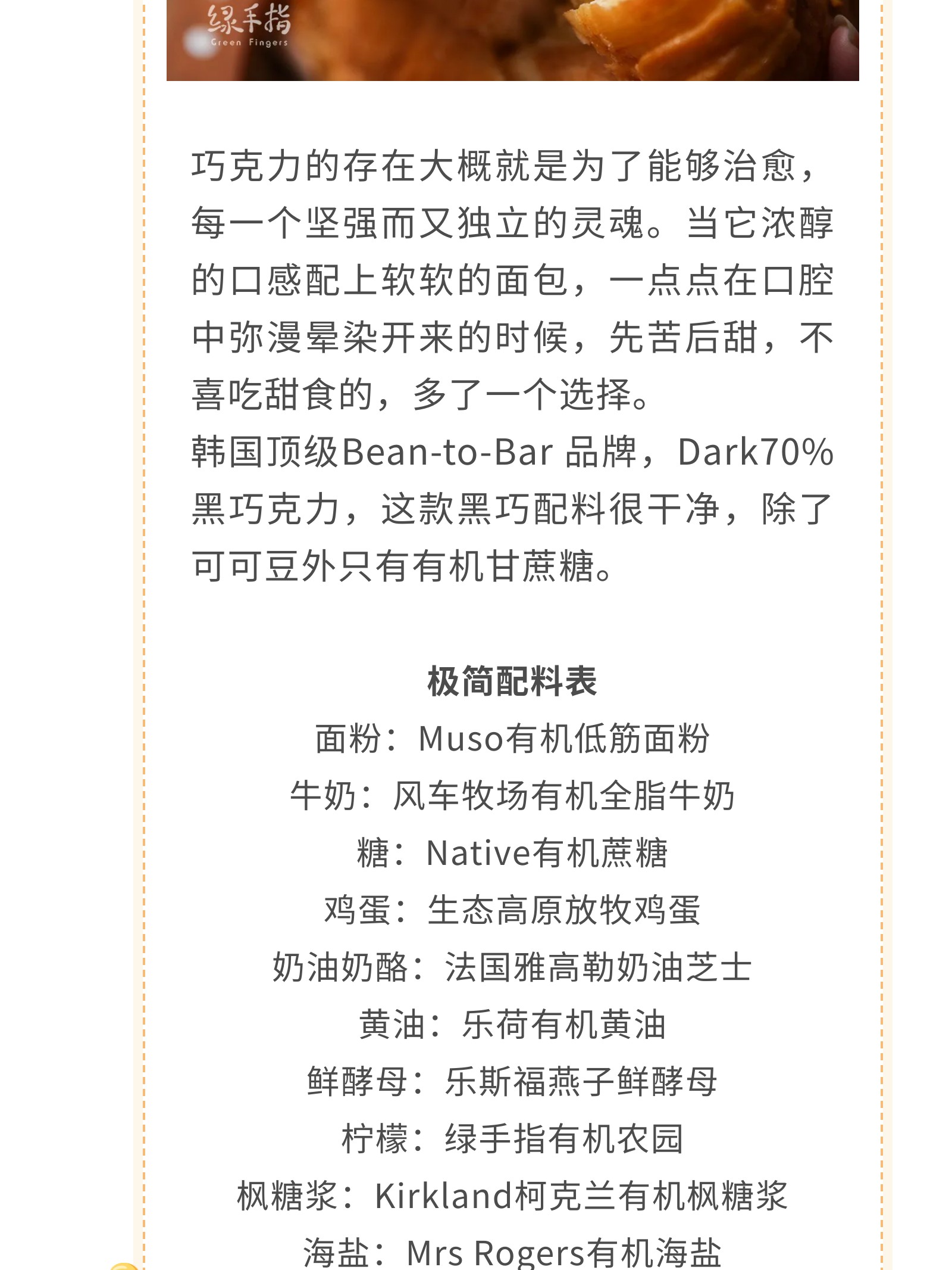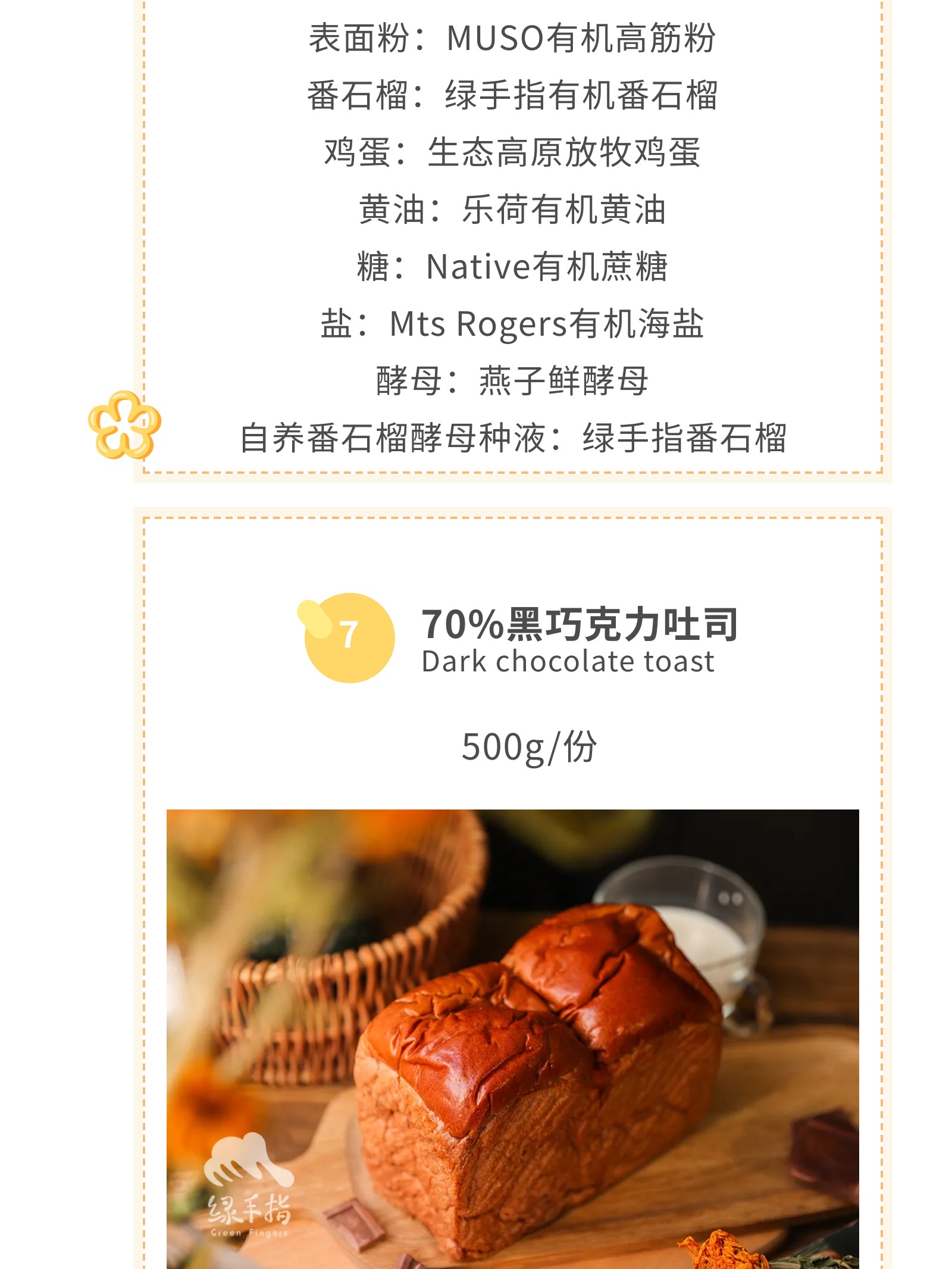 按照绿手指产品研发的惯例,吐司制作主料均为生态有机原料,所有食材来自绿手指农园、全国各地的生态农场及全球优质有机食材供应商,由绿家菜友张媛媛女士制作。