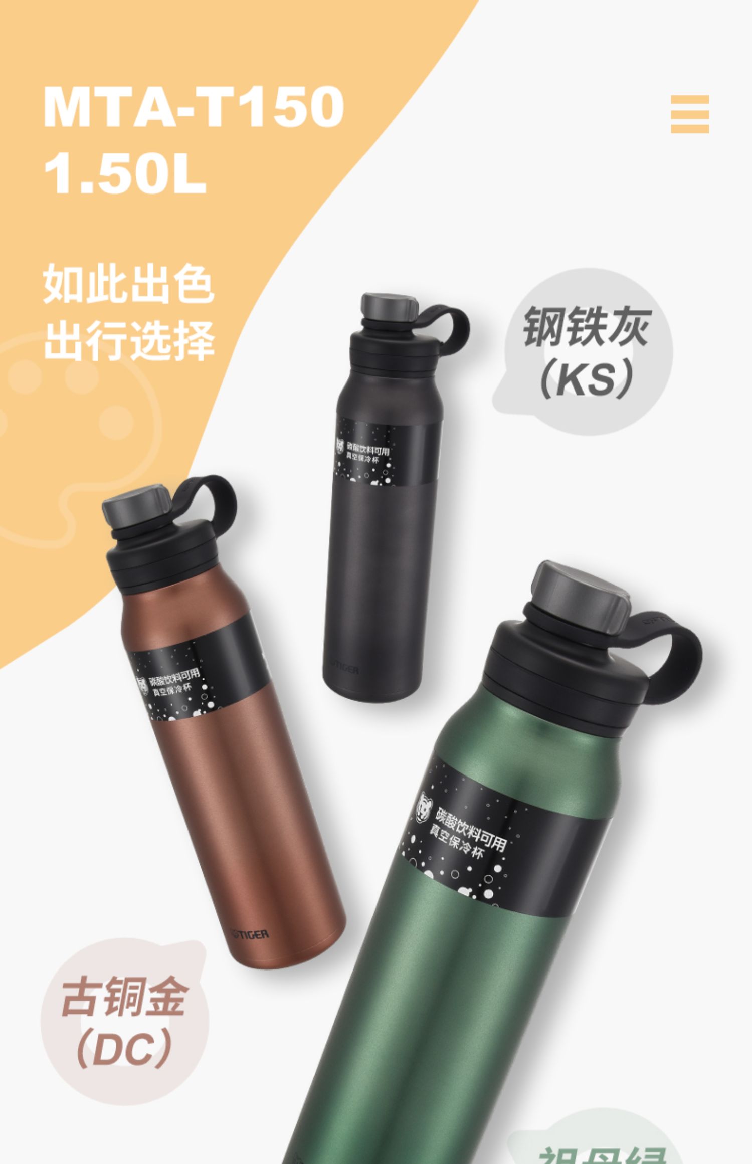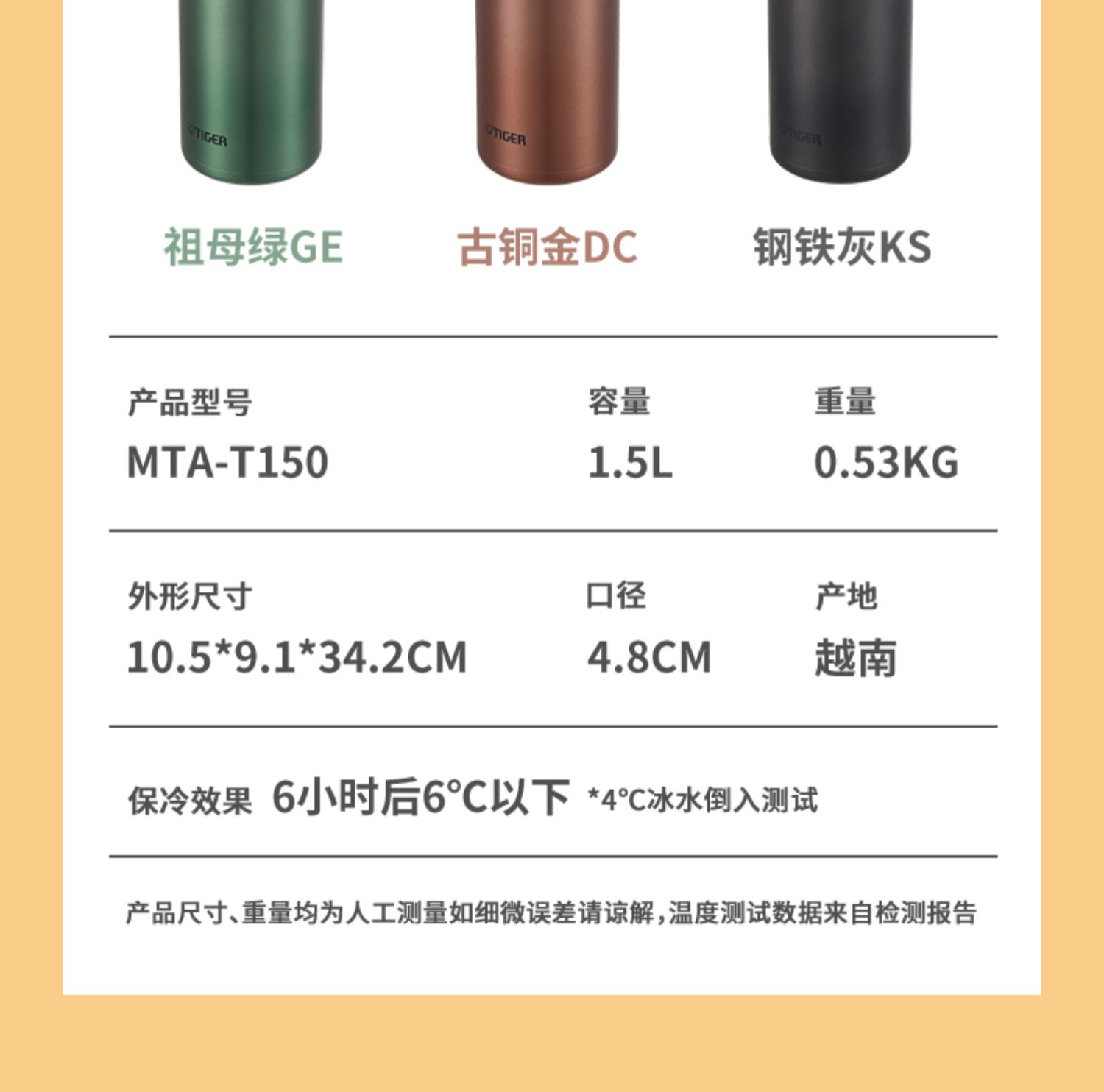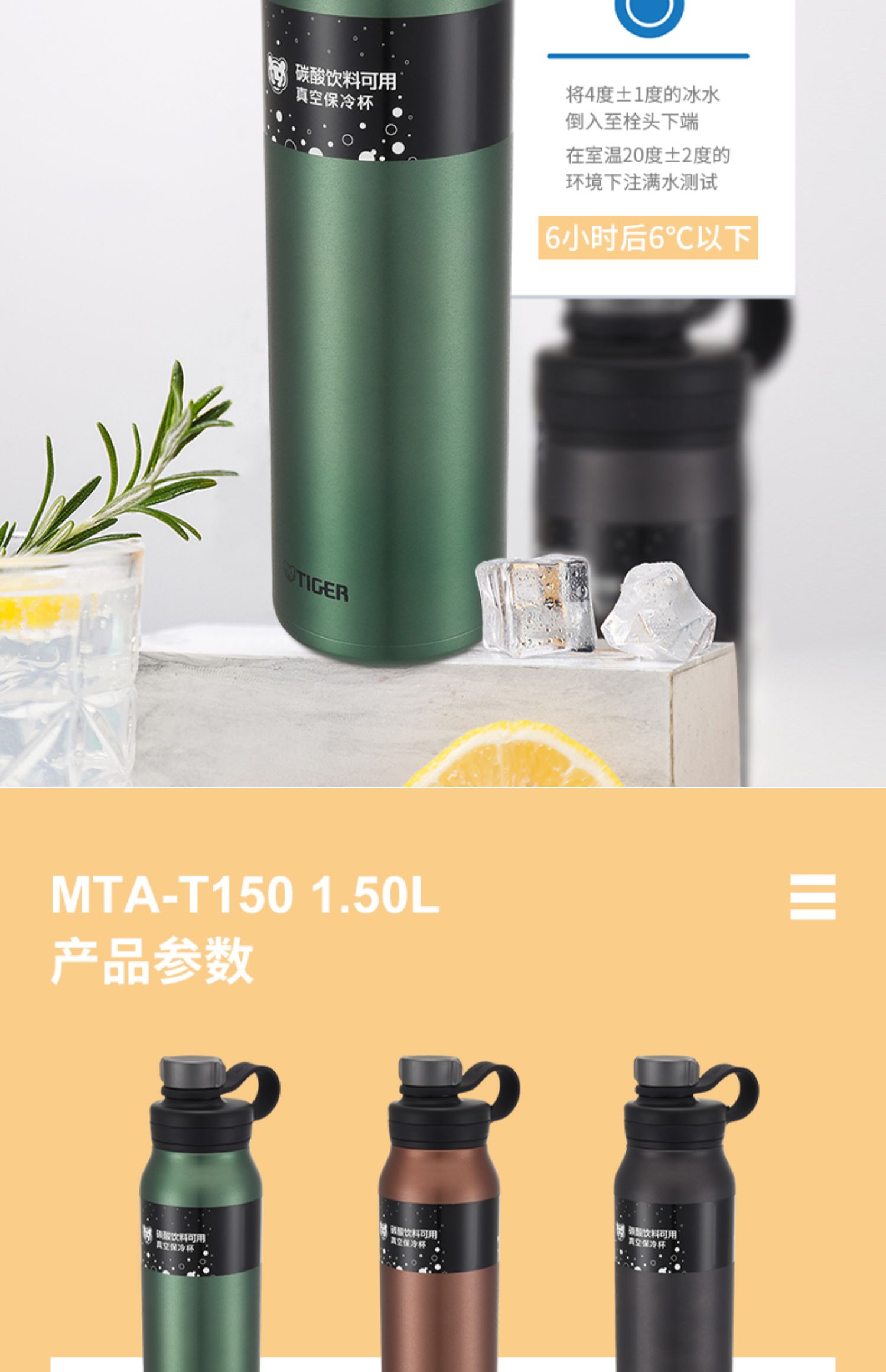 TIGER/虎牌 小钢炮不锈钢保冷杯MTA-T150大容量户外运动水杯1500ml