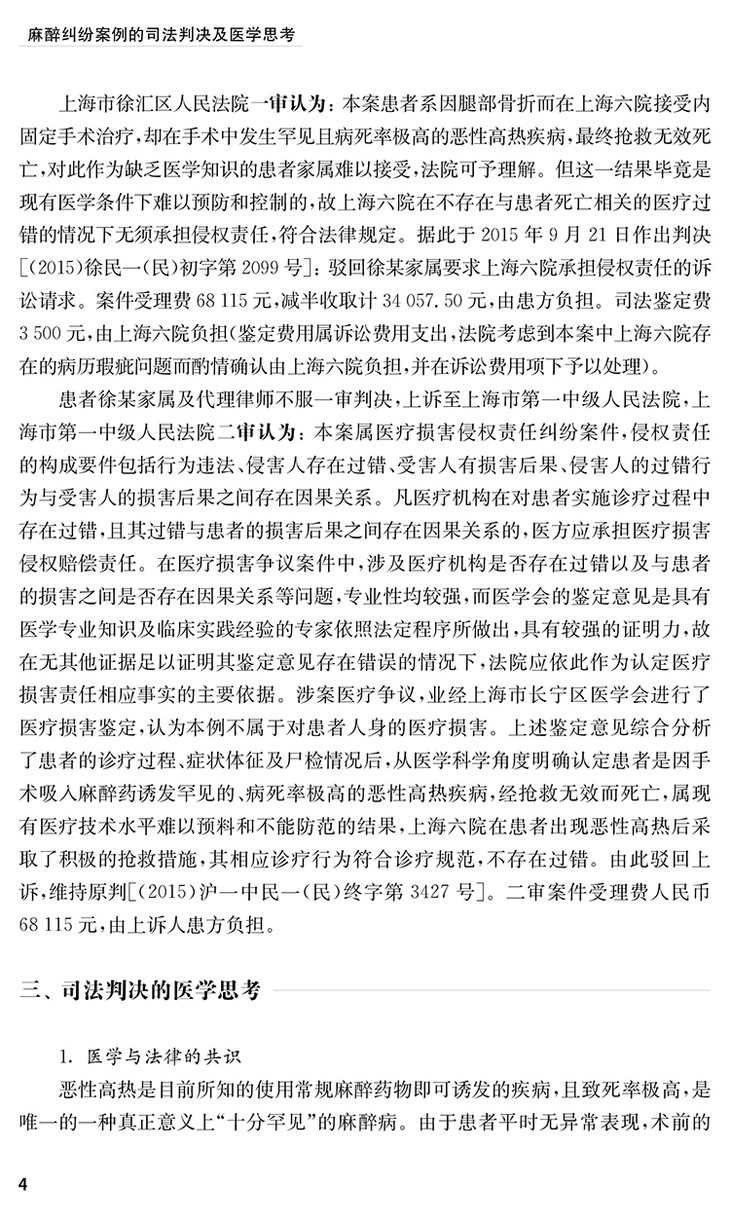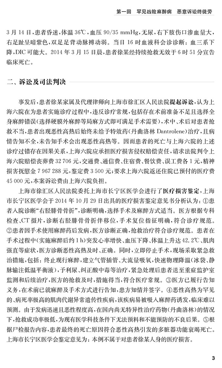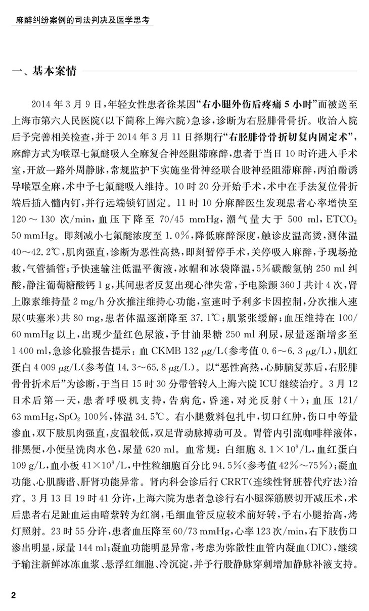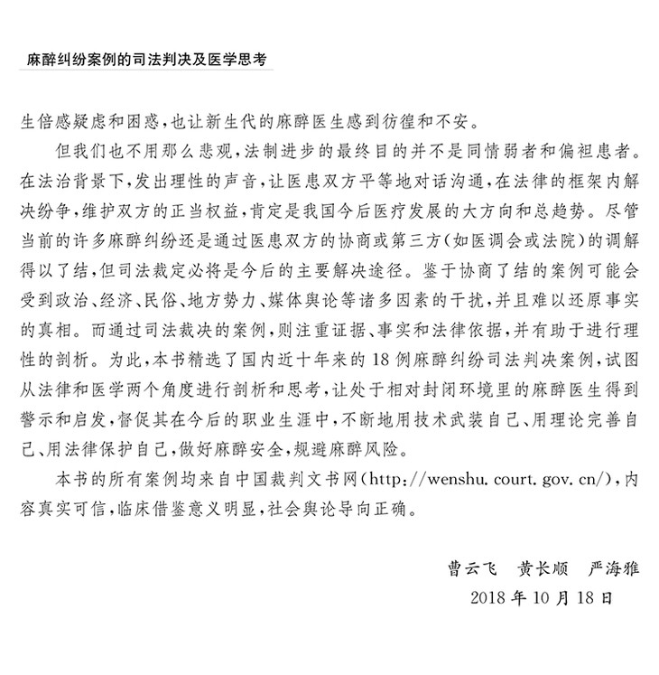 本书精选了近年来具有典型意义的18例麻醉纠纷司法判决案例,内容基本覆盖了临床麻醉过程中容易出现安全隐患和医疗纠纷的各个方面和环节,通过对基本案情、诉讼过程、司法判决的梳理,引申出案例背后相关医学问题的思考,主要目的是引导麻醉医生换位思考,从法院的判决及其法律依据角度来看待医疗事故和纠纷,并从中进行反思和吸取教训。