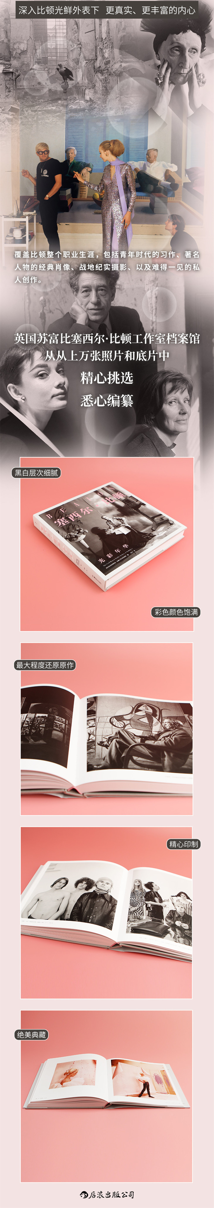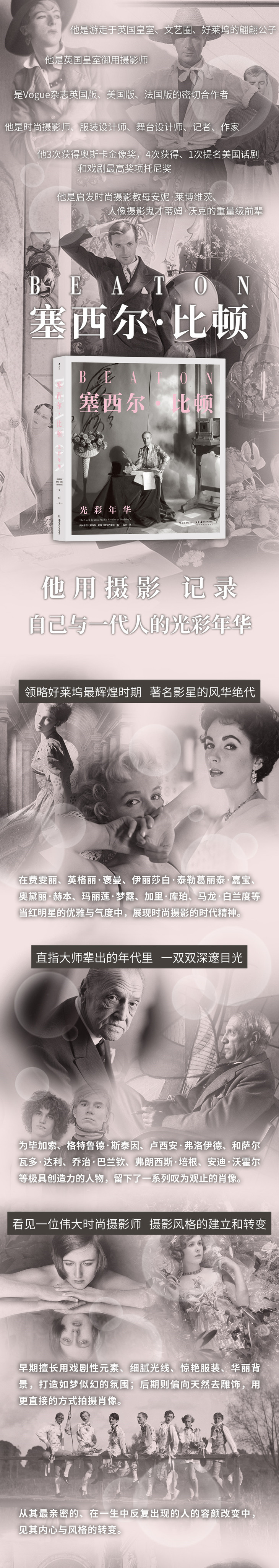 本书对他的摄影生涯进行了重新评定,照片多数是从苏富比塞西尔·比顿工作室档案的上千张照片和底片中挑选出来的。比顿在童年时期就喜爱收藏照片。从青少年时期起,他的妹妹们开始充当他的首批模特。拍照成了家庭服装表演的延伸项目。后来他成为大西洋两岸的《时尚》杂志的明星,满怀信心地踏入好莱坞,就像他时常从容自如地出入于英国社交场所那样。有一段时期,他敏锐的戏剧意识令他深受超现实主义的影响。他对服装与生俱来的优雅品味,与其时尚摄影大师的身份十分相称。到1960年代,他已经自如地在白金汉宫为女王拍照了,就像他与“摇摆伦敦”的名人们在一起,或是在纽约与安迪·沃霍尔和他的“工厂”明星们在一起时一样。比顿在电影《迷幻演出》的片场为米克·贾格尔拍摄照片后,他的摄影生涯走向了完结,同时也标志着一个时代的落幕。本书展现了各个时期反复出现在他照片里的人物,用图像的方式讲述了他的一生。