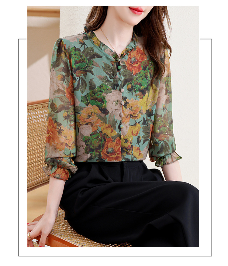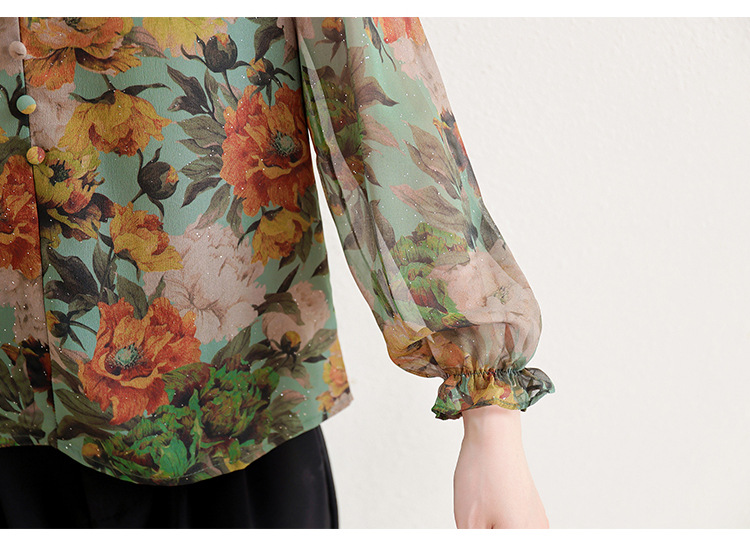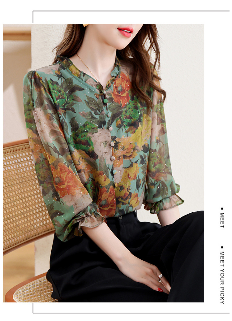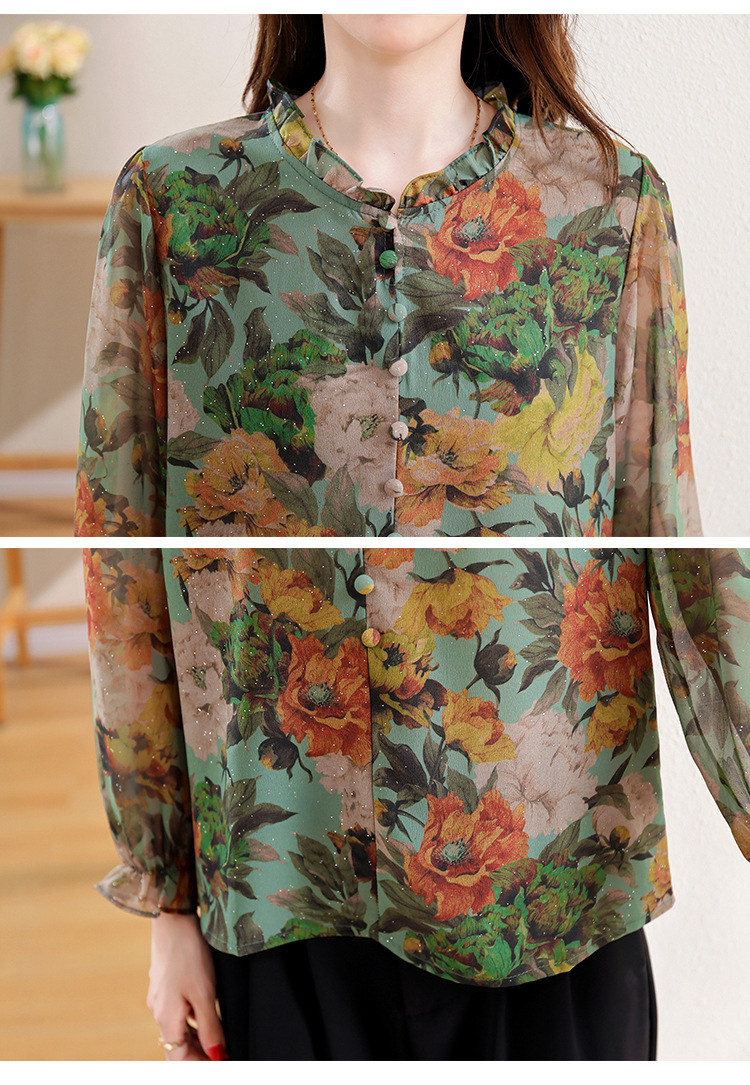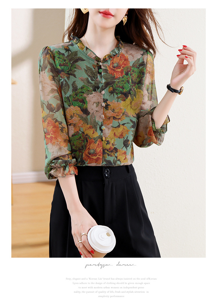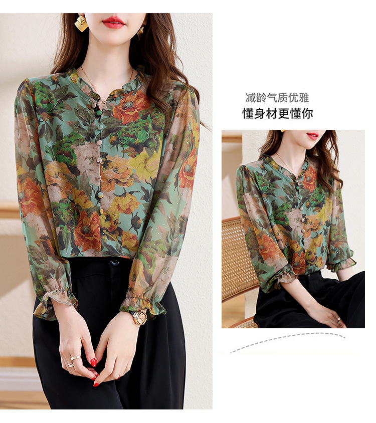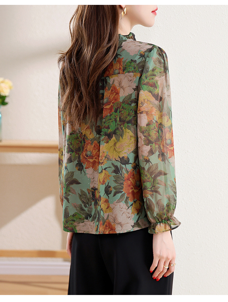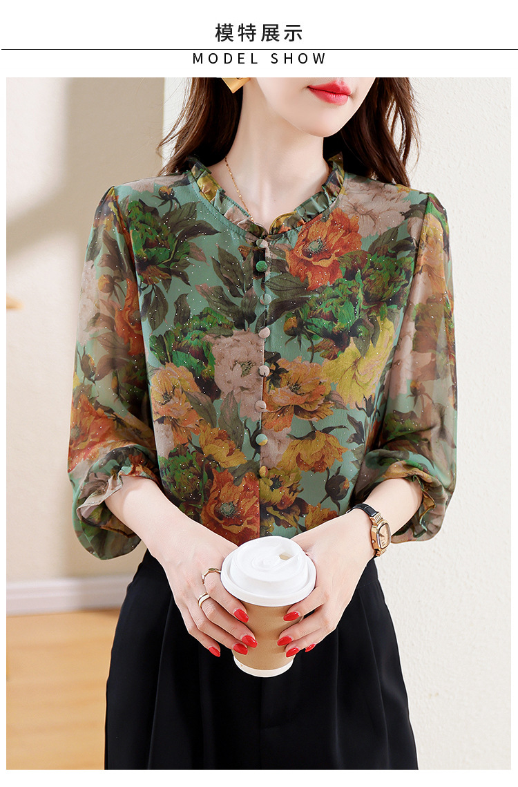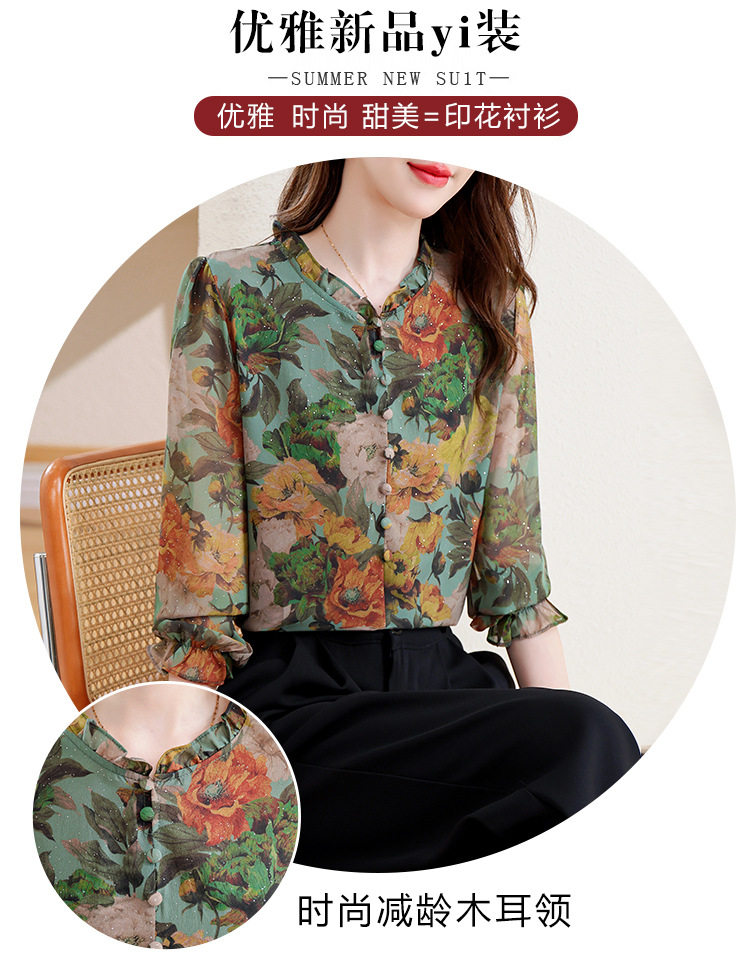 KQL2025秋季新款法式时尚木耳领喇叭袖显瘦简约桑花皱印花上衣女