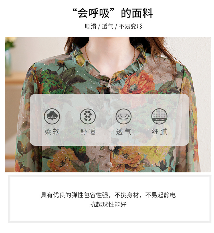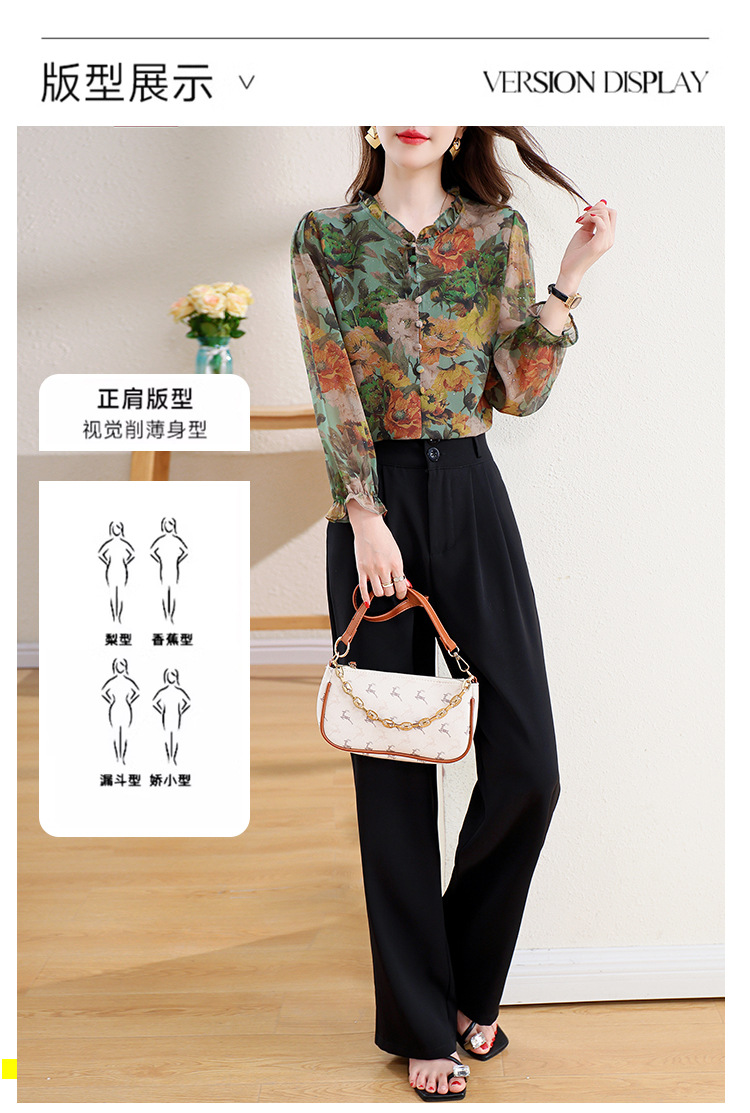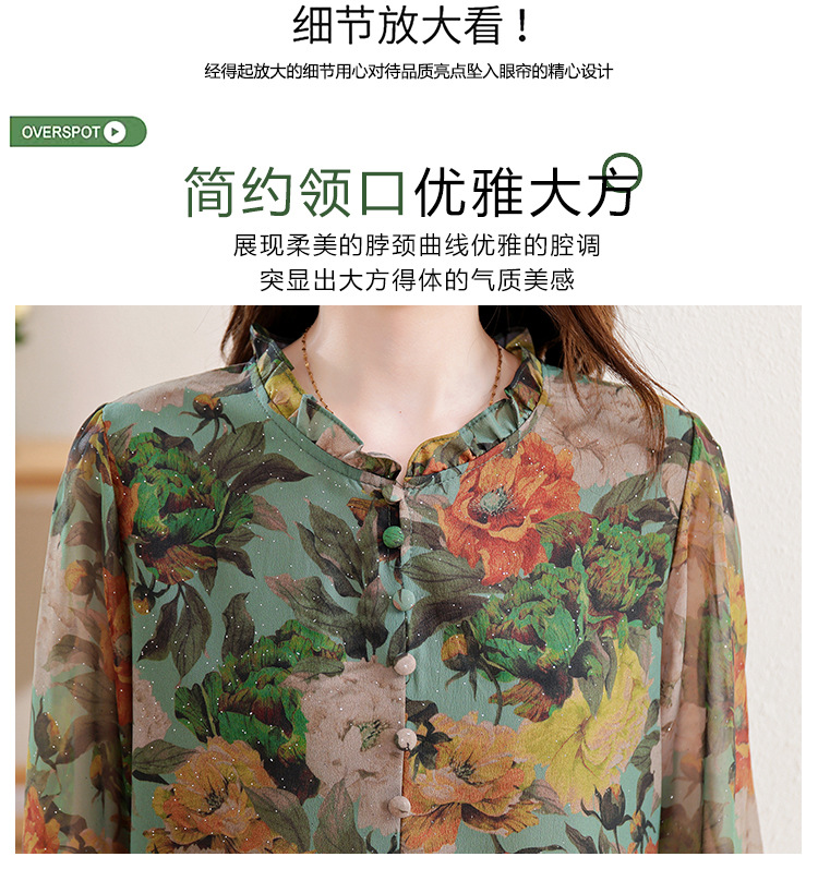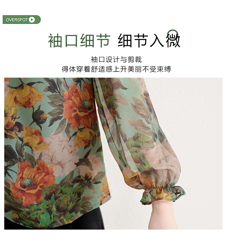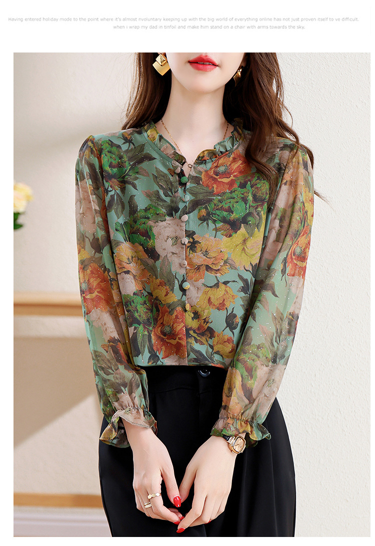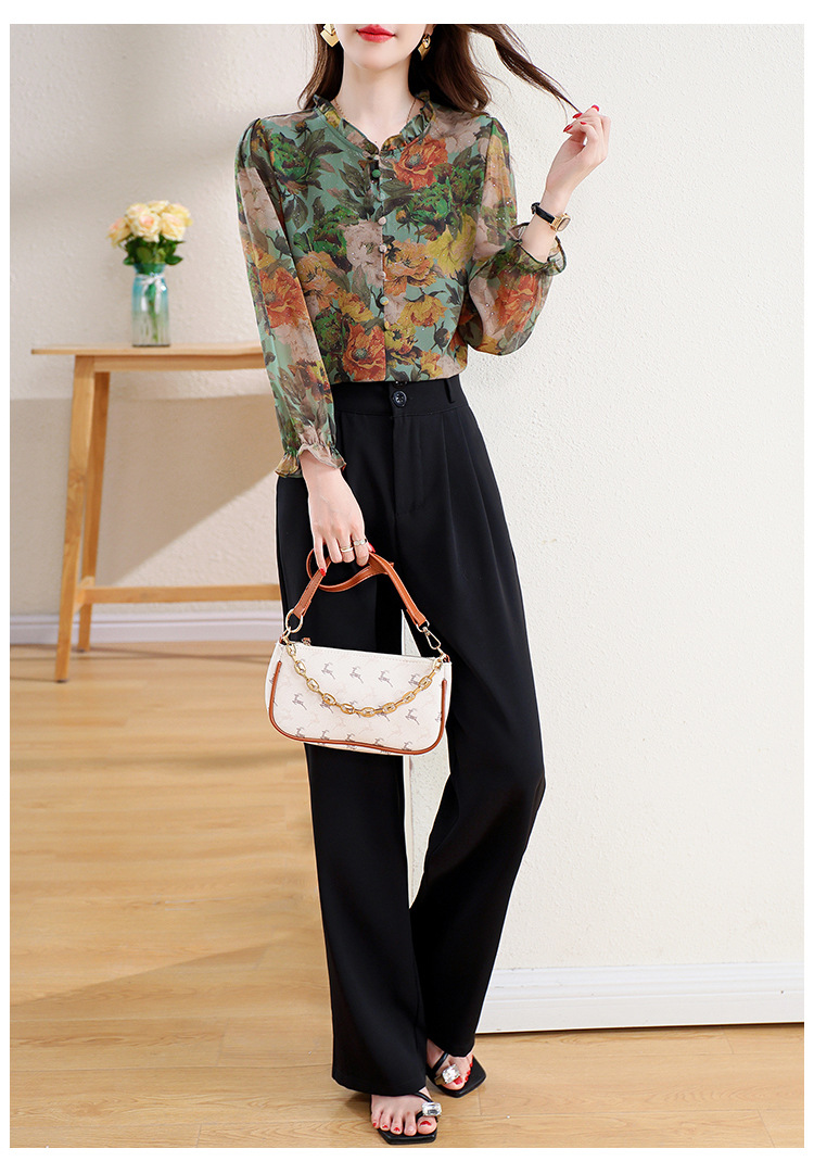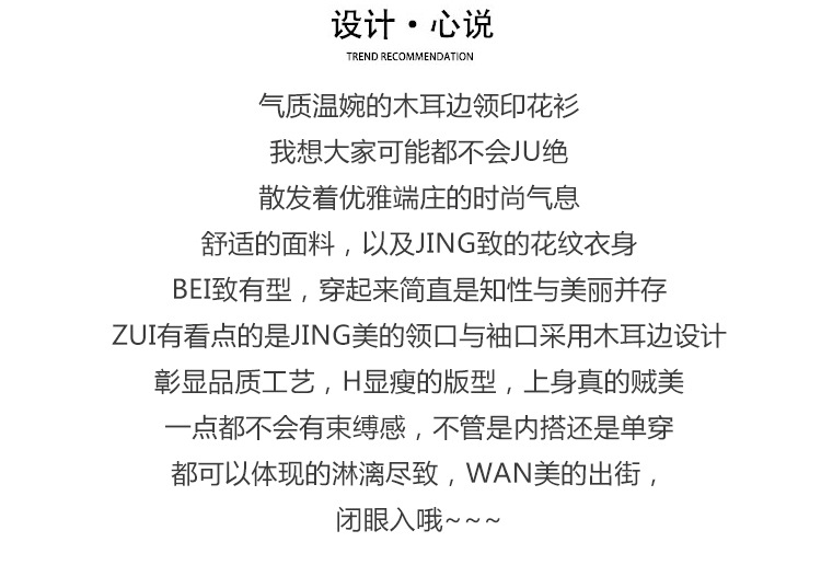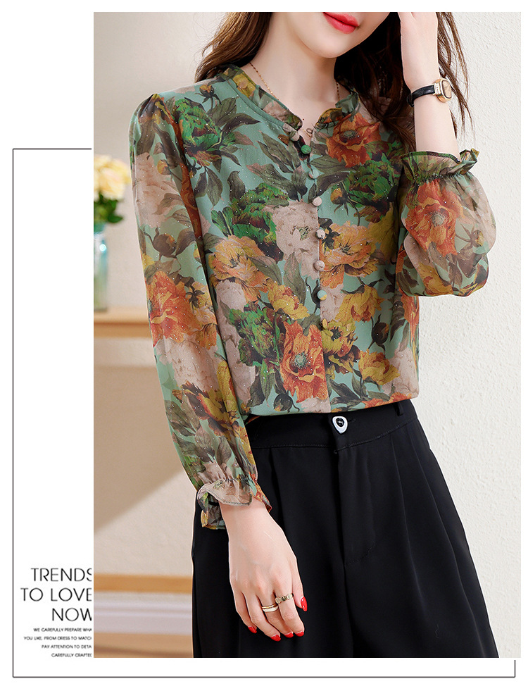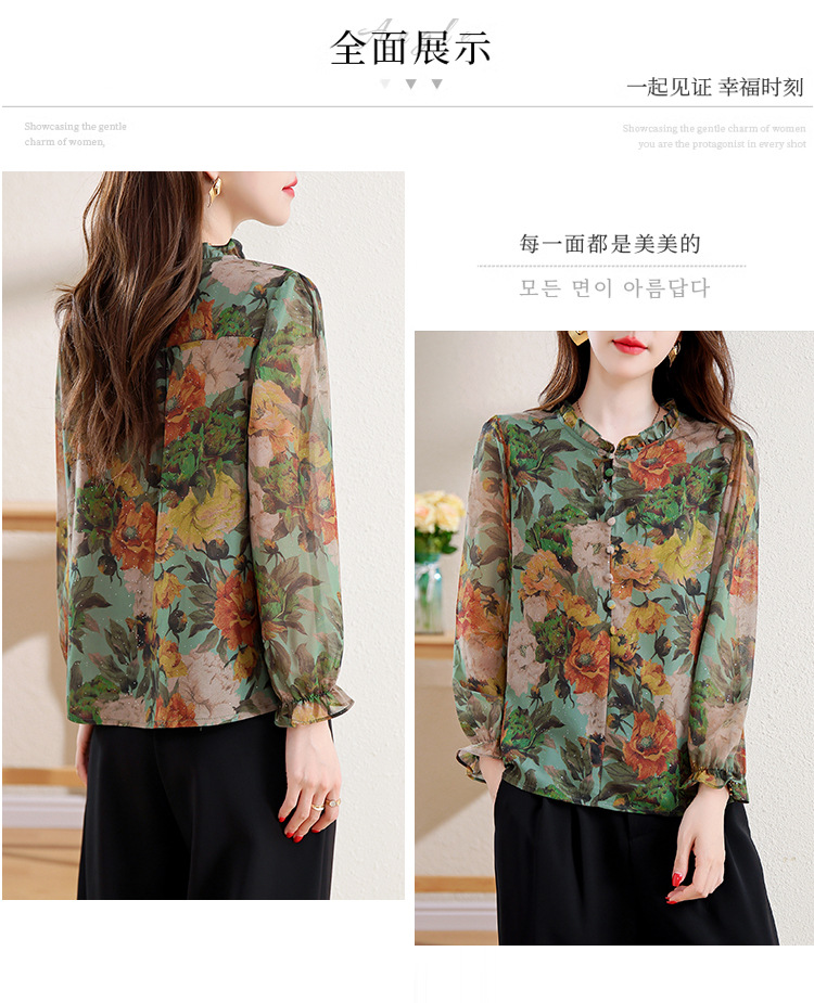 KQL2025秋季新款法式时尚木耳领喇叭袖显瘦简约桑花皱印花上衣女