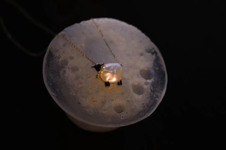 把这枚圆鼓鼓云朵般的异形白珍珠当作绵羊的胖身体,