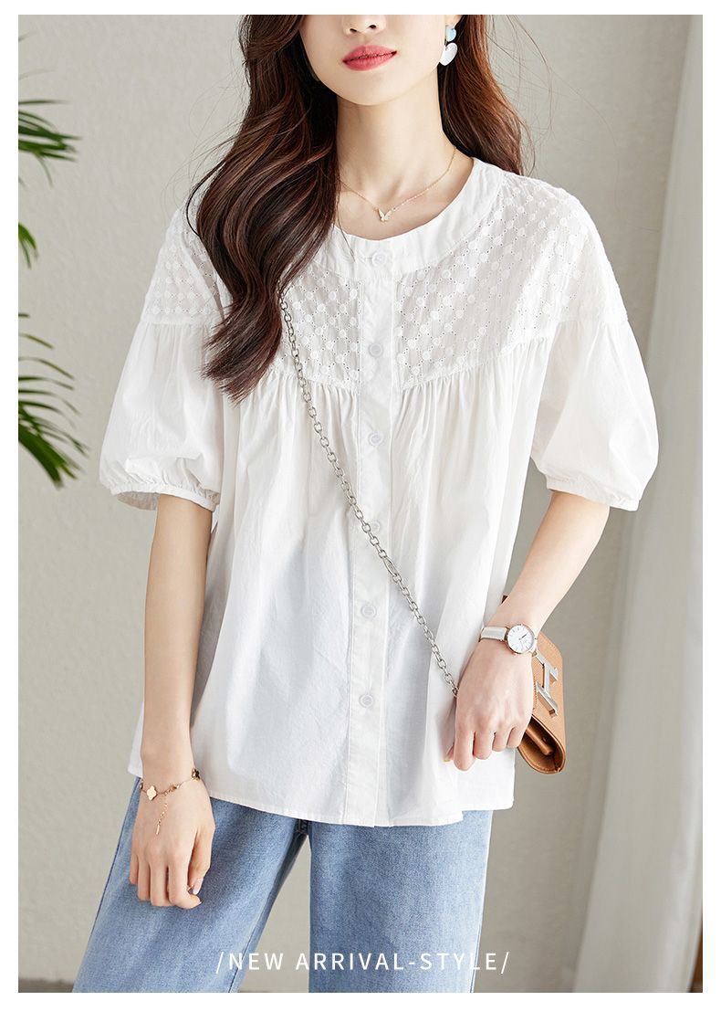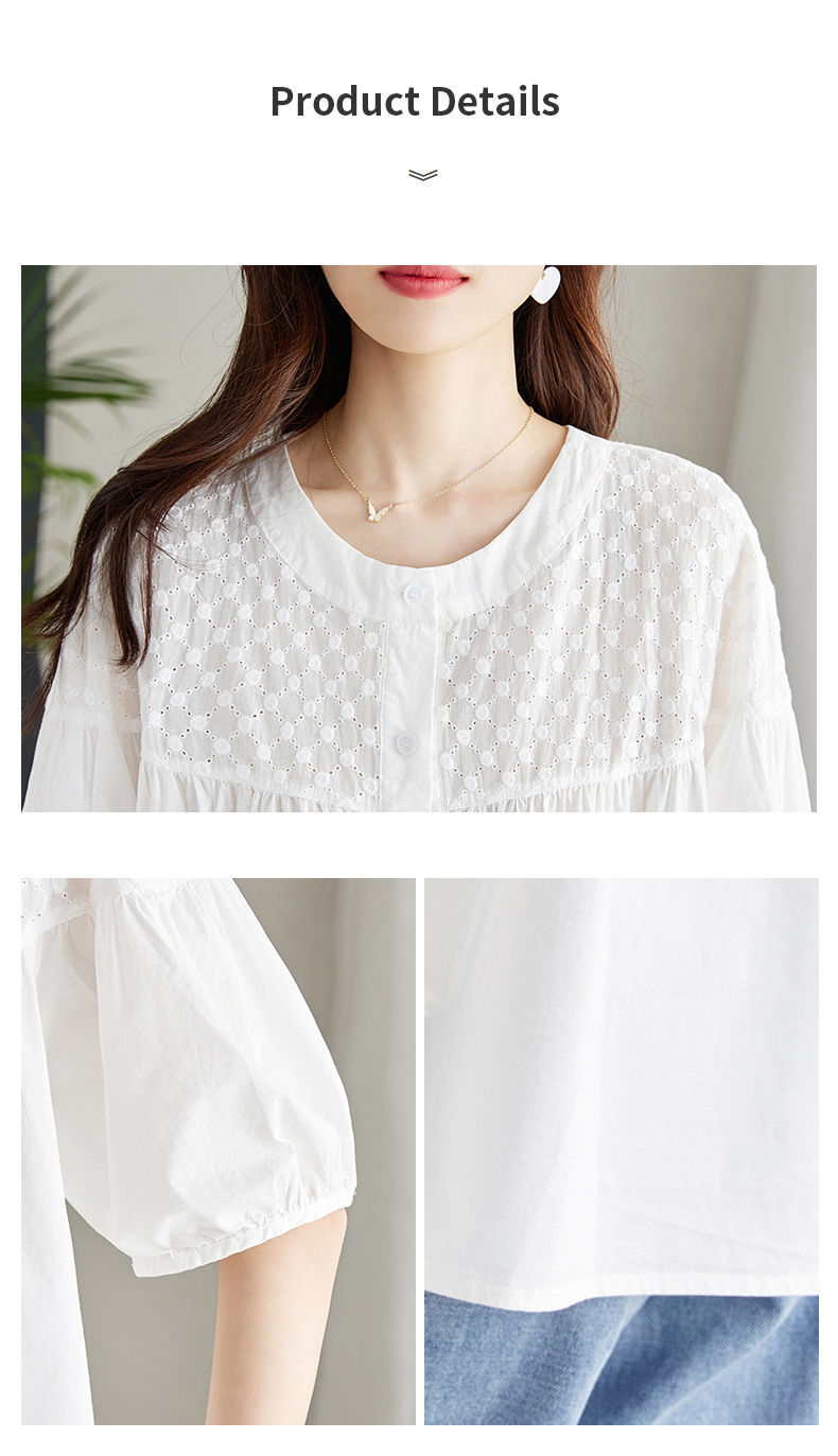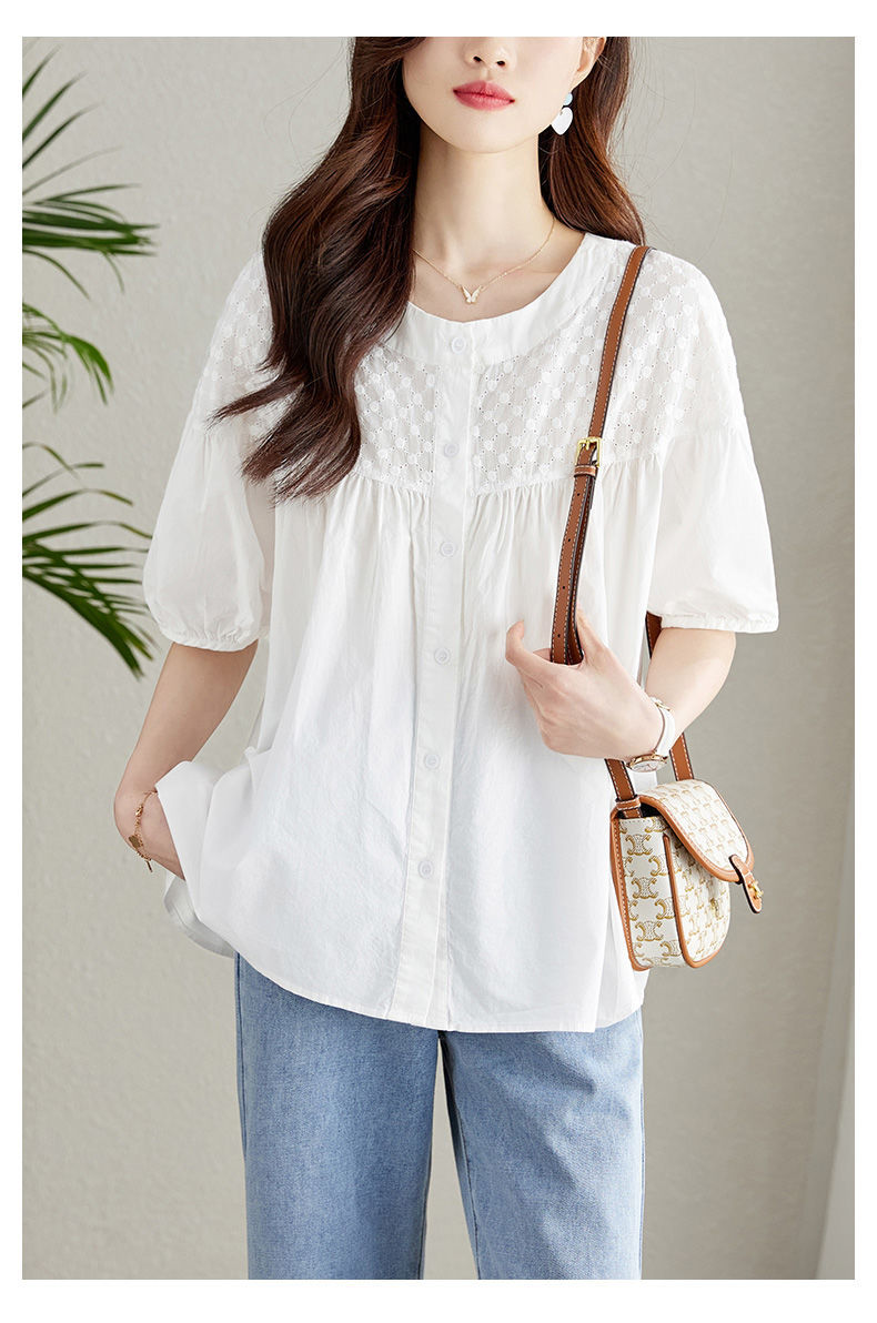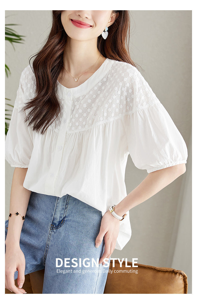百媚生 100%棉圆领镂空绣花衬衫24004