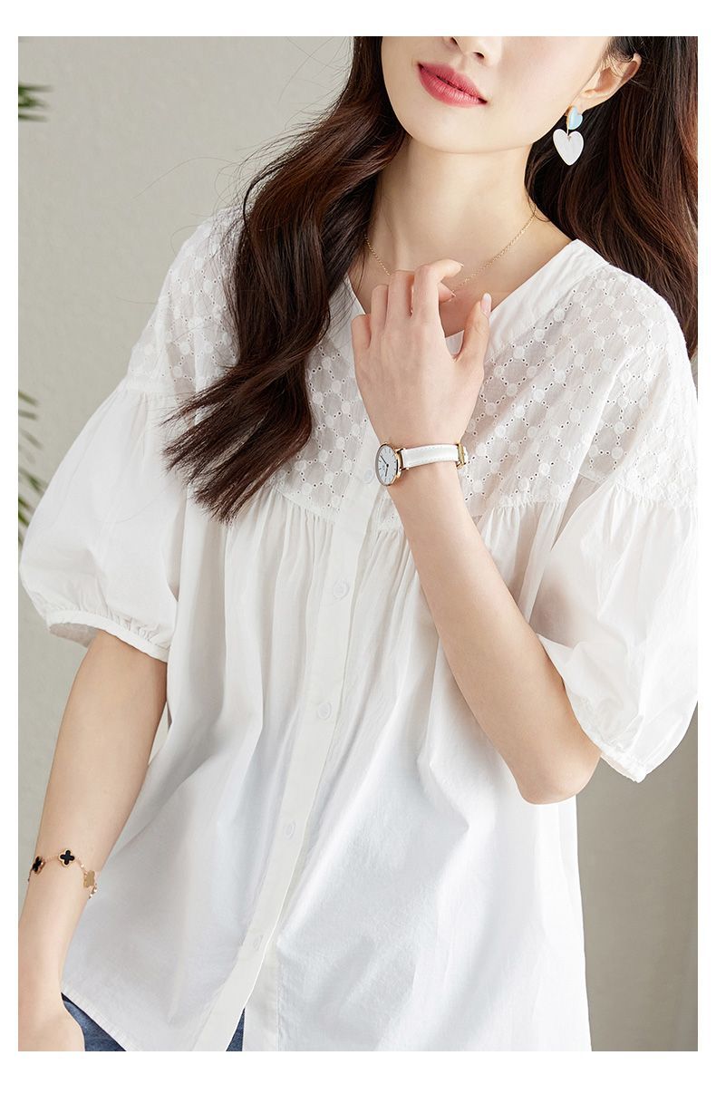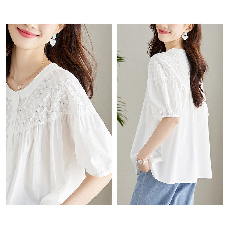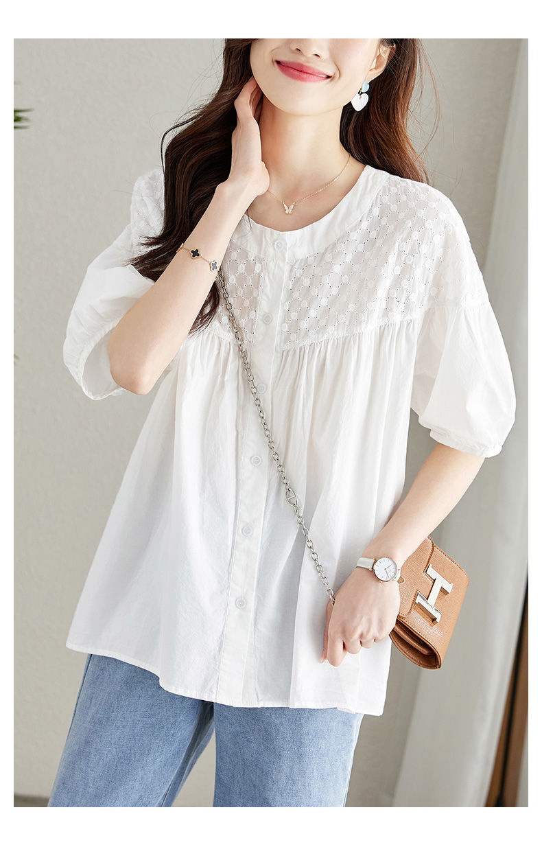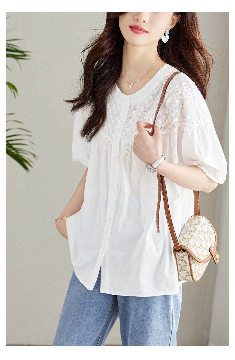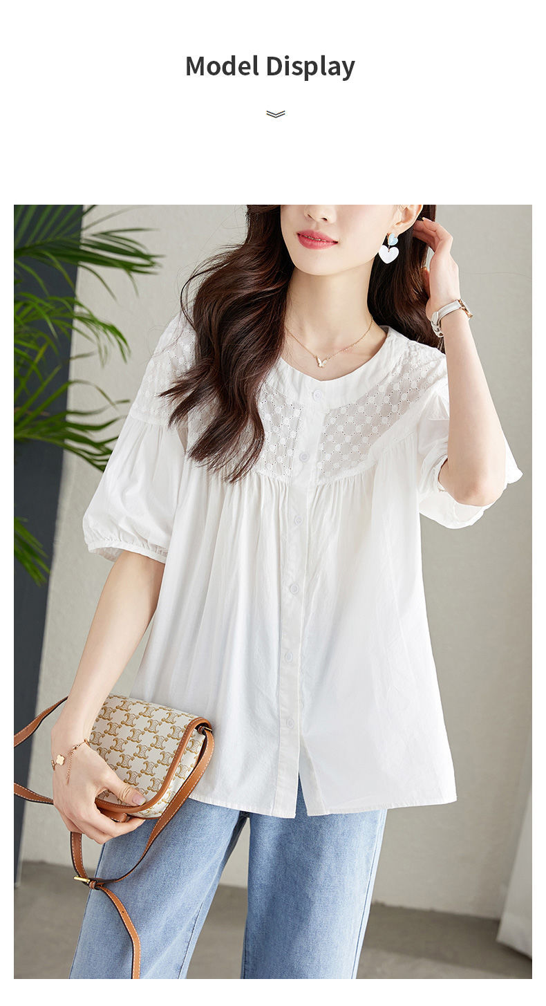 百媚生 100%棉圆领镂空绣花衬衫24004