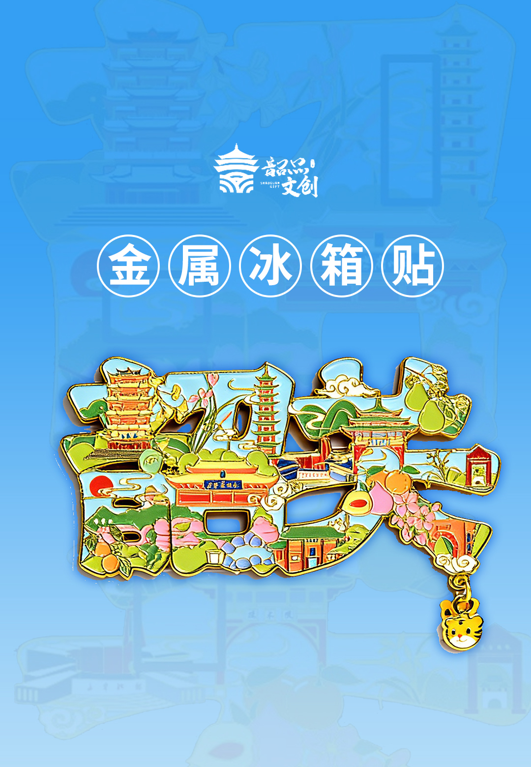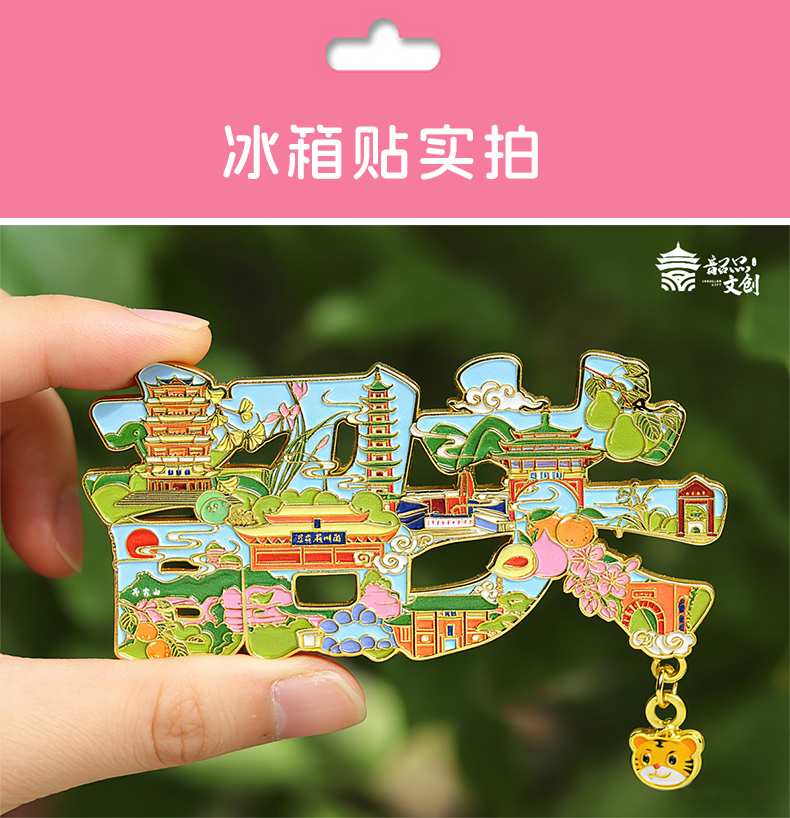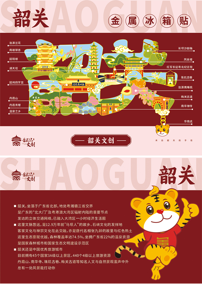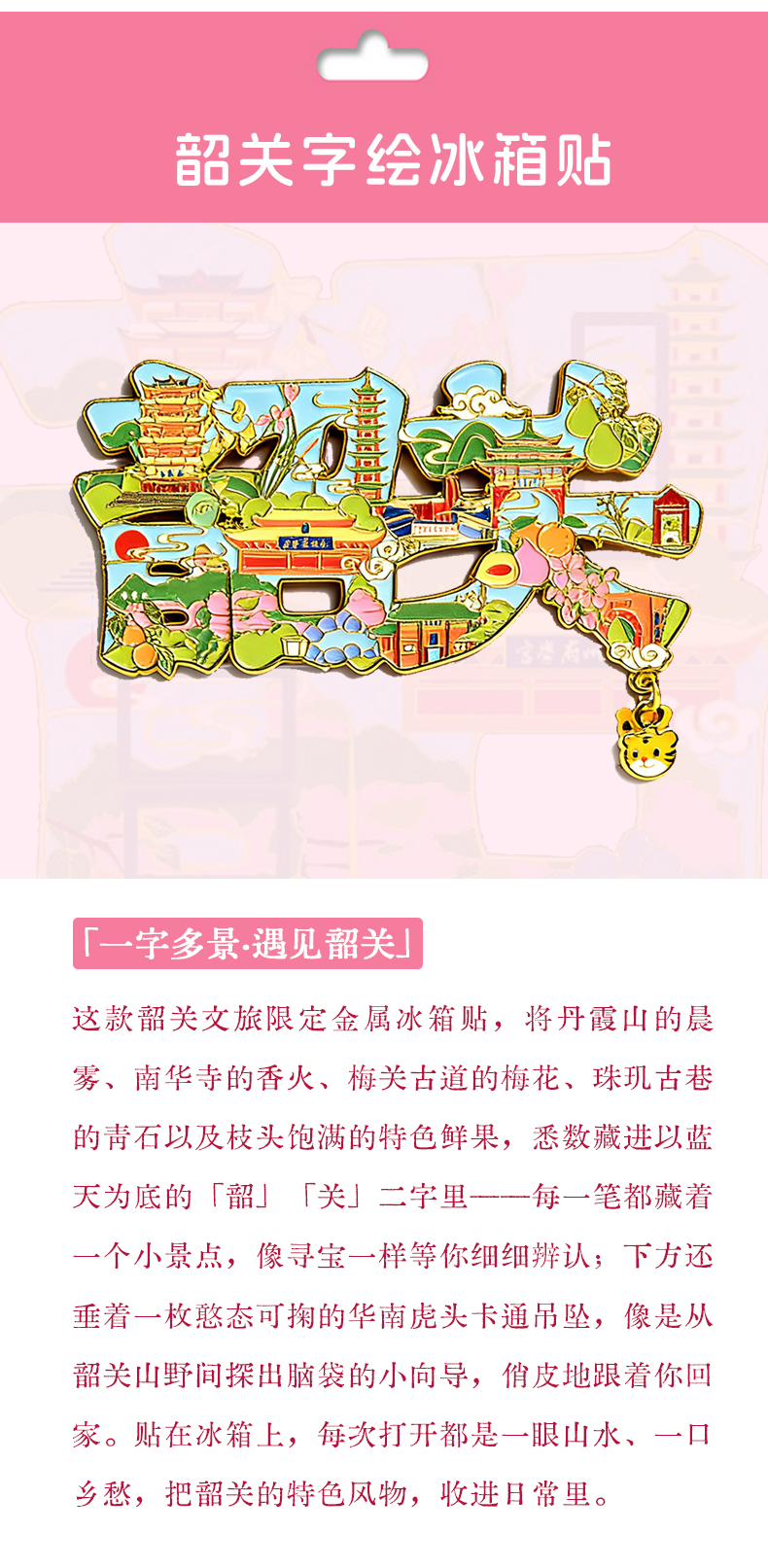 这枚冰箱贴,不是简单的风景复刻,而是用国潮插画+金属工艺,把韶关的山川风物、人文地标,全部装进了“韶关”两个大字里: