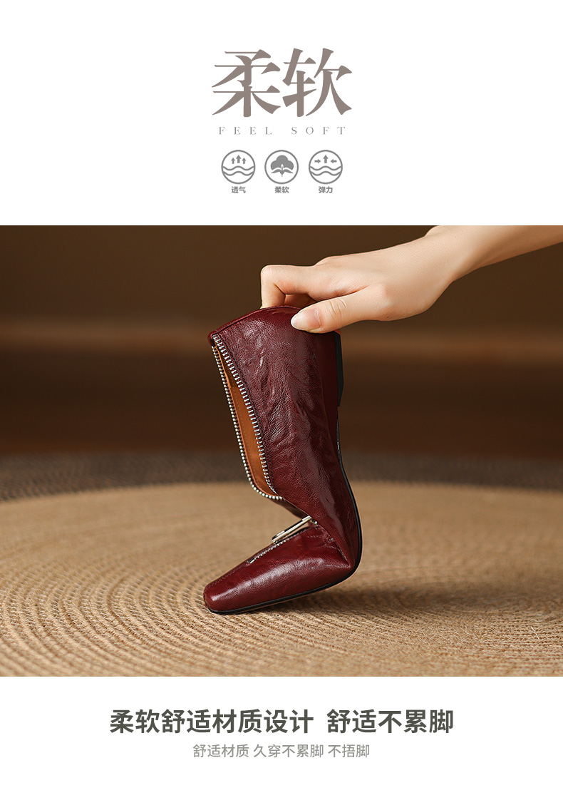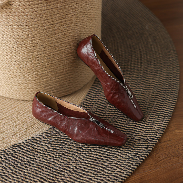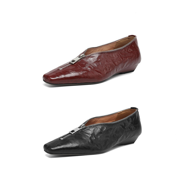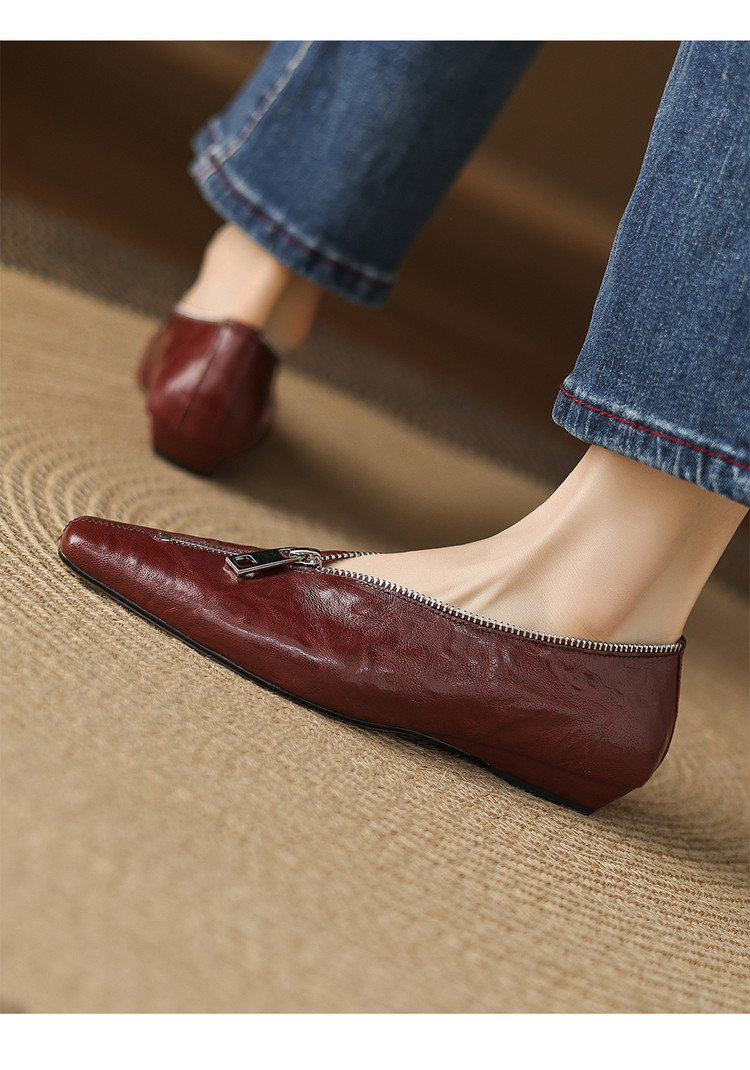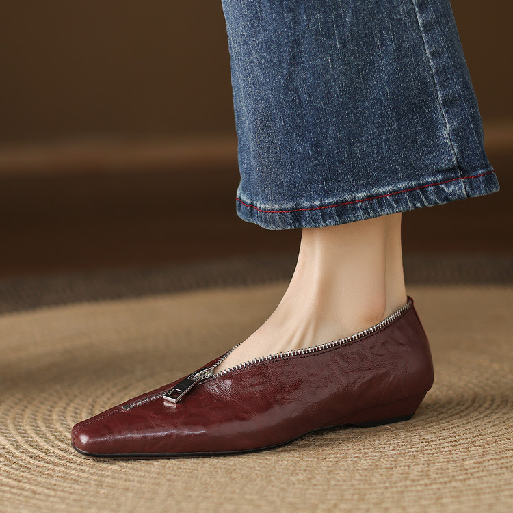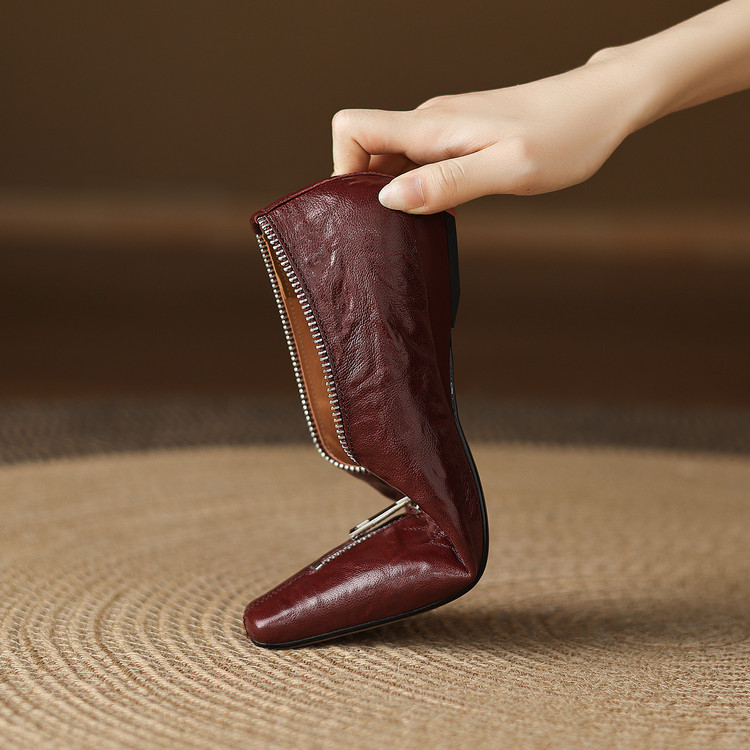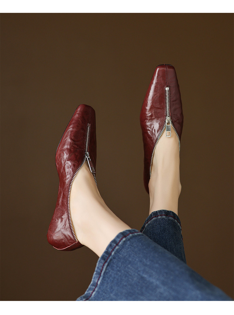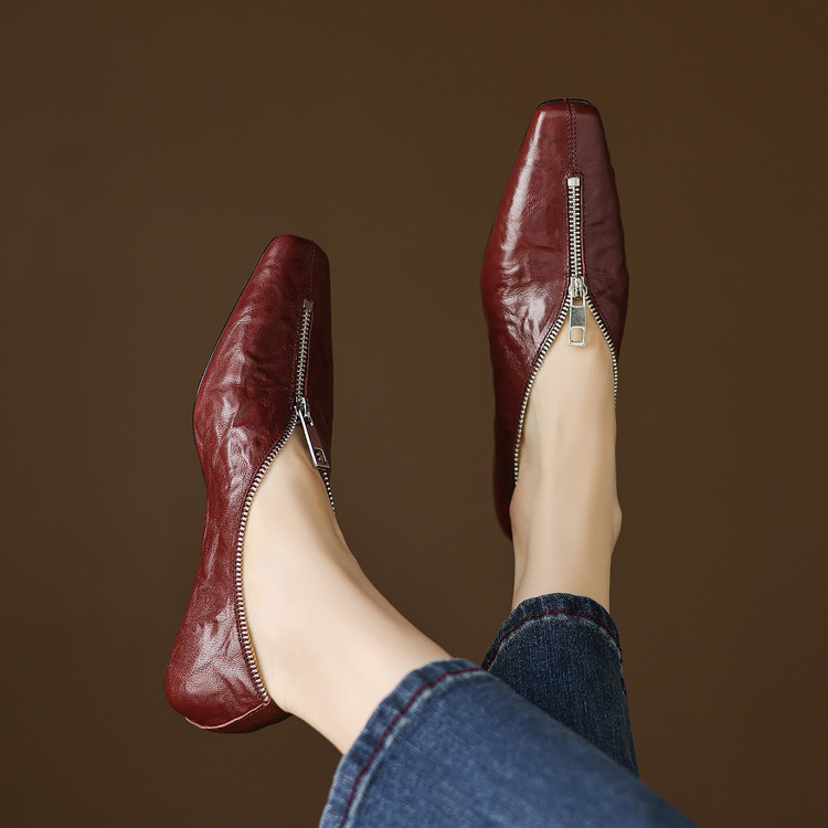 【预售5天】复古酒红色羊皮坡跟单鞋新款小众V口前拉链方头低跟女鞋LD&7432