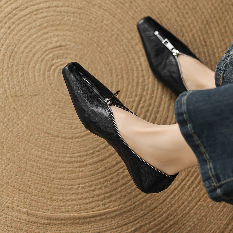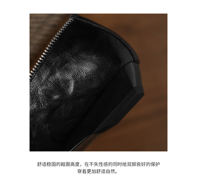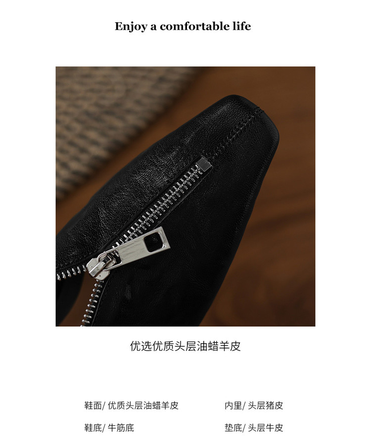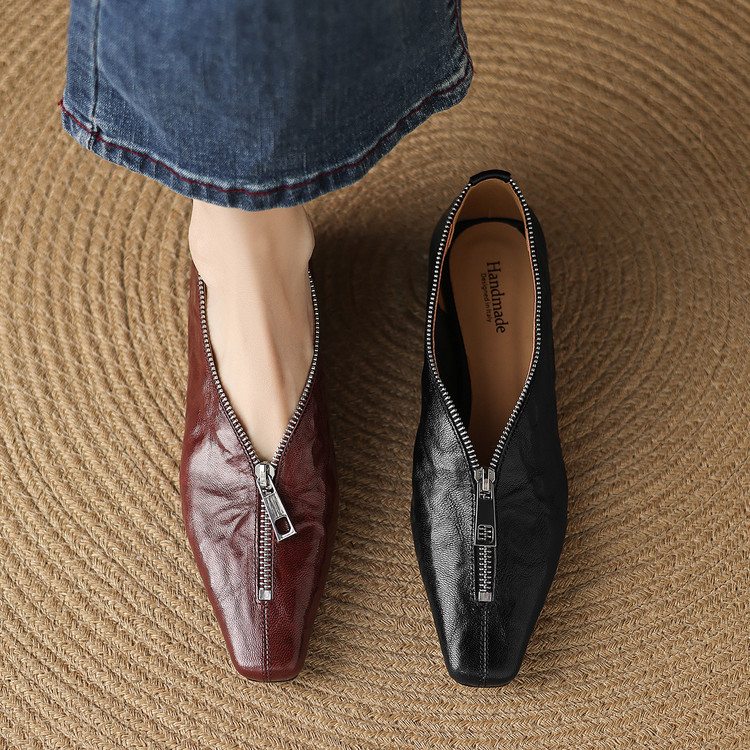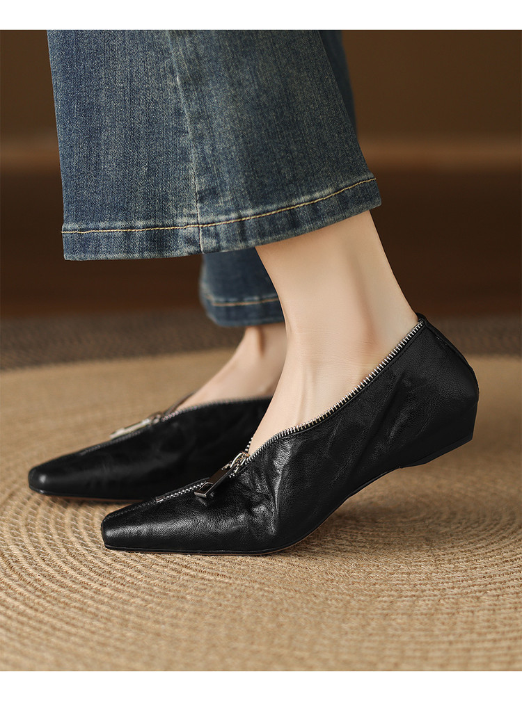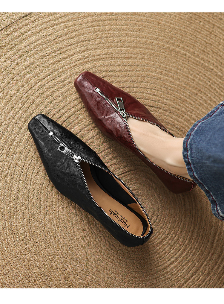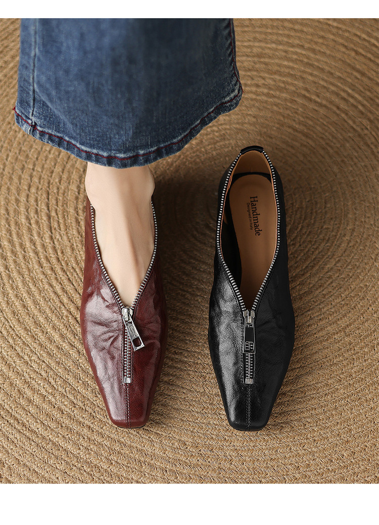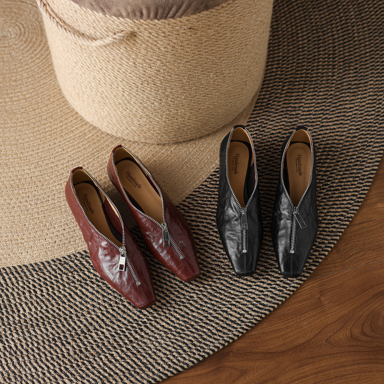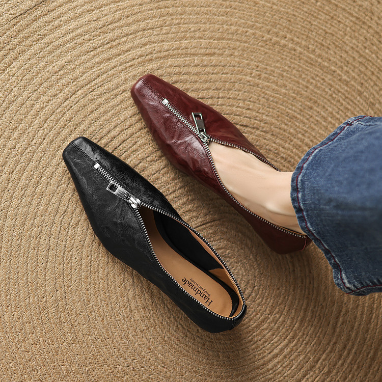 【预售5天】复古酒红色羊皮坡跟单鞋新款小众V口前拉链方头低跟女鞋LD&7432