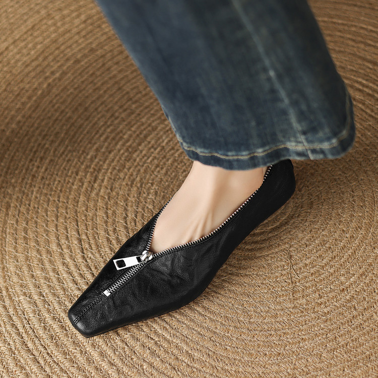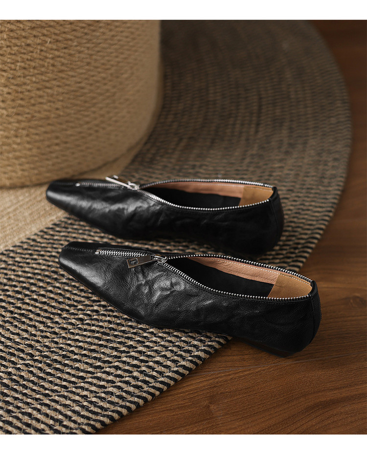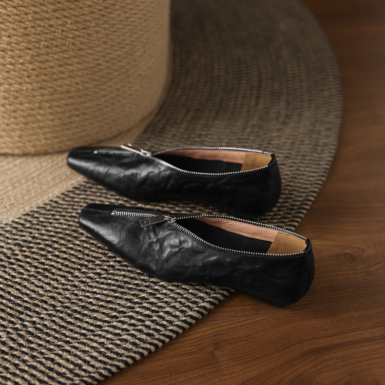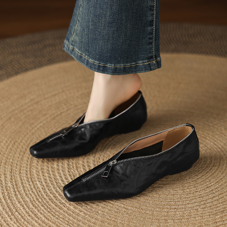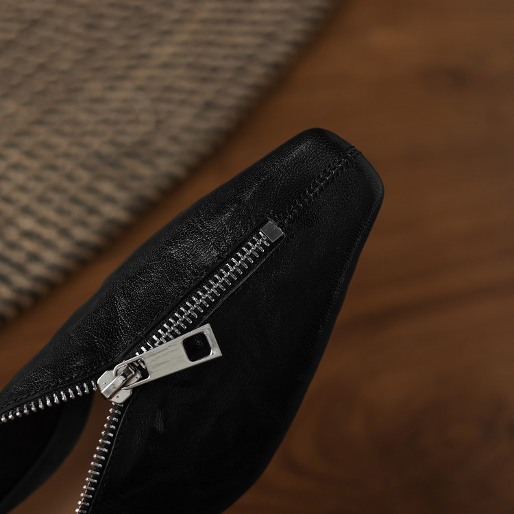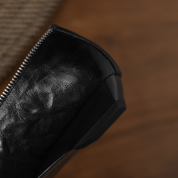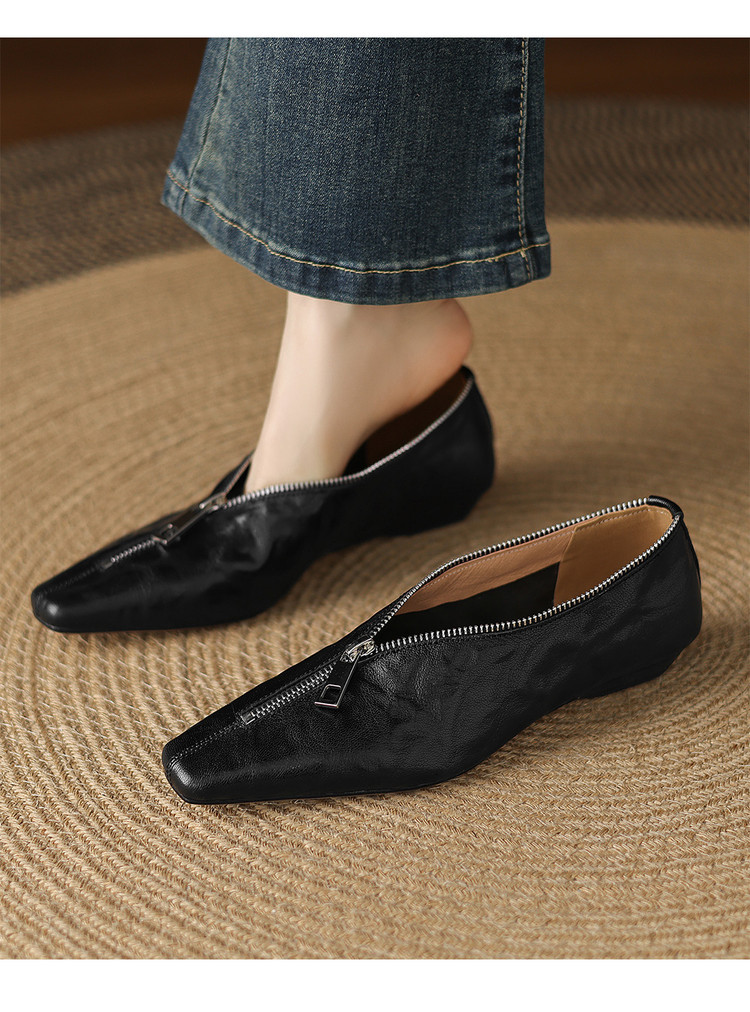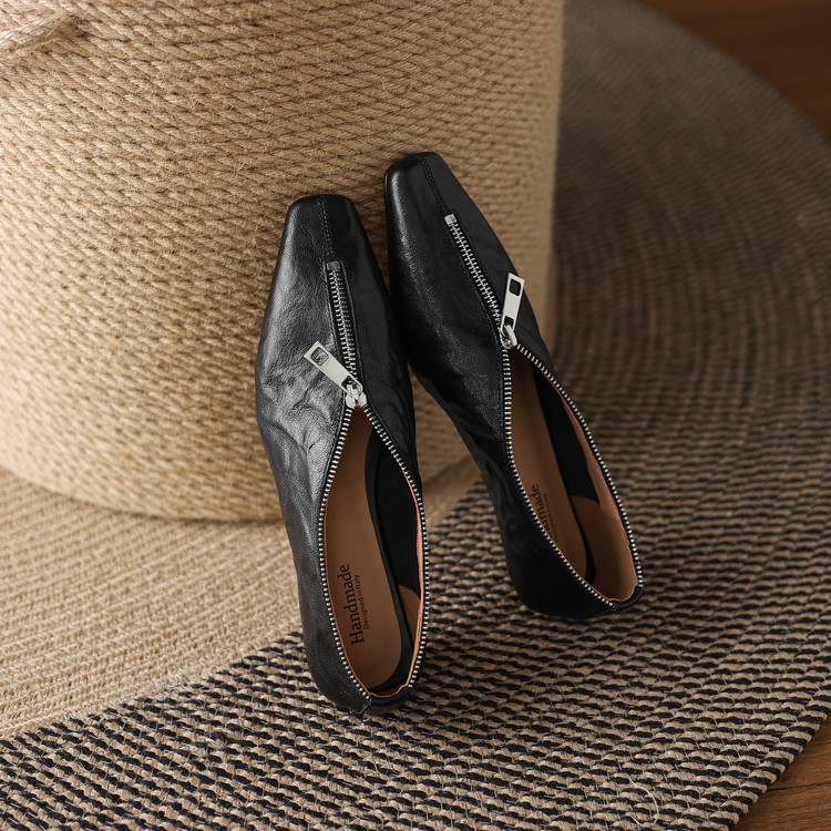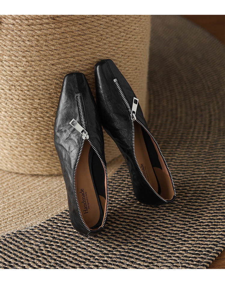 【预售5天】复古酒红色羊皮坡跟单鞋新款小众V口前拉链方头低跟女鞋LD&7432
