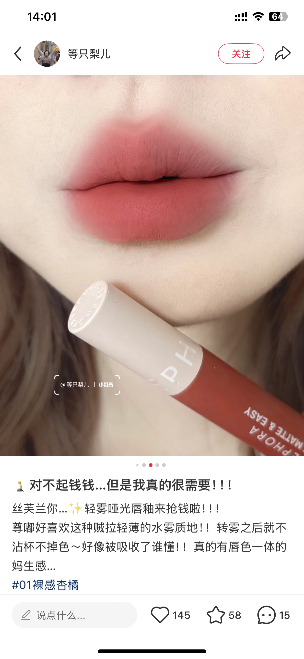 护肤品只卖zehng品‼️ 丝*兰轻雾唇釉,你们要的不沾杯唇釉,中标到26.3!实际五年可用到28.3,专柜的货!专柜119,这个是真好看!色号07!好好看,不同于一般唇釉,他这个很轻薄,颜色不浓郁!水转雾质地,跟普通唇釉不一样哦,颜色不浓郁,且非常不掉色,更持久!不挑皮的低饱和色!原价119,!变哑光后完全不沾杯不粘!没点存在感的!舒服到飞起!7号色!这个不浓郁,实际上嘴没那么红,犹如自己唇色散发出来的气血红!水雾质地!比唇釉更自然!⚠️48小时截单‼️