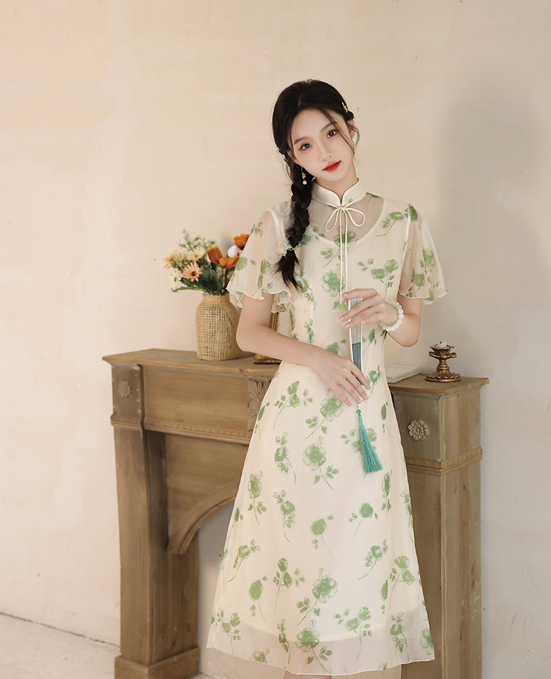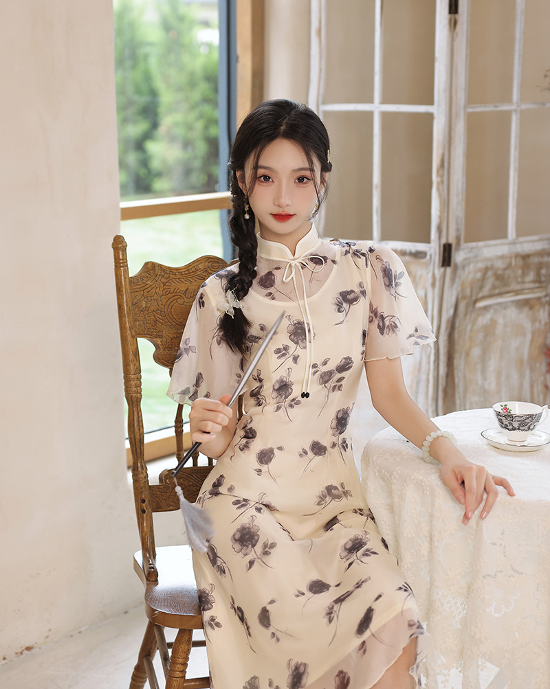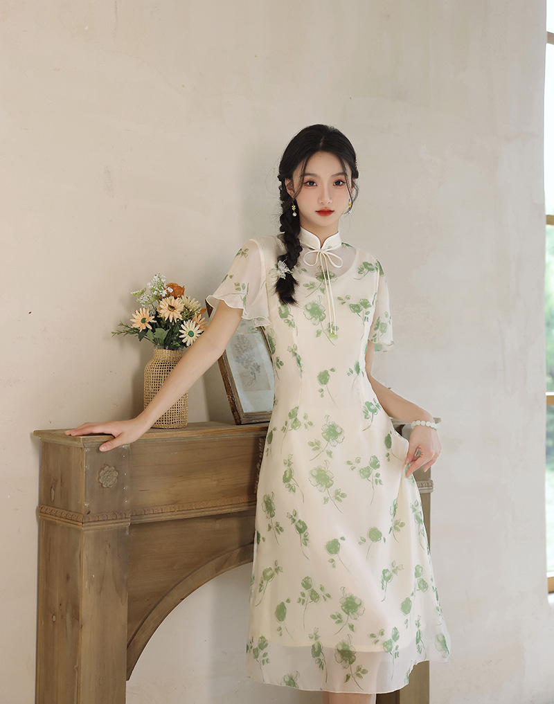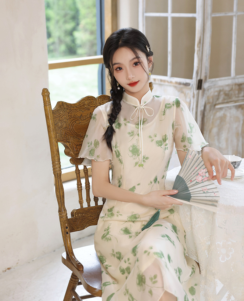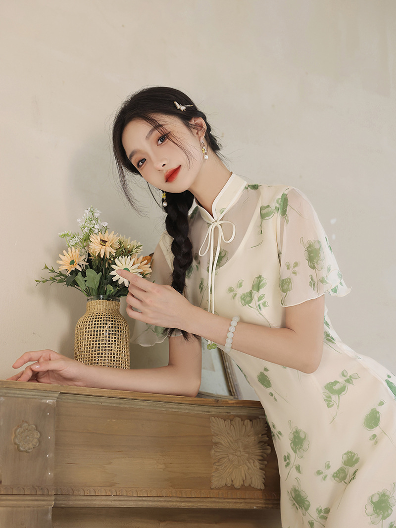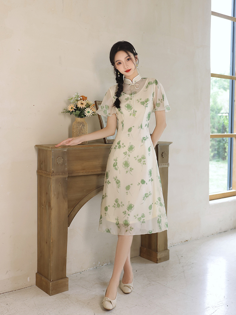 夏季新款,日常出游民国风文艺轻薄遮肉连衣裙少女款女改良旗袍XL-23201