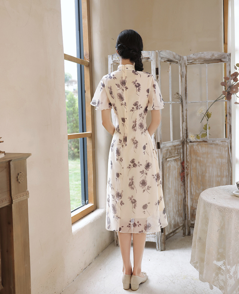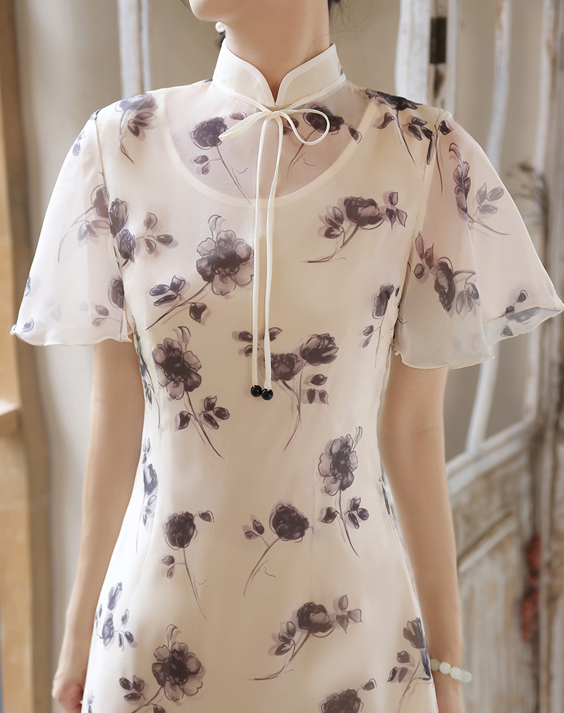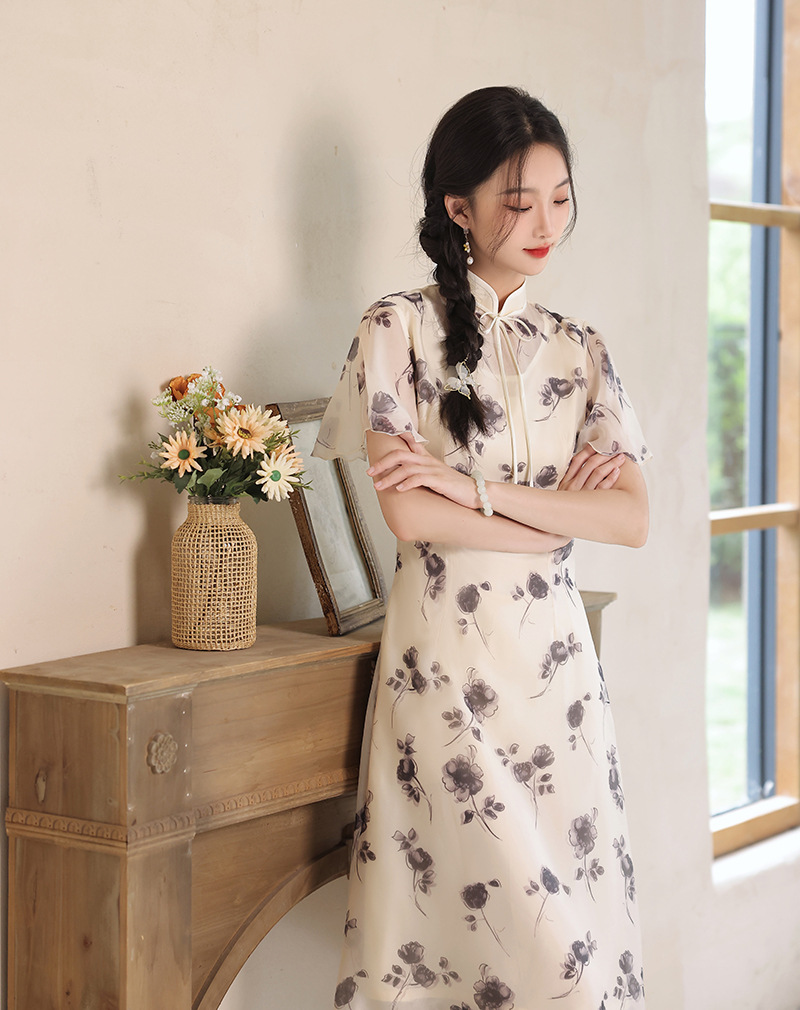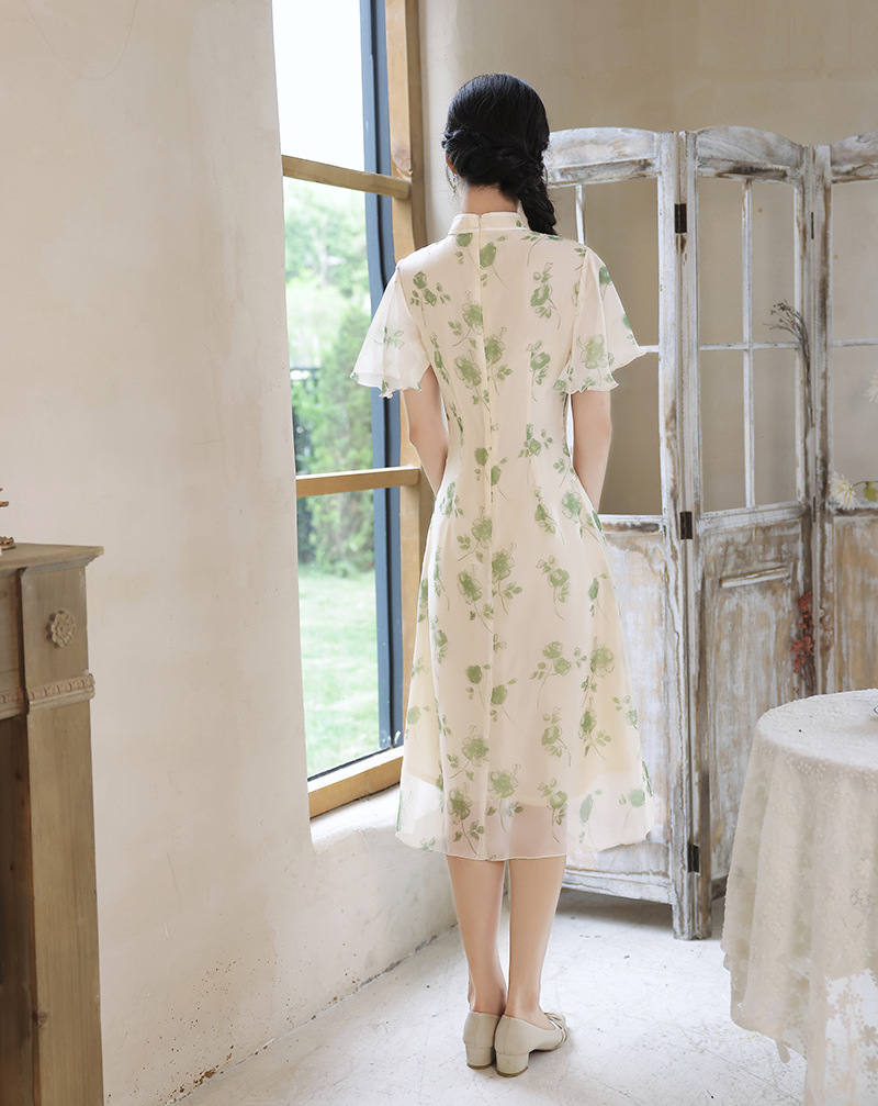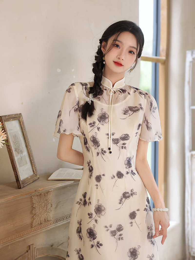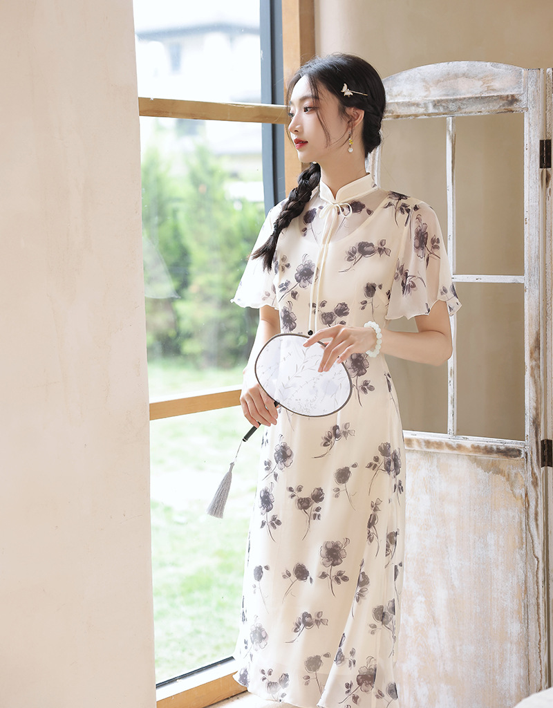 夏季新款,日常出游民国风文艺轻薄遮肉连衣裙少女款女改良旗袍XL-23201