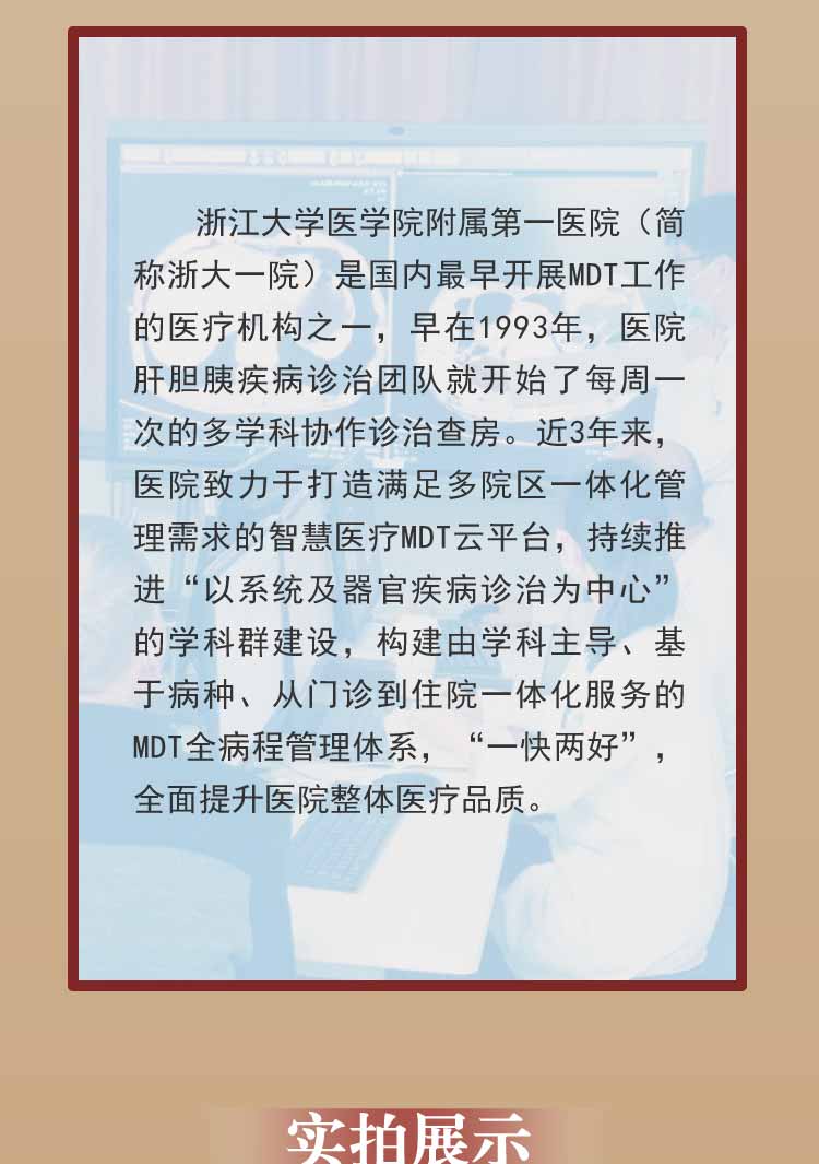 浙江大学医学院附属第一医院(简称浙大一院)是国内最早开展MDT工作的医疗机构之一,早在1993年,医院肝胆胰疾病诊治团队就开始了每周一次的多学科协作诊治查房。近3年来,医院致力于打造满足多院区一体化管理需求的智慧医疗MDT云平台,持续推进“以系统及器官疾病诊治为中心”的学科群建设,构建由学科主导、基于病种、从门诊到住院一体化服务的MDT全病程管理体系,“一快两好”,全面提升医院整体医疗品质。