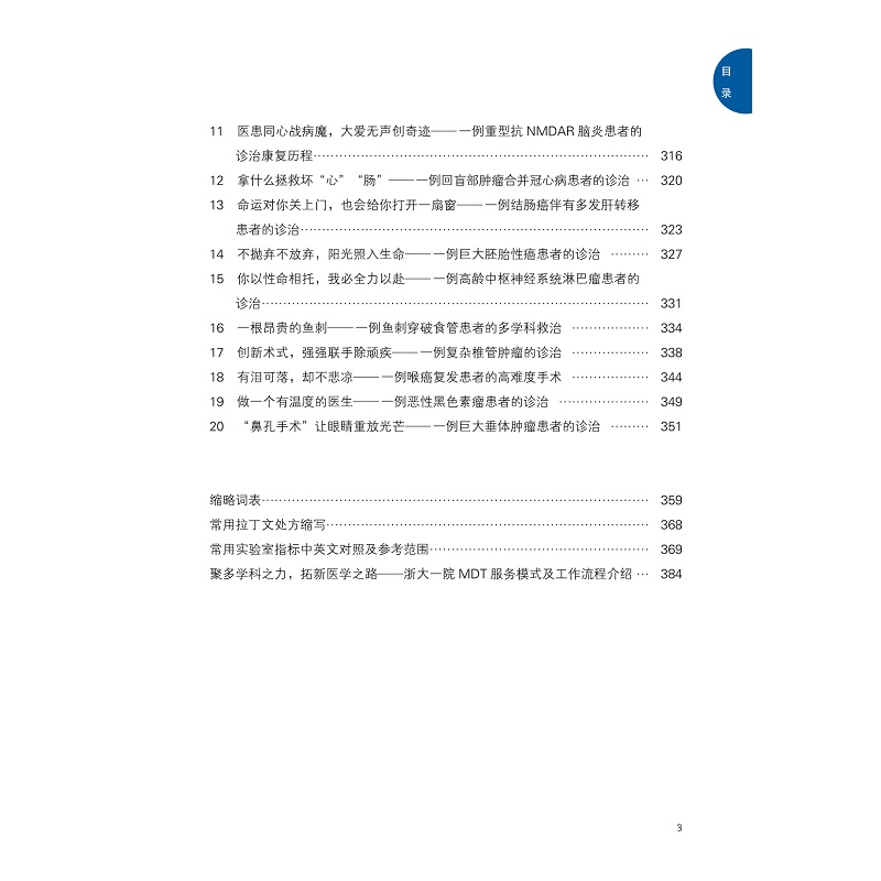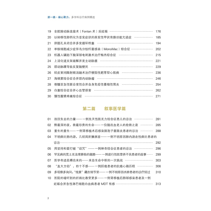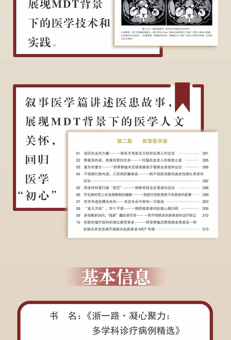 本书汇集了浙大一院近年来的50个MDT病例,由近40个学科的150余位专家参与编写。按编写方式和展现目的不同,全书分成两大篇。第一篇为专业案例篇,收录的30个病例采用了临床专业案例的编写方式,通过多学科讨论的形式,多层次、多角度地呈现病例的诊治要点,展现MDT背景下的医学技术和实践,目的是总结经验和教训,为今后工作提供借鉴,帮助广大读者从中学到新知识,掌握临床逻辑思维分析方法。第二篇为叙事医学篇,收录的20个病例采用了叙事医学或医患故事的编写方式,展现MDT背景下的医学人文关怀,呼吁在医疗实践的同时关爱患者,更多地关注经受疾病的主体——人,回归到医学的“初心”。