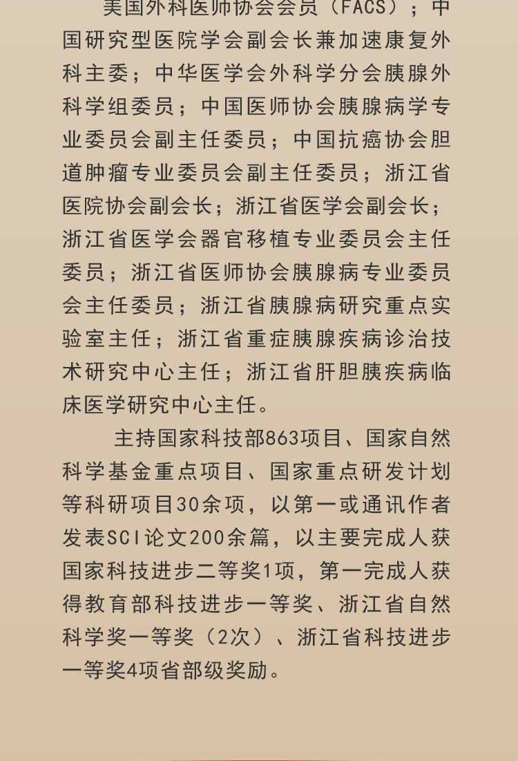 美国外科医师协会会员(FACS);中国研究型医院学会副会长兼加速康复外科主委;中华医学会外科学分会胰腺外科学组委员;中国医师协会胰腺病学专业委员会副主任委员;中国抗癌协会胆道肿瘤专业委员会副主任委员;浙江省医院协会副会长;浙江省医学会副会长;浙江省医学会器官移植专业委员会主任委员;浙江省医师协会胰腺病专业委员会主任委员;浙江省胰腺病研究重点实验室主任;浙江省重症胰腺疾病诊治技术研究中心主任;浙江省肝胆胰疾病临床医学研究中心主任。