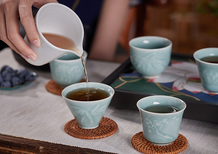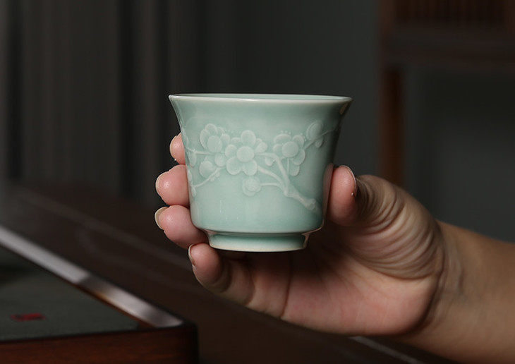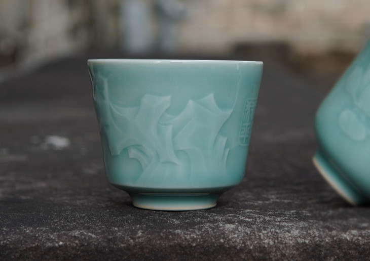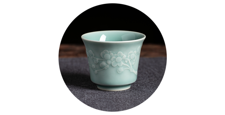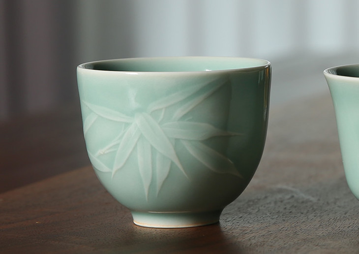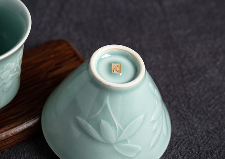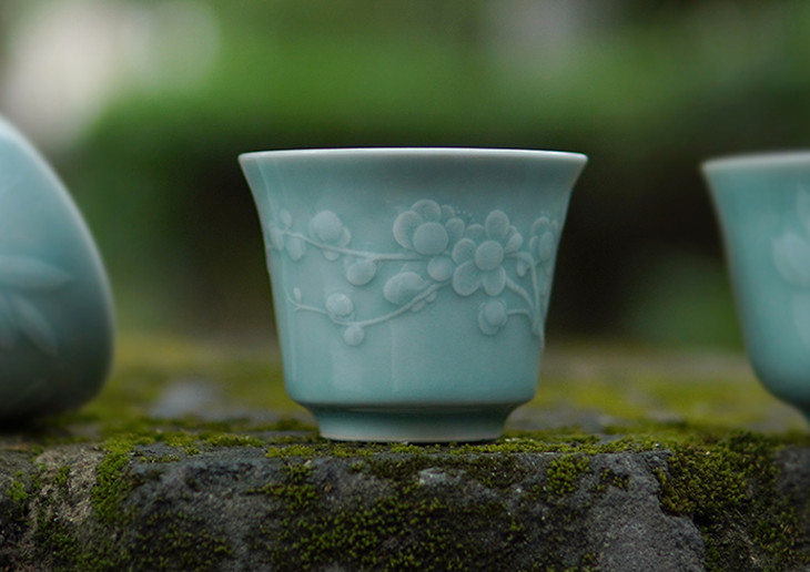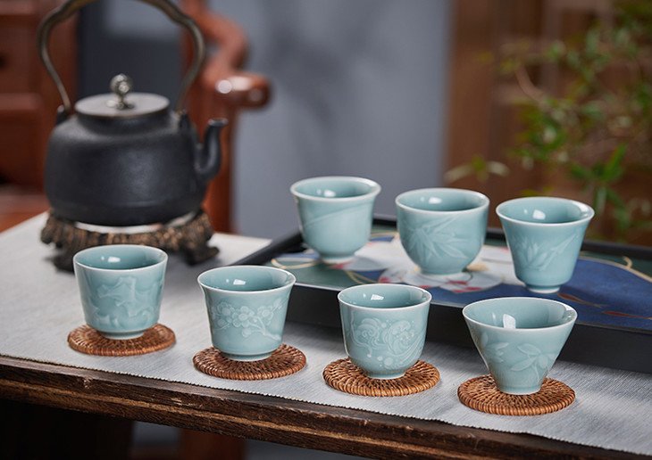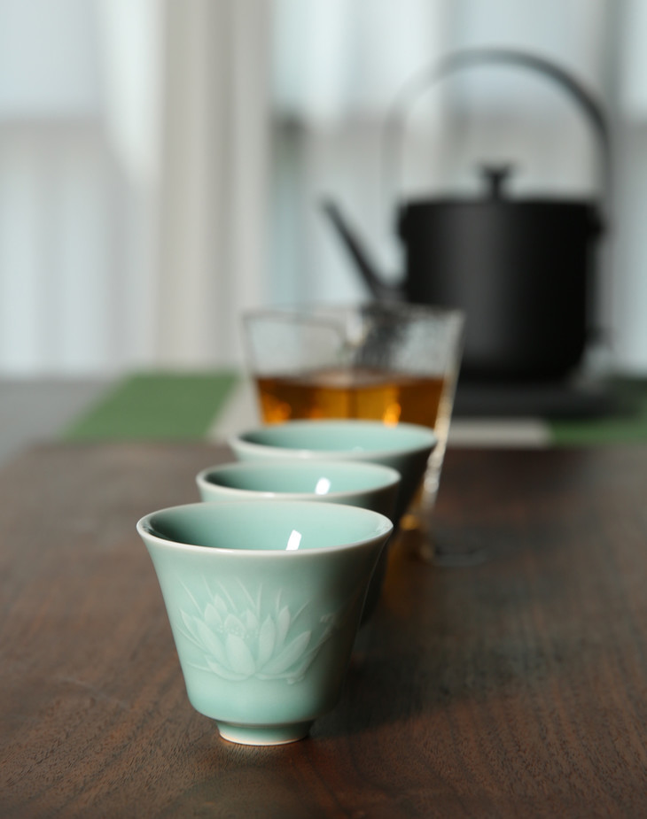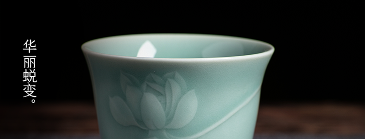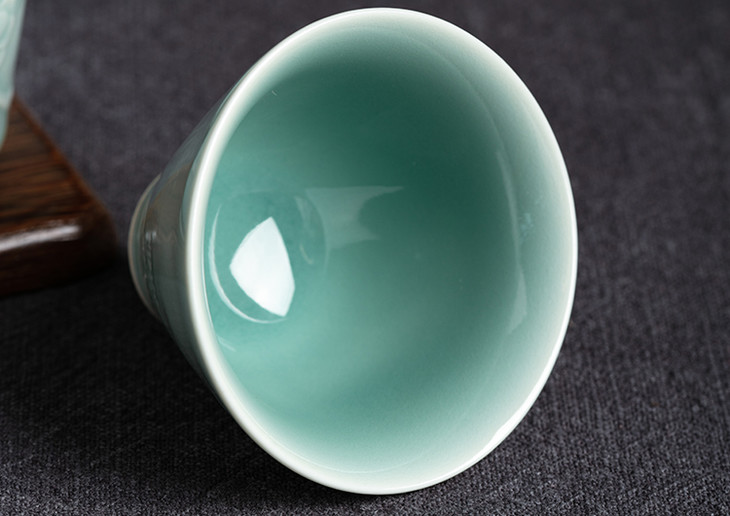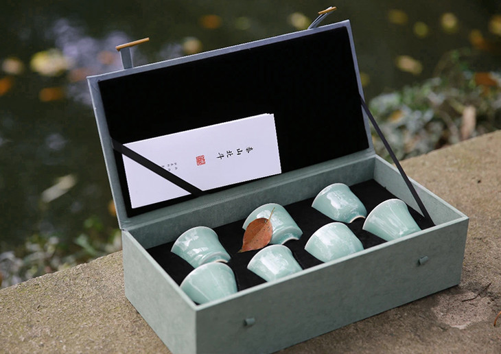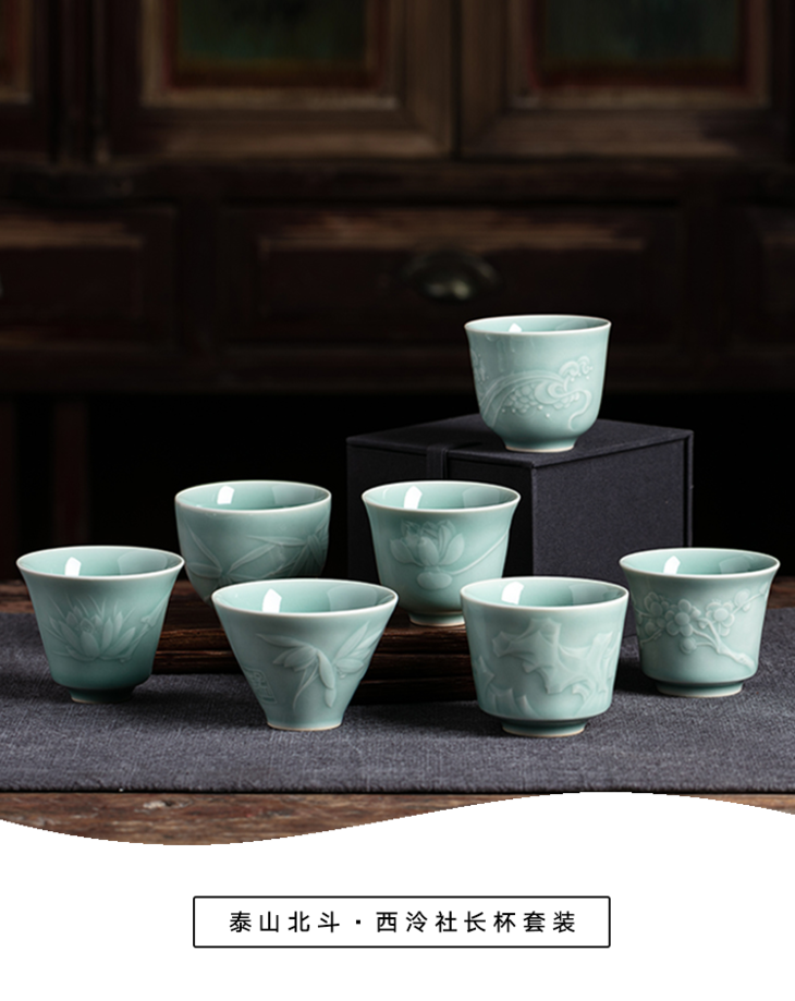 弟窑青瓷,釉色以粉青为上,被誉为民窑之巨擘。这套社长杯便还原粉青色,净、雅、亮、柔。