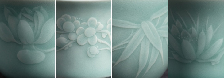 至妙的,是吴老融合7任西泠印社社长的性情、喜好,或以花喻,或以情志,雕成不同的杯壁青花——梅、兰、石、水、莲、竹、昙。