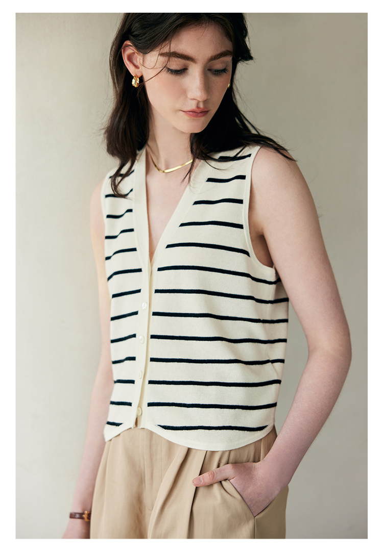 HeyDress条纹针织背心女夏季法式V领撞色设计感百搭通勤无袖上衣