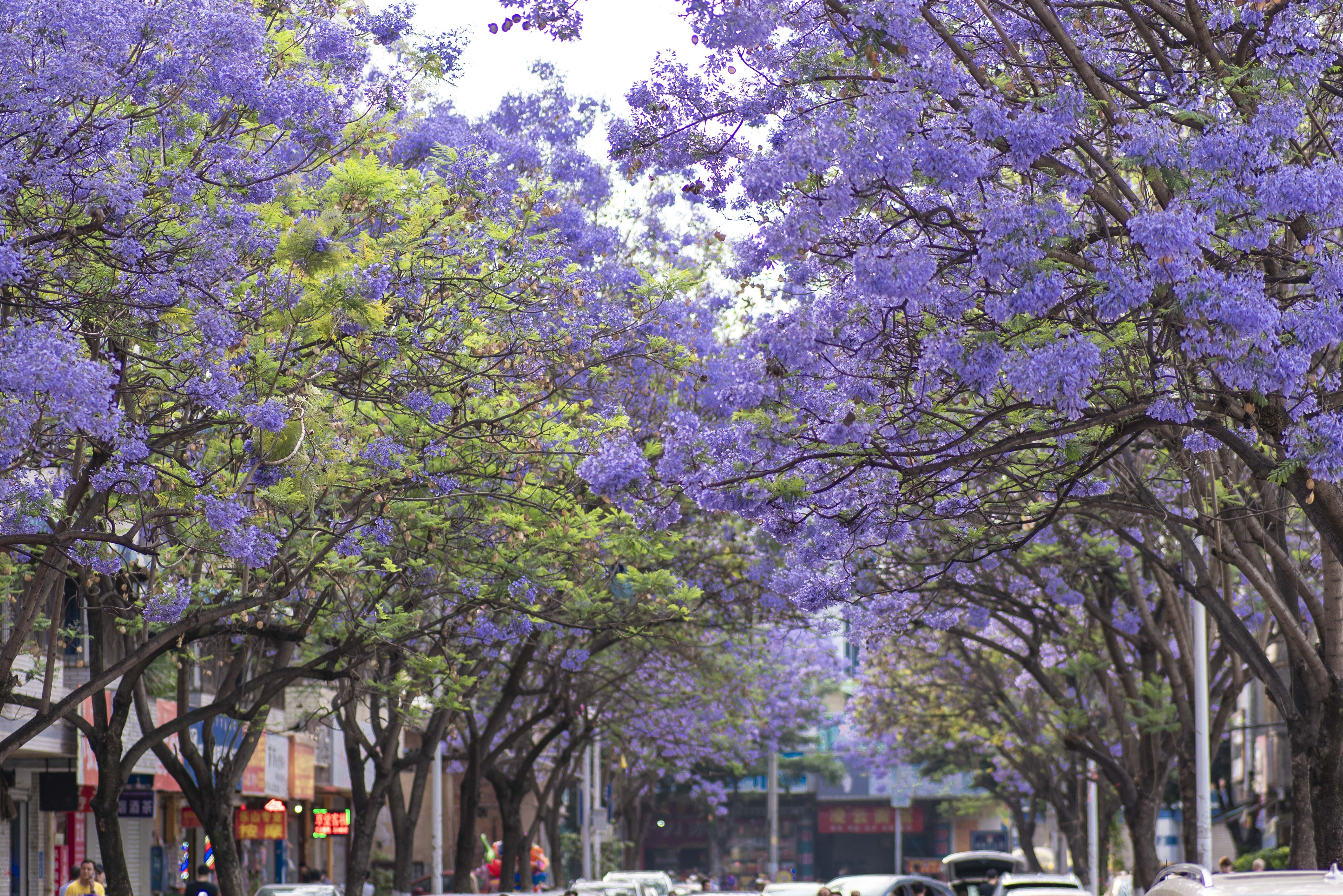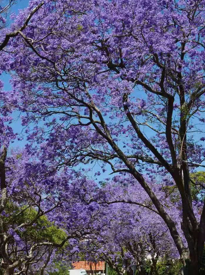 1.蓝花楹(西昌+攀枝花):四月顶流花海,双城蓝紫色花海绵延,钟形花冠绚烂绽放,紫雾漫城,梦幻治愈,是春日人像、街景摄影绝佳题材。