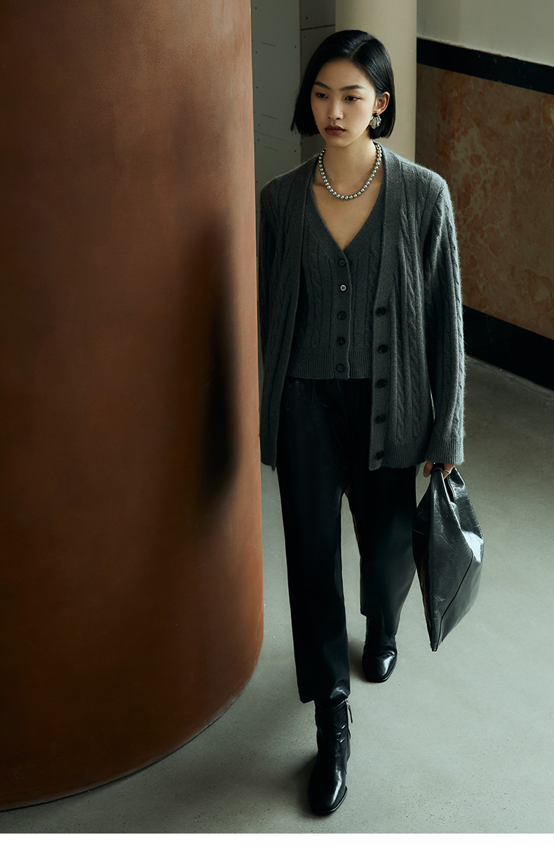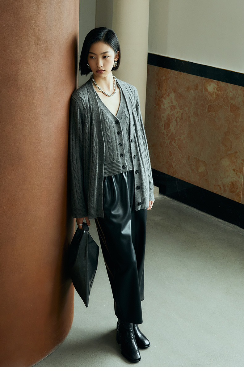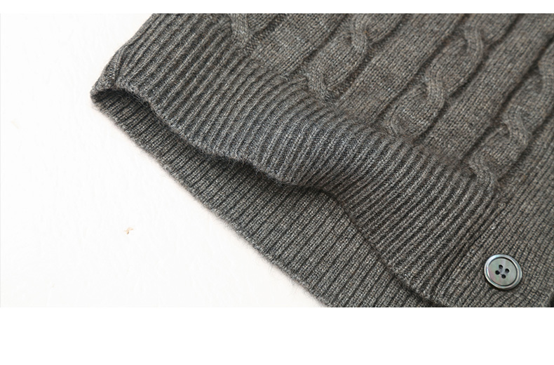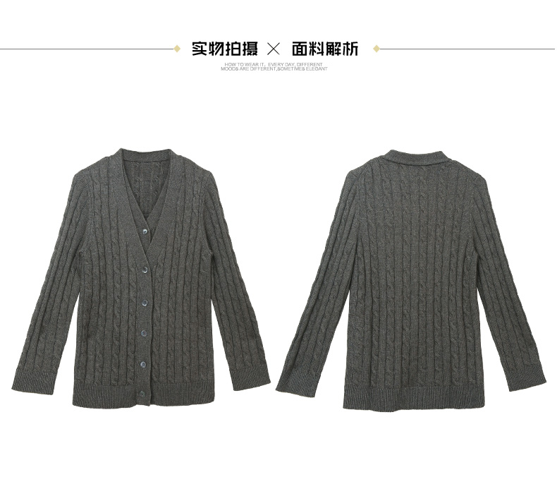 秋冬新款深灰色 V 领针织开衫女复古麻花编织单排扣宽松显瘦毛衣外套
