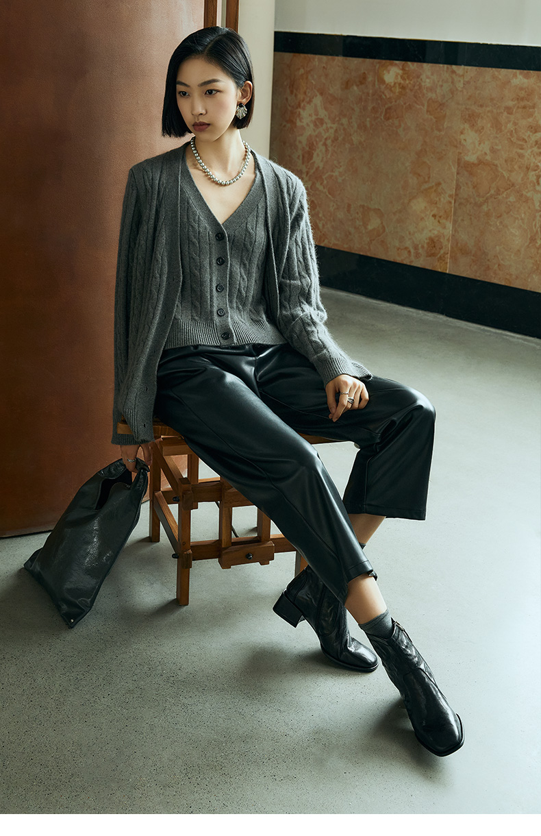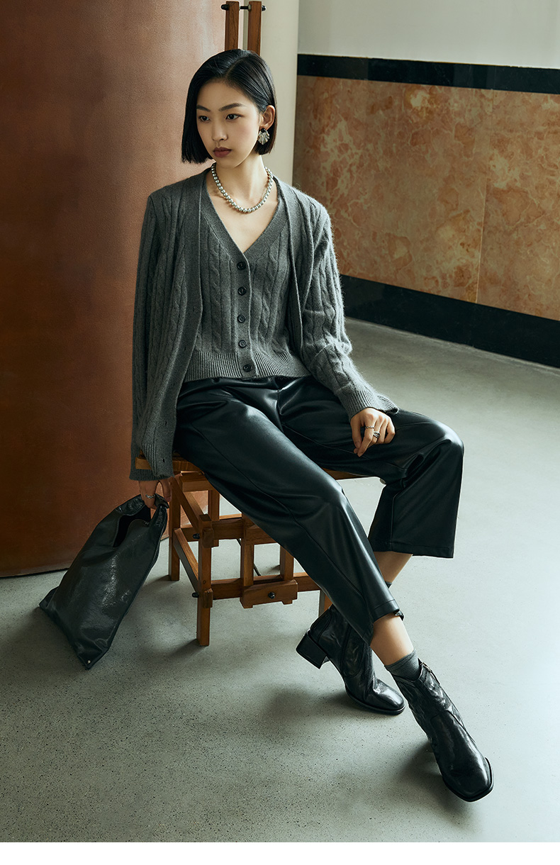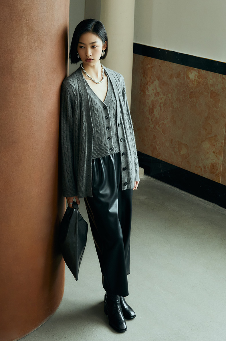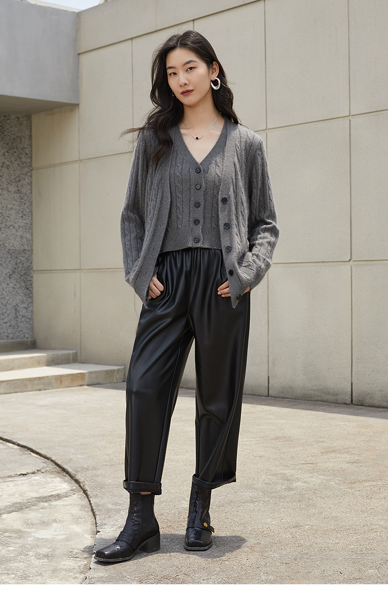 秋冬新款深灰色 V 领针织开衫女复古麻花编织单排扣宽松显瘦毛衣外套