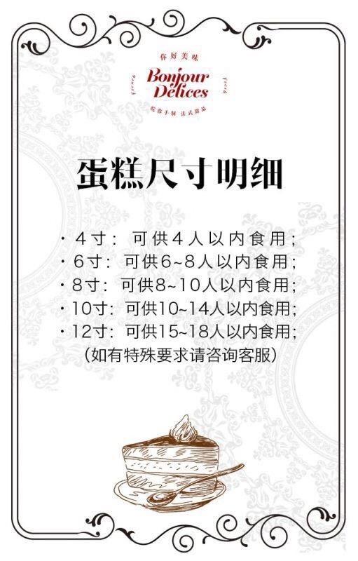 产品保存方式:蛋糕均为派送当天制作,动物奶油蛋糕需要全程冷藏保存,当天食用口感最佳,冷藏48小时内食用完毕。