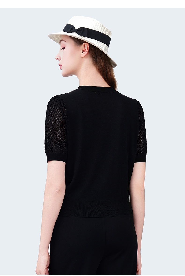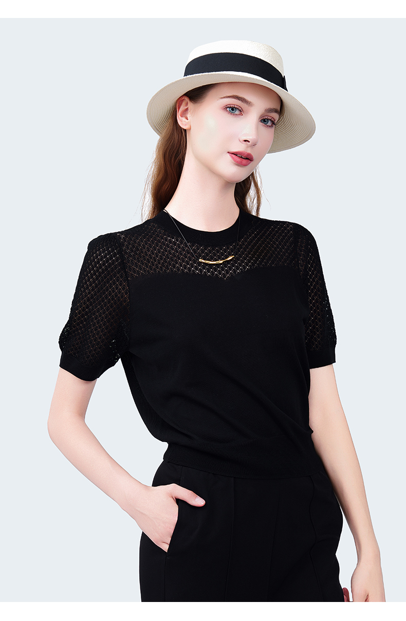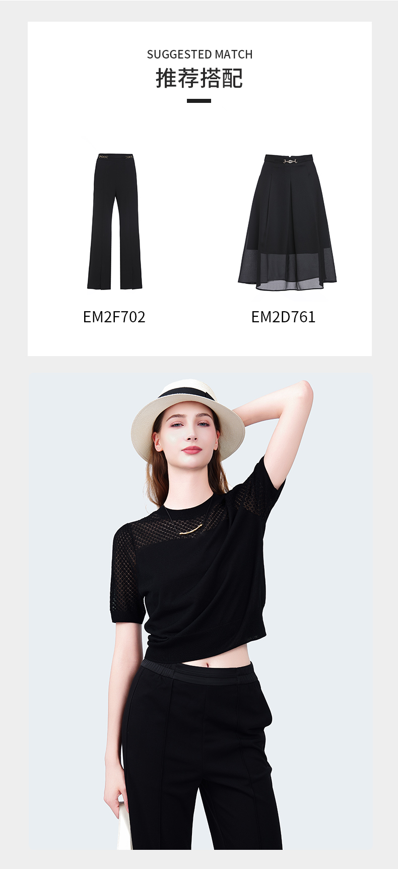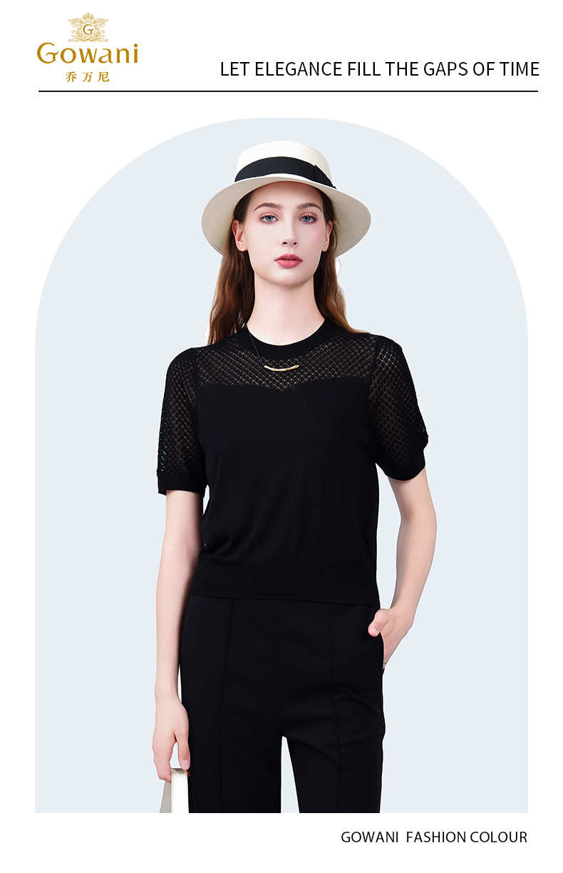 乔万尼时尚新品百搭简约拼接镂空圆领上衣EZ2M119