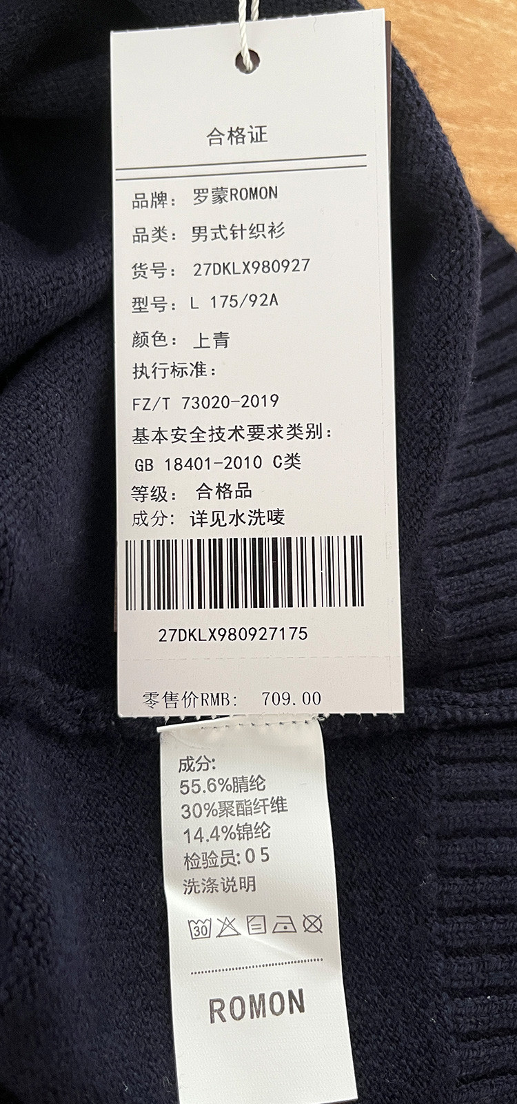面料:腈纶55.6%聚酯纤维30%锦纶14.4%