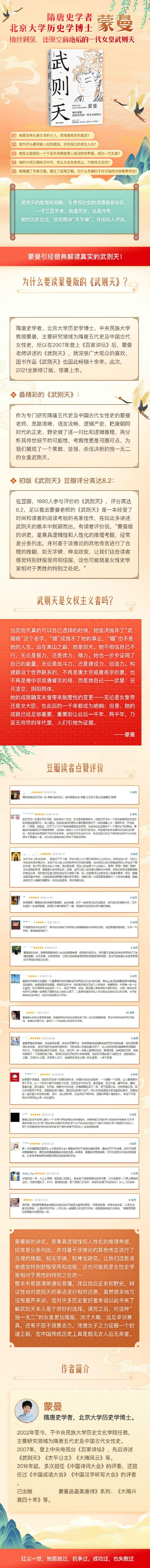 ★ 隋唐史学者蒙曼代表作:北京大学历史学博士毕业后,蒙曼老师就任教于中央民族大学历史文化学院,主要研究领域为隋唐五代史及中国古代女性史,可以说是武则天的研究者。2007年,登上中央电视台《百家讲坛》,主讲《武则天》,迅速引发一股武则天热,蒙曼老师以其深厚的学养和探幽入微、风趣幽默的观点,深受广大观众的喜爱和好评。