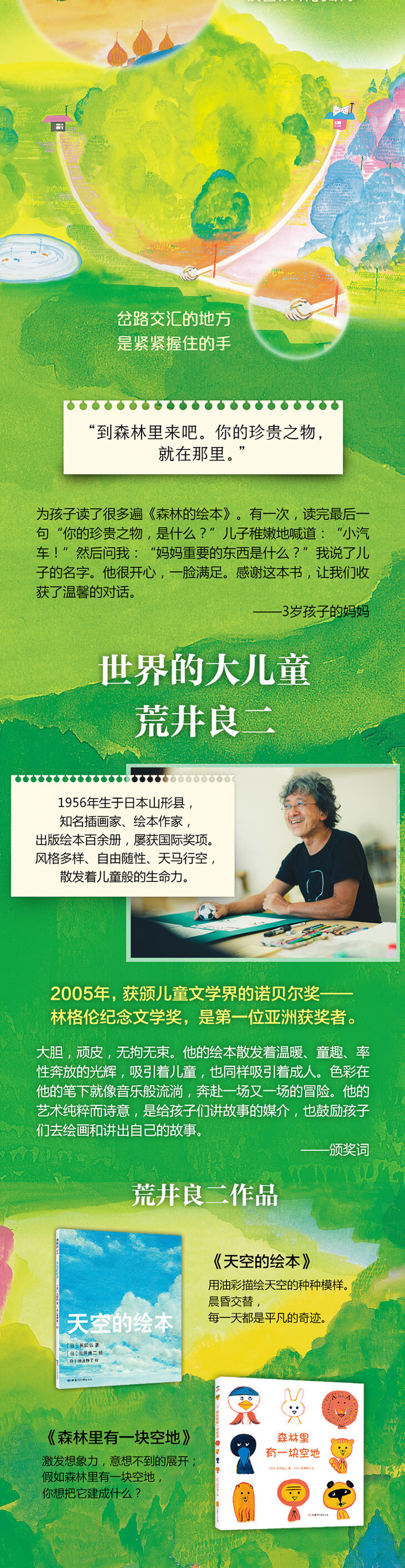 荒井良二是孩子很喜欢的绘本作家,他的画充满童稚,自由自在,这次的森林绘本依然充满惊喜;长田弘的文字也特别的美,每一次读都很感动,像被轻轻叩击心扉。这样文图贴合的美绘本是不能错过哦!细腻的情感、丰富的思想,通过孩子也可以理解的绘本形式表现出来,真的是非常有意义。