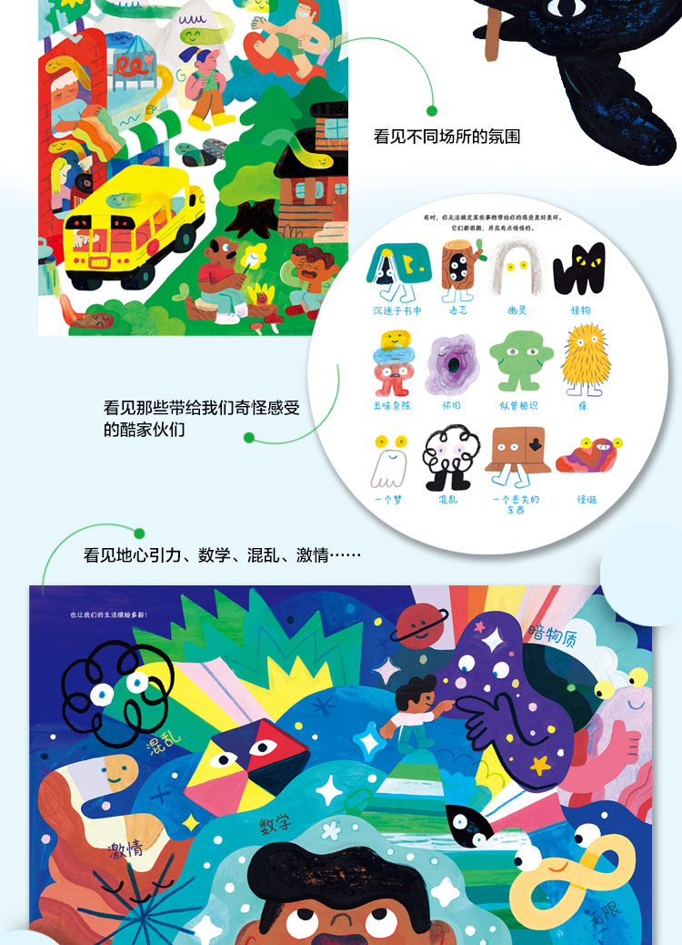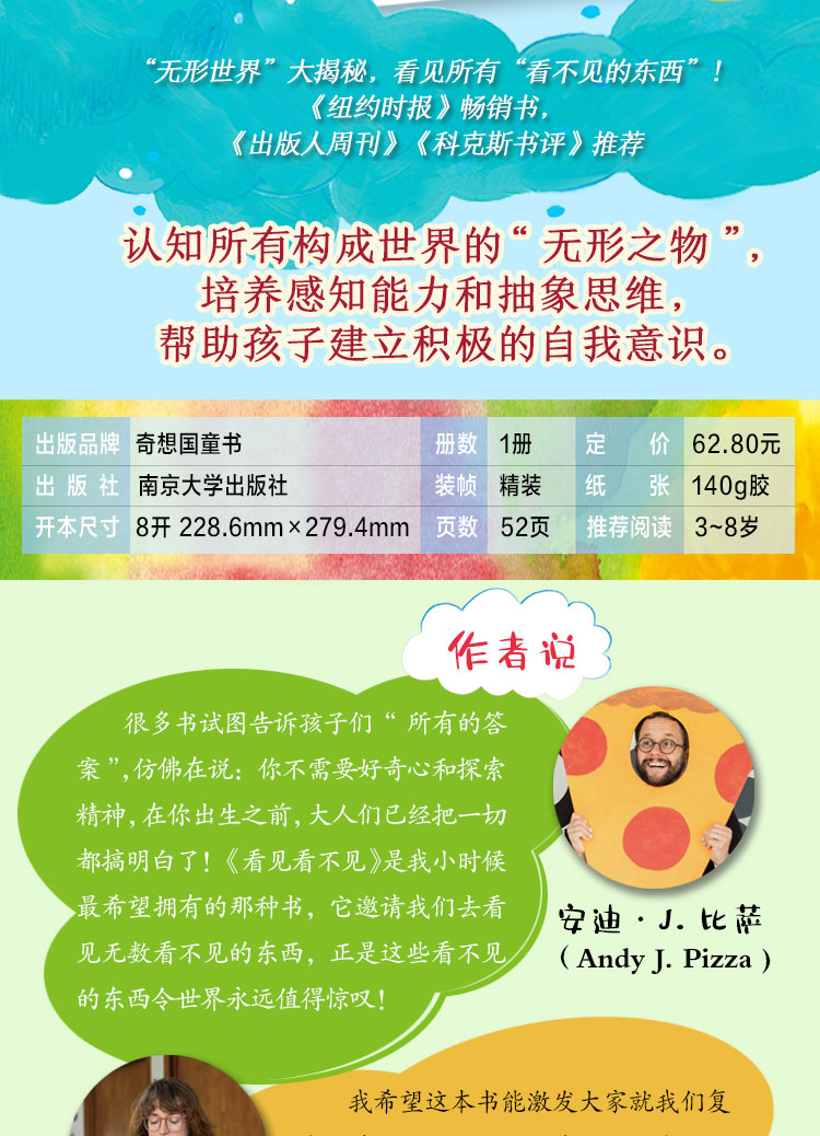 从小狗的叫声到棒棒糖奇妙的味道,从环境的氛围到拥抱的感觉,从忐忑到希望……两位创作者用天马行空的想象力和独具匠心的创意,带孩子踏上一场妙趣横生的“无形世界”发现之旅。在轻松欢乐的氛围中,引导孩子认知身体五感、情绪情感、抽象概念,以及其他构成世界的无形之物。