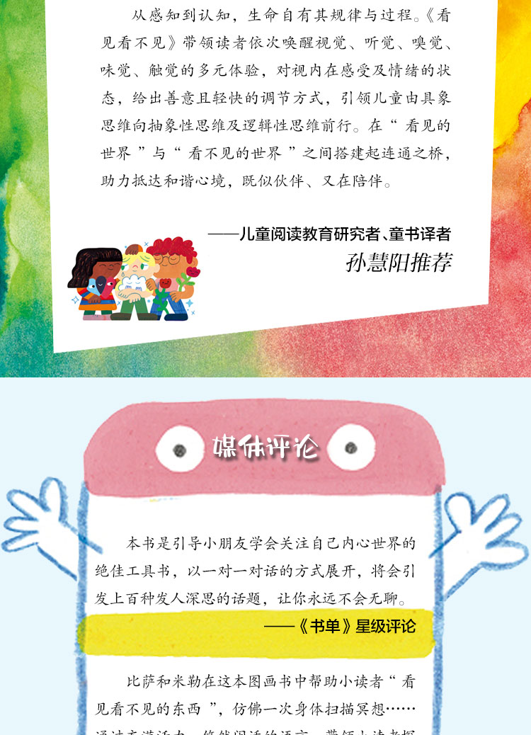 l 从感知到认知,生命自有其规律与过程《看见看不见》带领读者依次唤醒视觉、听觉、嗅觉、味觉、触觉的多元体验,对视内在感受及情绪的状态,给出善意且轻快的调节方式,引领儿童由具象思维向抽象性思维及逻辑性思维前行。在“看见的世界”与“看不见的世界”之间搭建起连通之桥,助力抵达和谐心境,既似伙伴、又在陪伴。