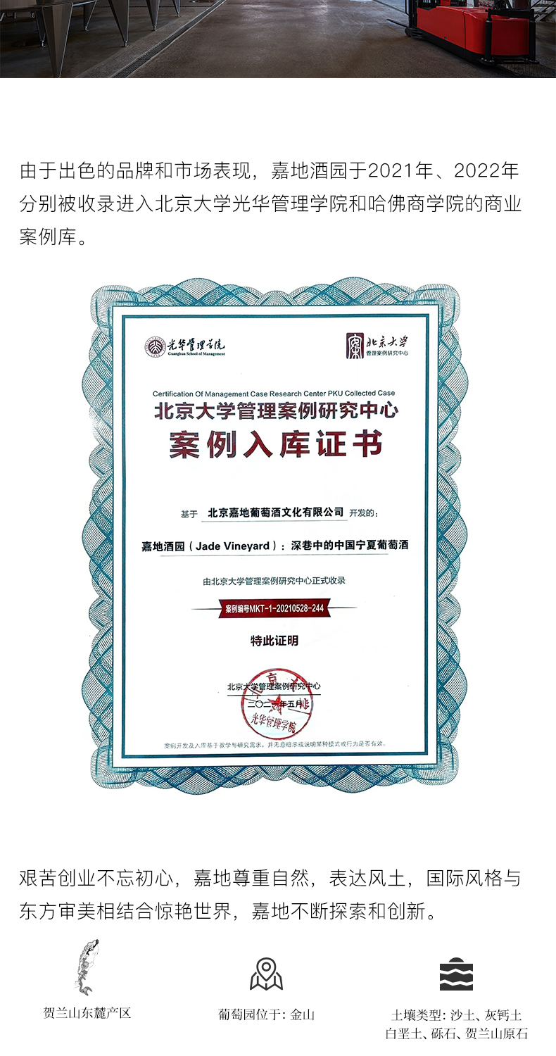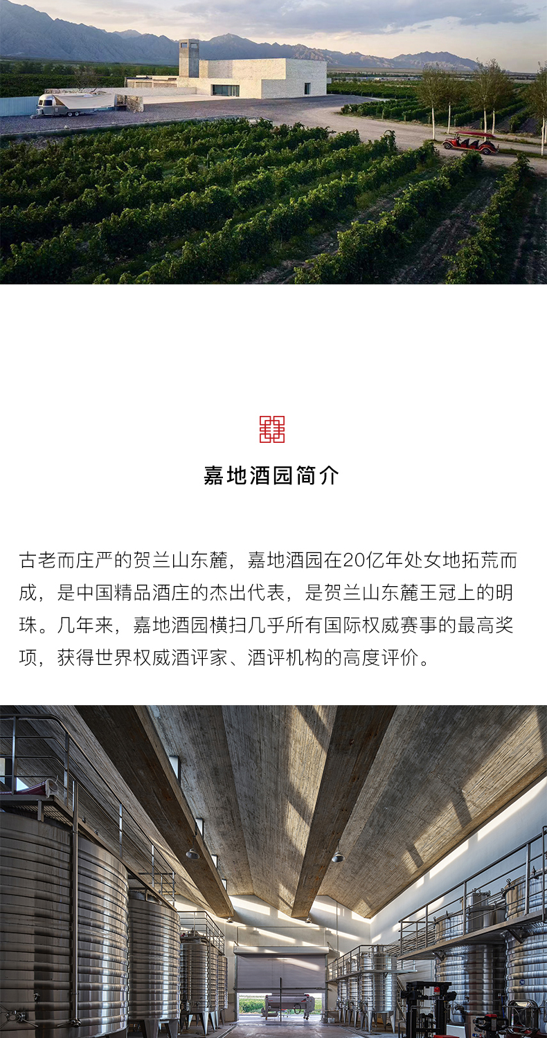- 嘉地酒园,英文名称 Jade Vineyard 寓意一块美玉,坐落在银川贺兰山东麓。作为中国新兴精品酒庄,怀揣着要做中国顶级葡萄酒的梦想。