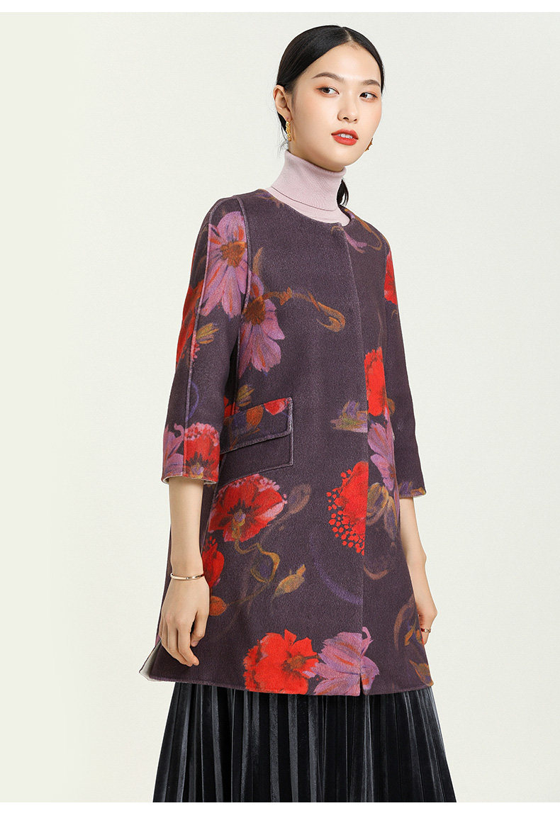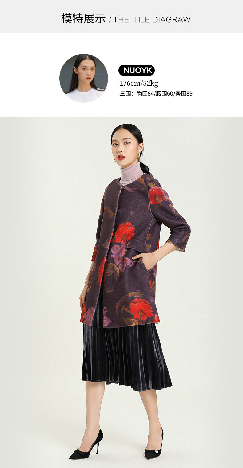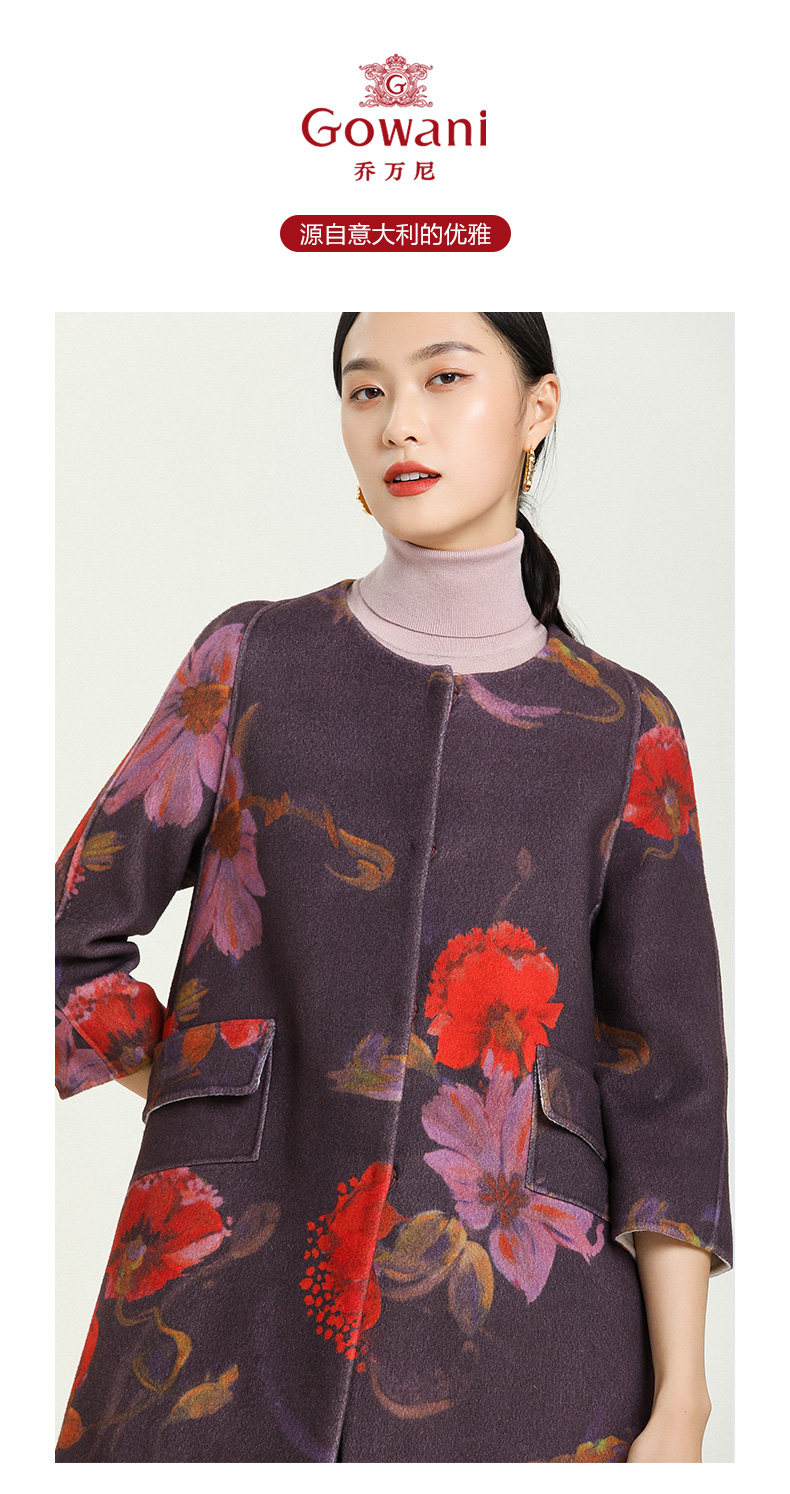 乔万尼冬季新款中长款重磅羊毛大衣时尚印花圆领九分袖大衣外套女E164A037