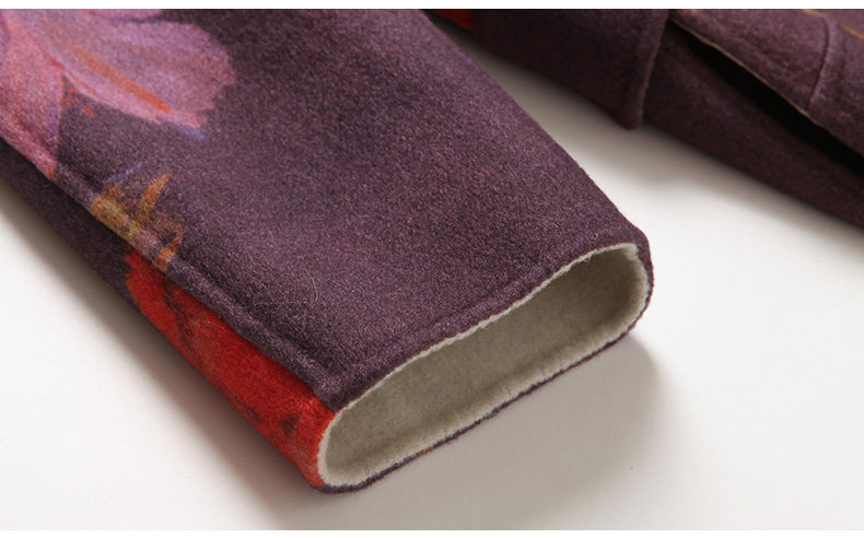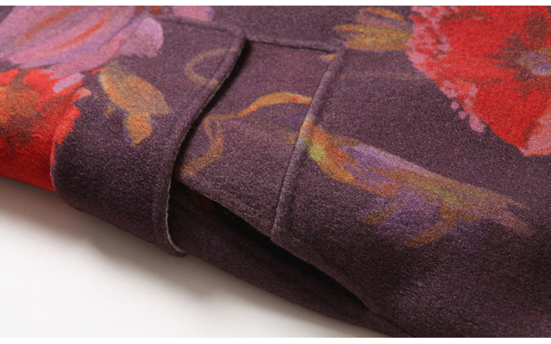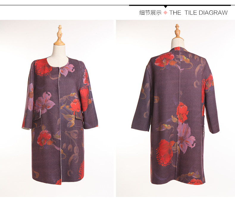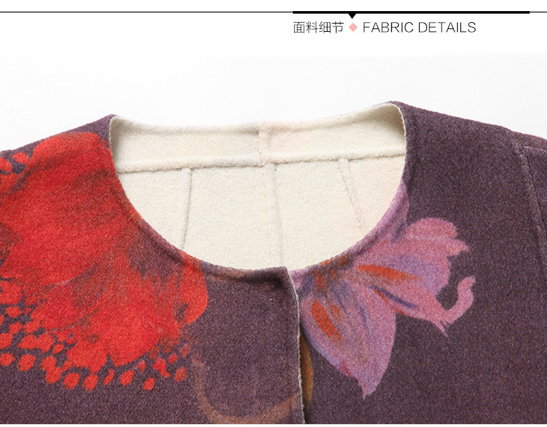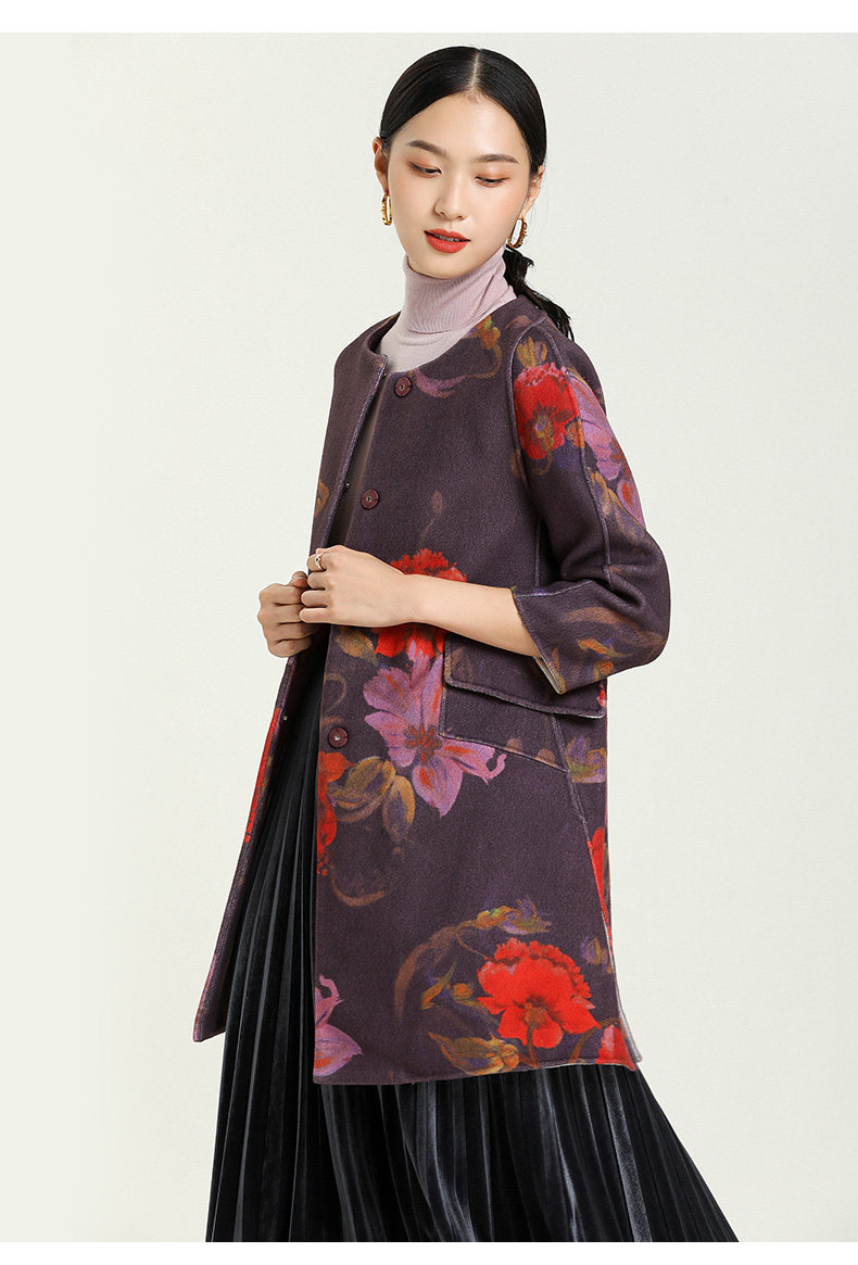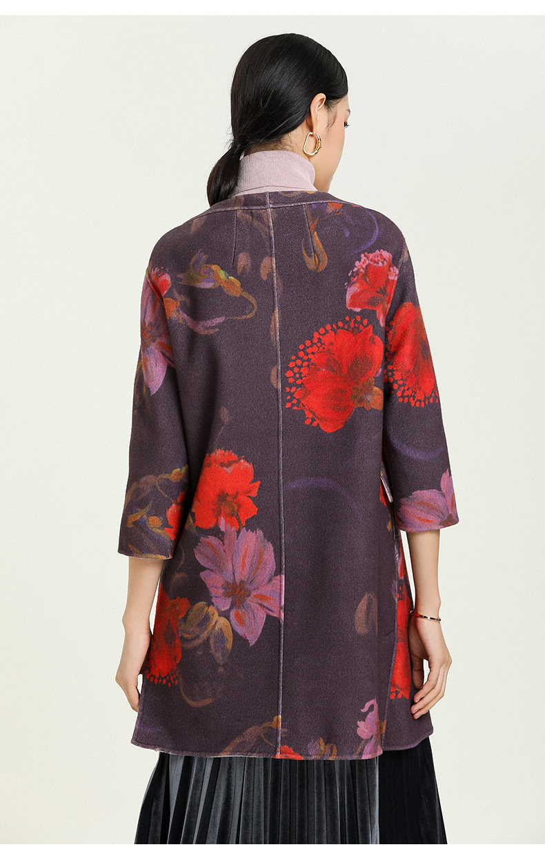 乔万尼冬季新款中长款重磅羊毛大衣时尚印花圆领九分袖大衣外套女E164A037