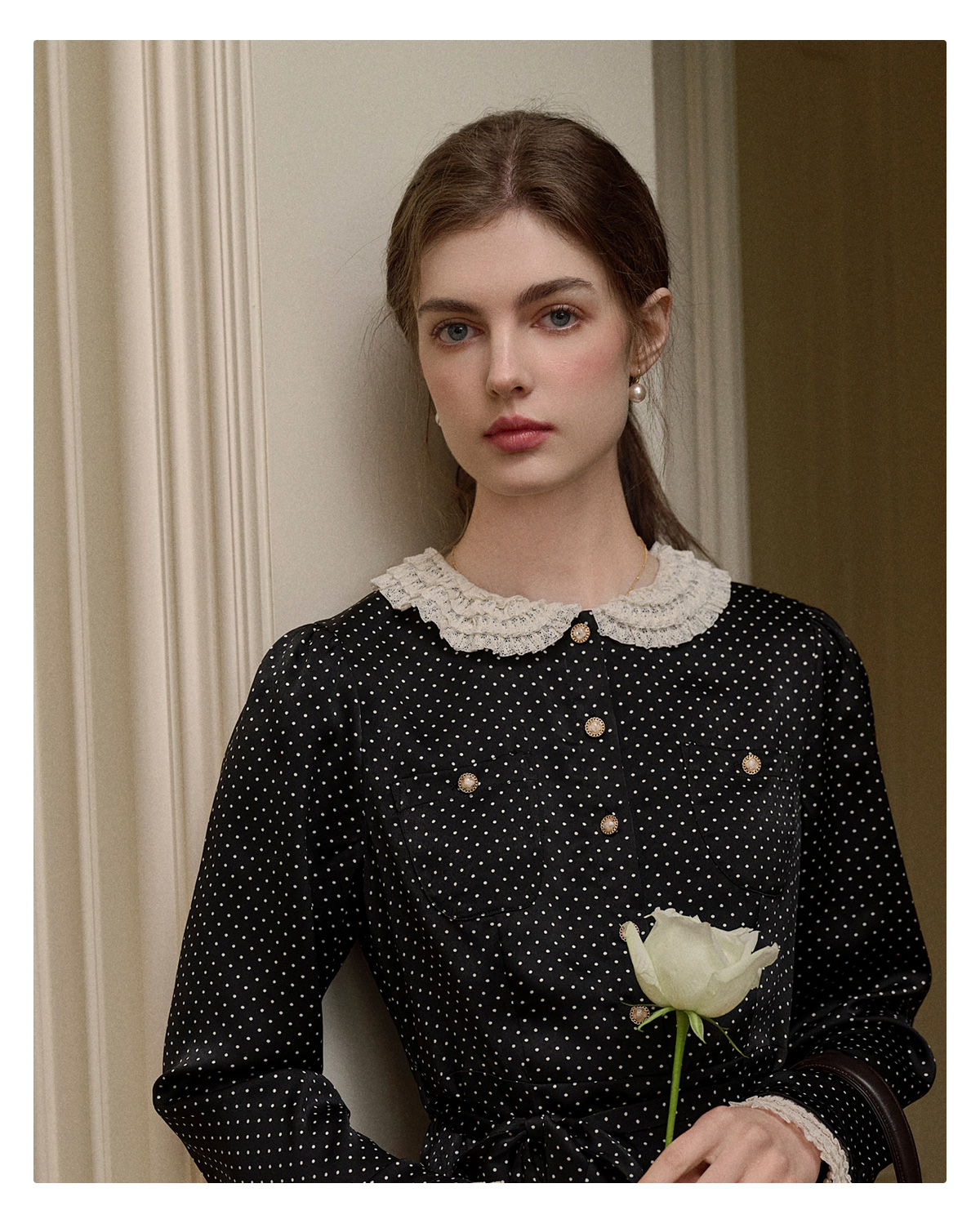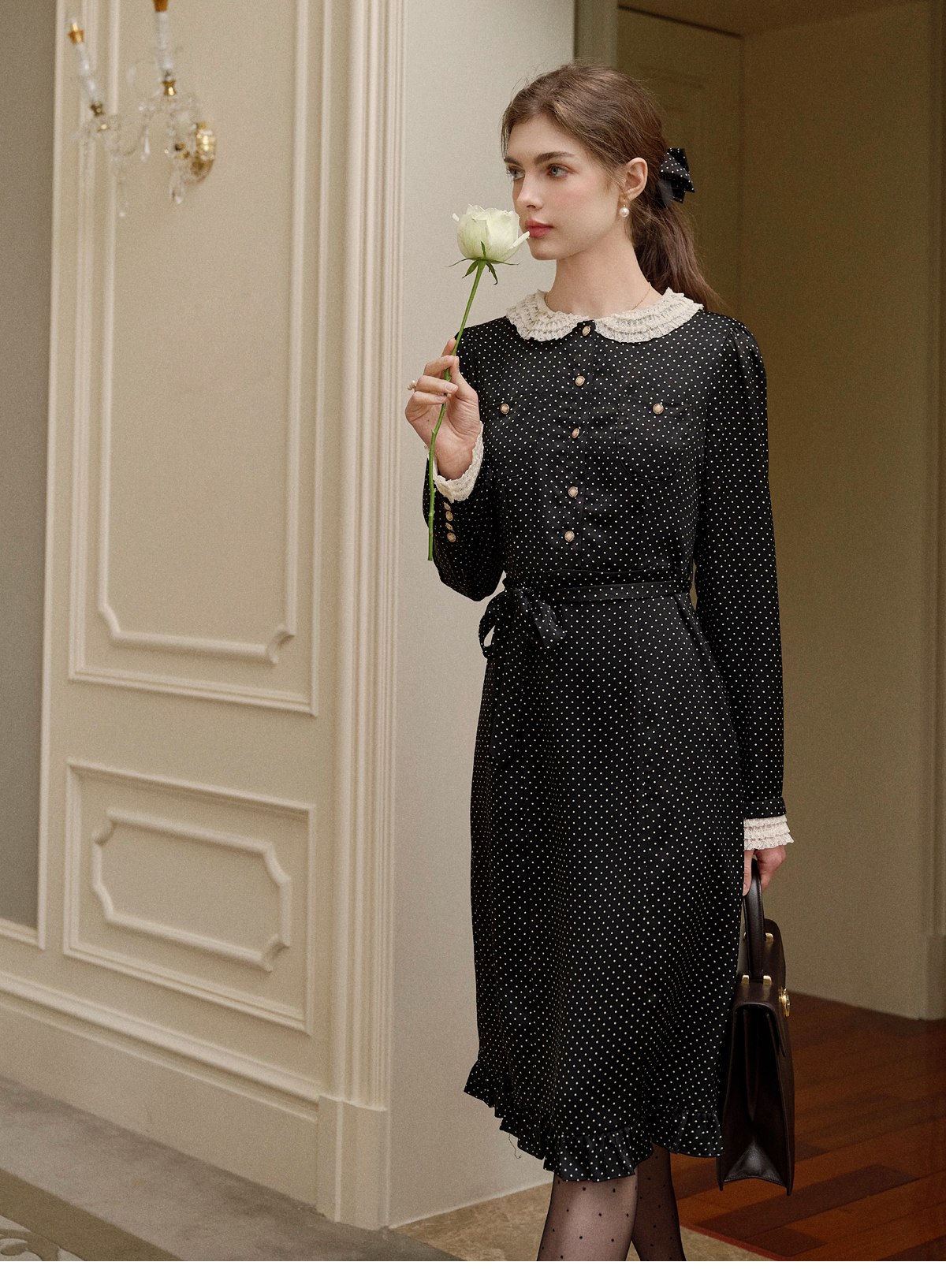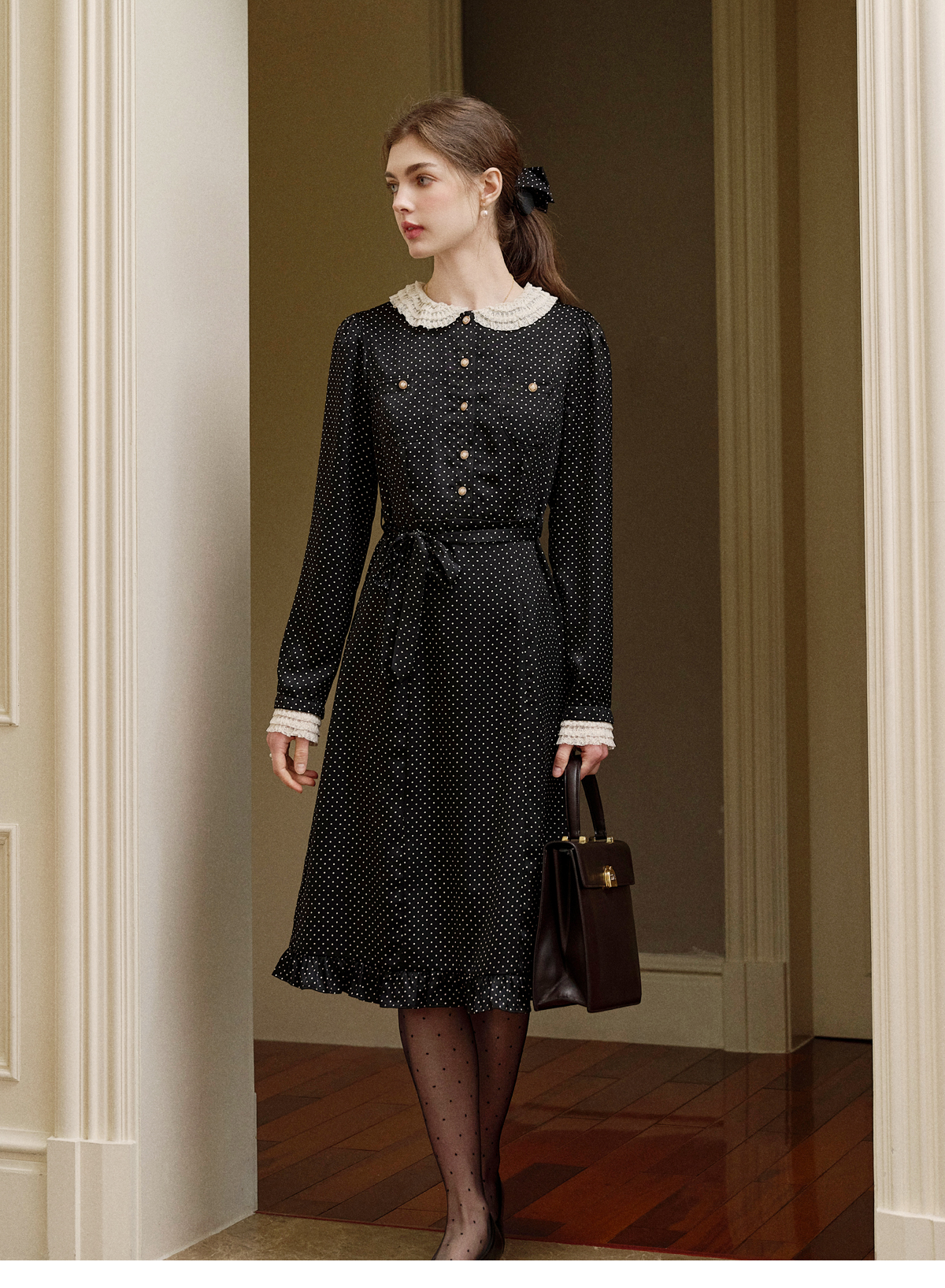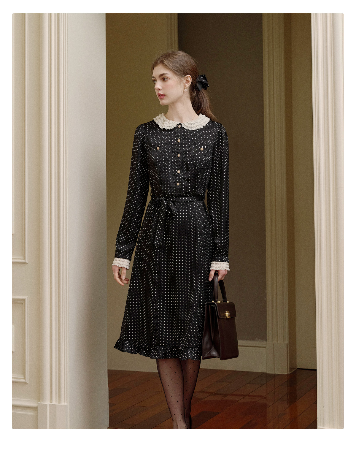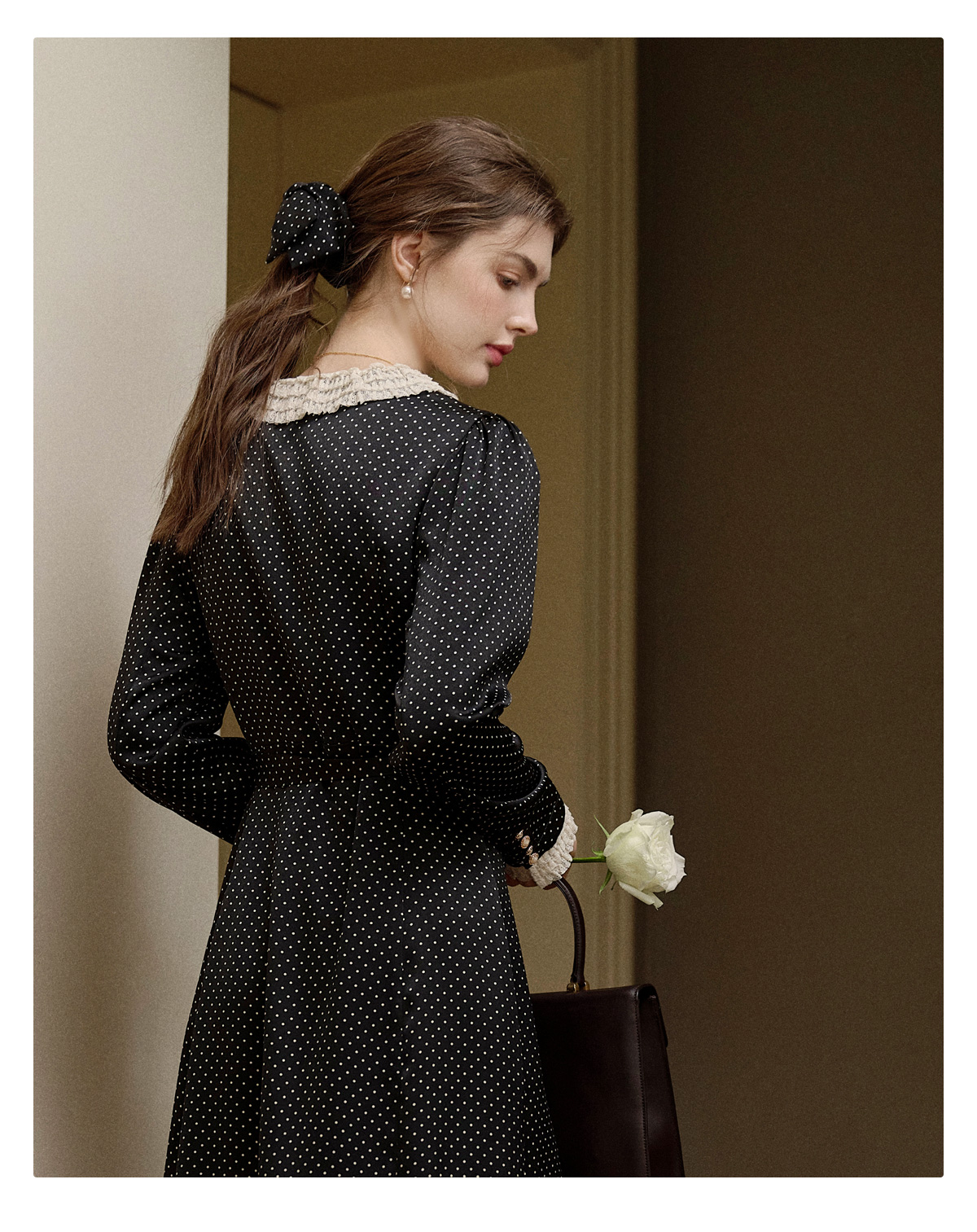 SimpleRetro复古音符 蕾丝花边领波点连衣裙女长袖显瘦气质小黑裙