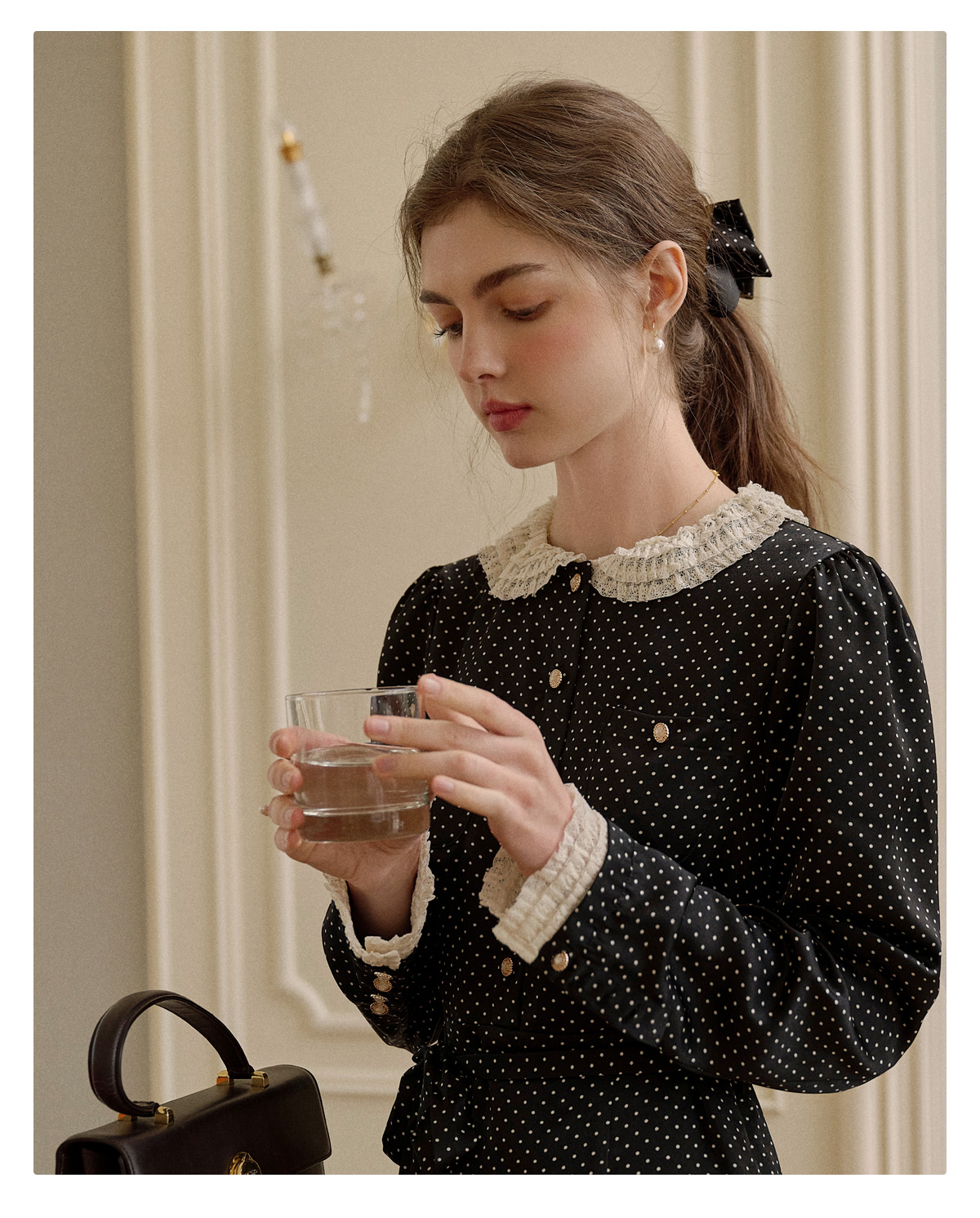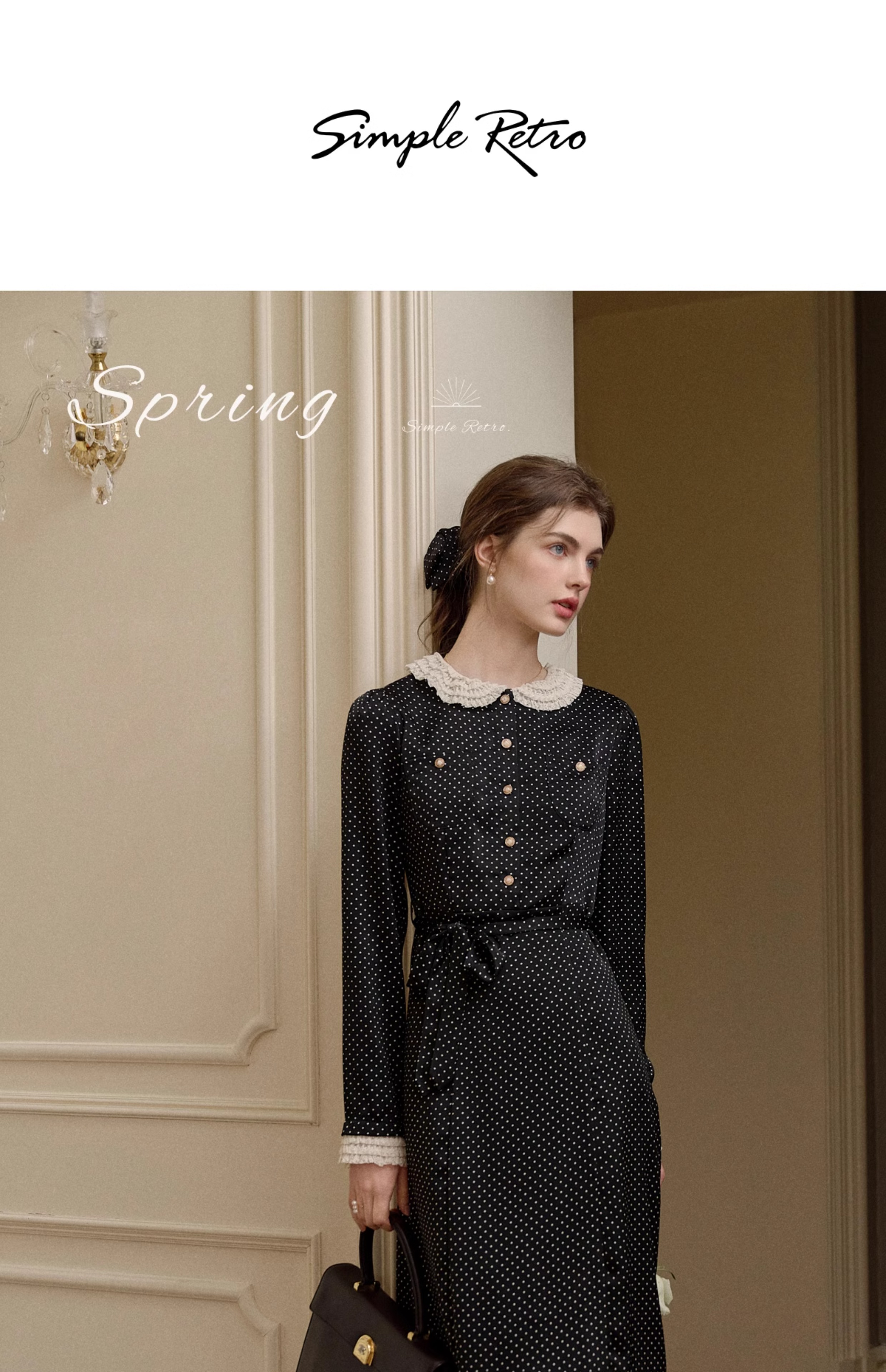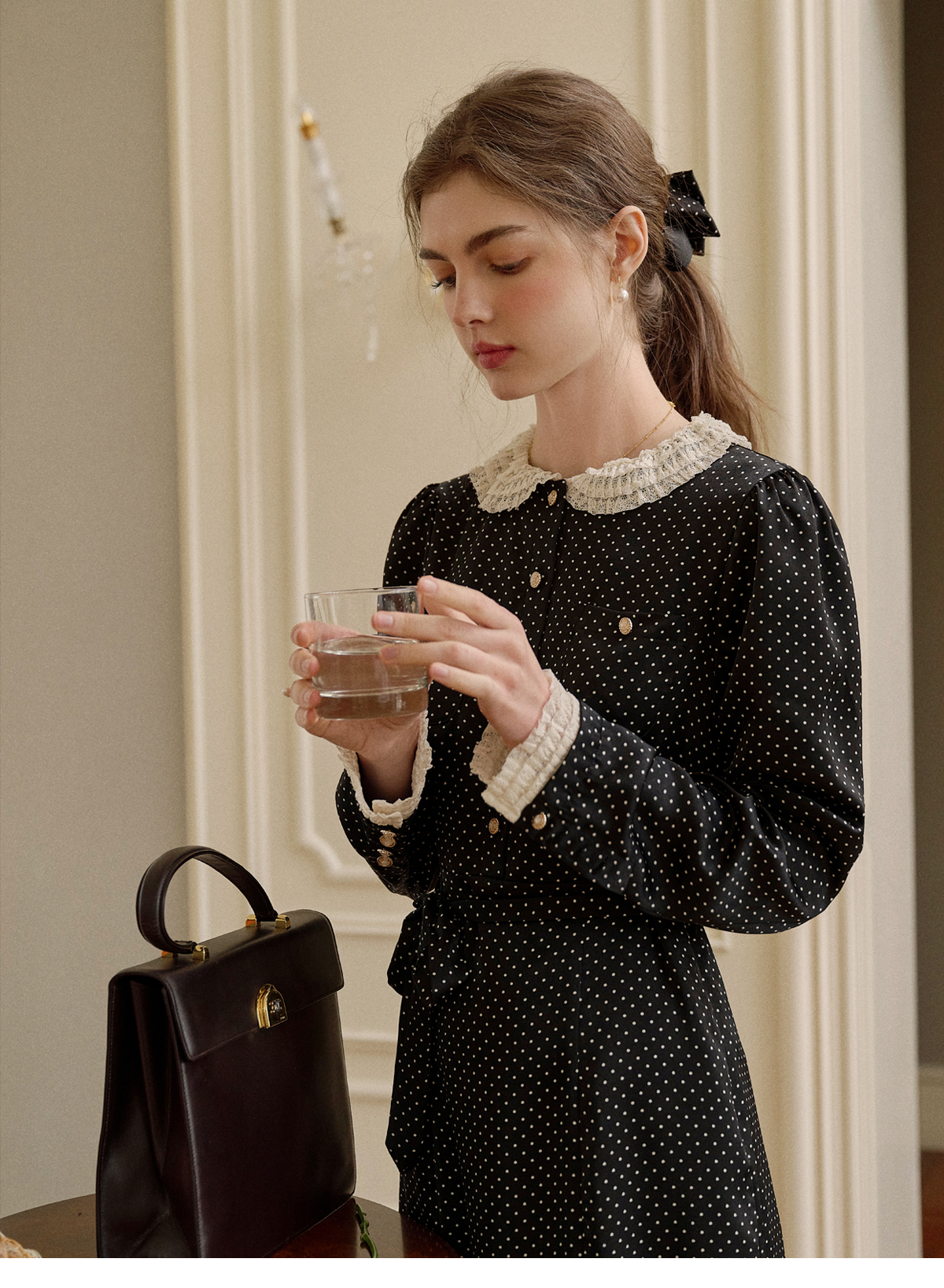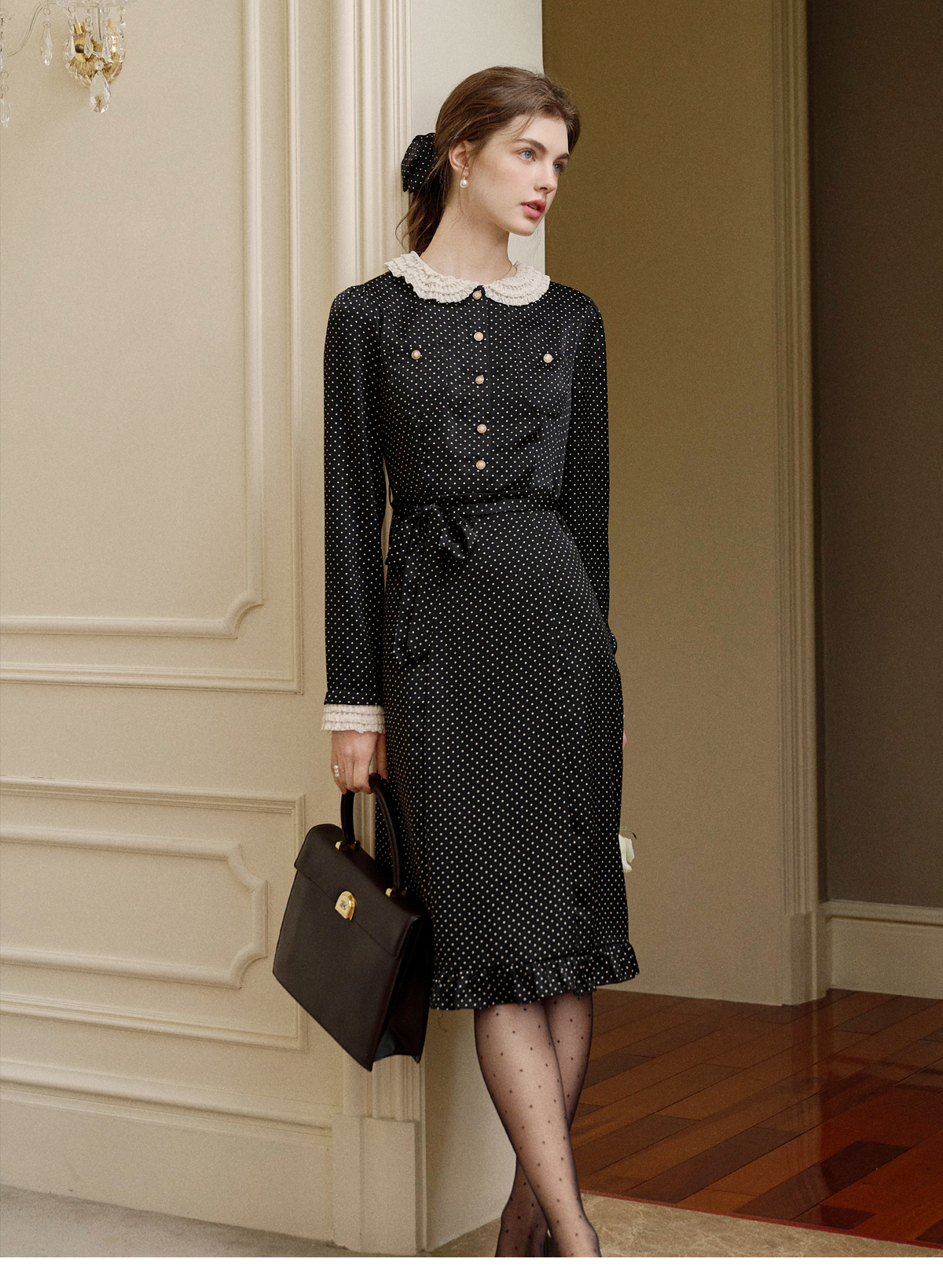 SimpleRetro复古音符 蕾丝花边领波点连衣裙女长袖显瘦气质小黑裙