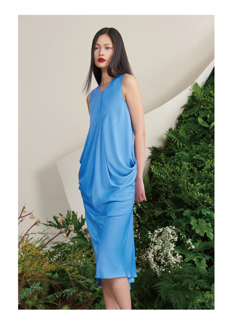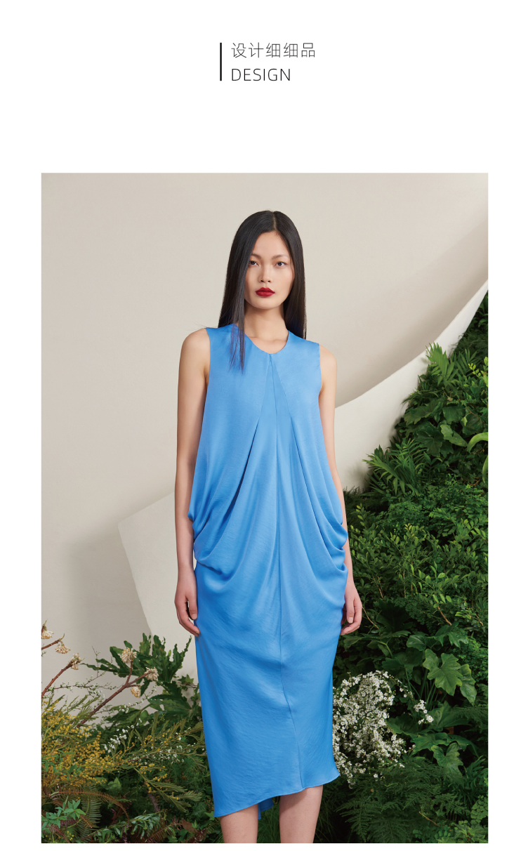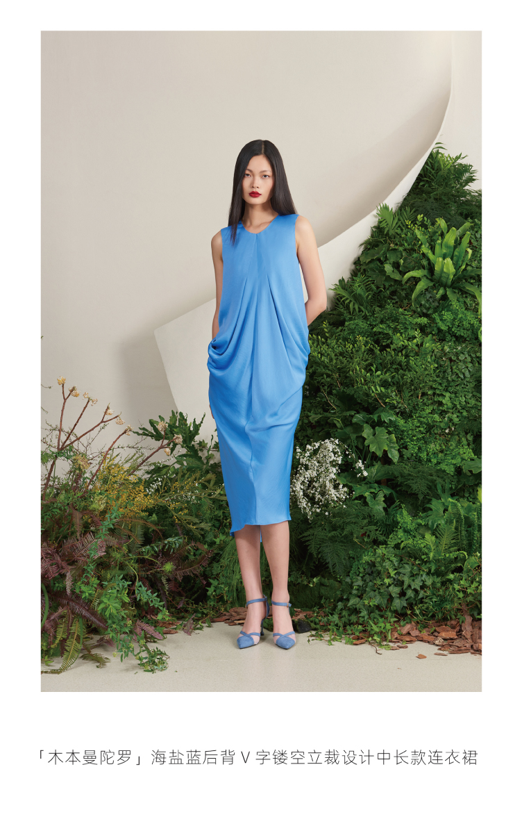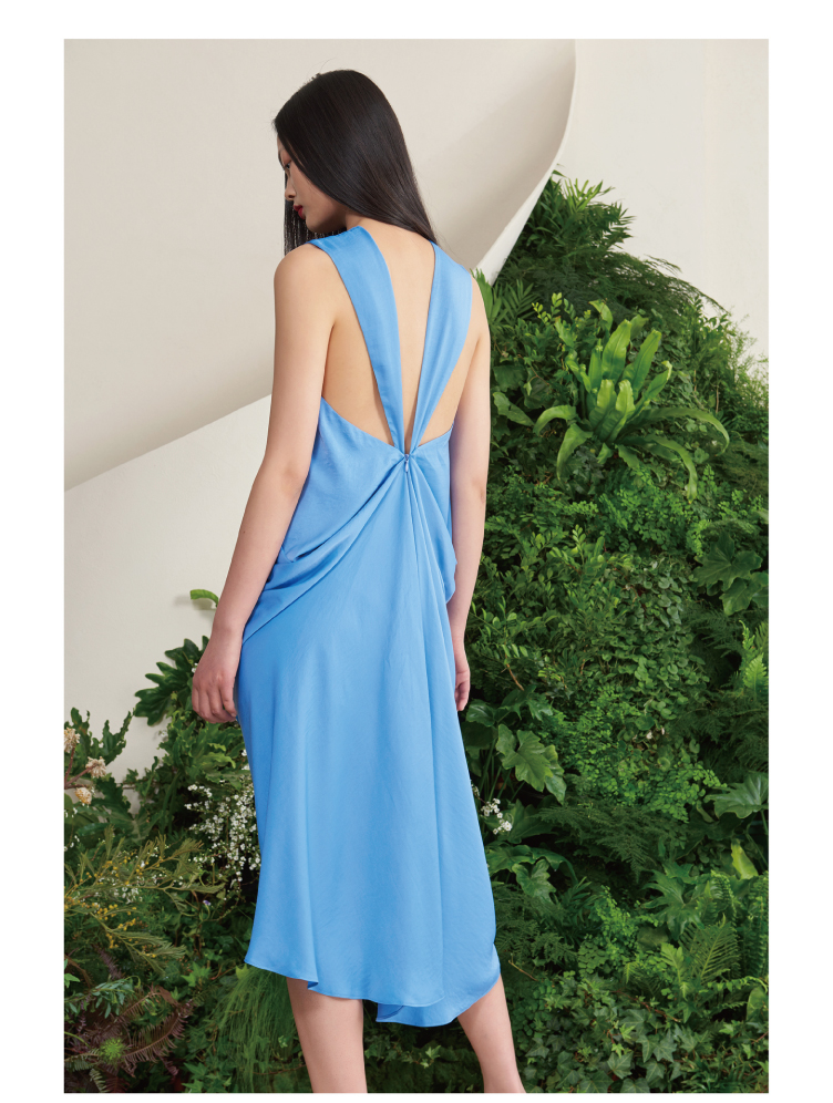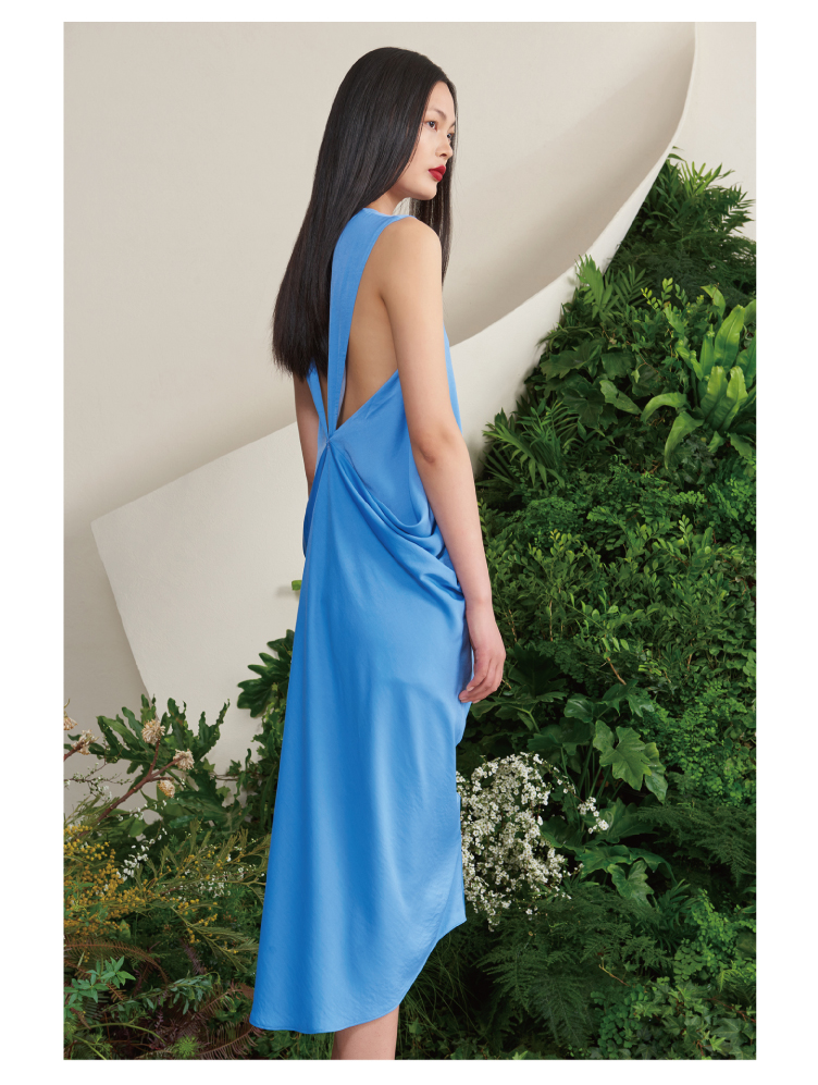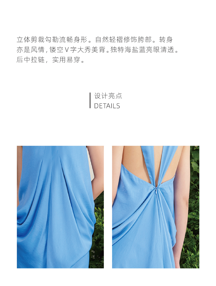 【木本曼陀罗】海盐蓝后背V字镂空立裁设计中长款连衣裙/0000659A