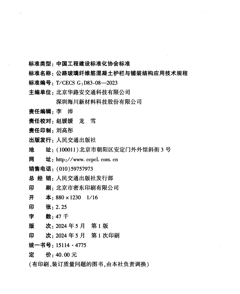 书名:公路玻璃纤维筋混凝土护栏与铺装结构应用技术规程(T/CECS G:D83-08—2023)