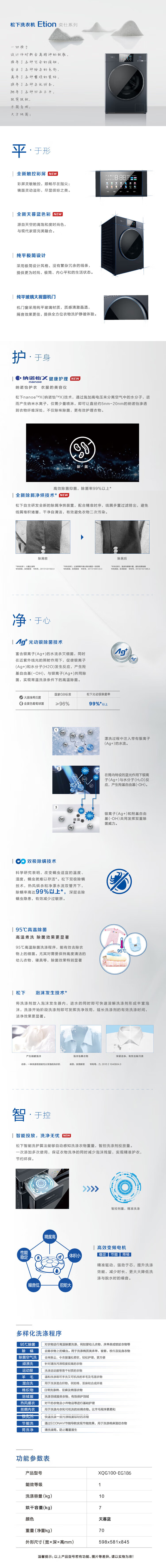 松下(Panasonic)(252088)10公斤洗烘一体滚筒洗衣机触控彩屏智能投放系统光动银除菌除屑烘技术纳诺怡护理 XQG100-EG186