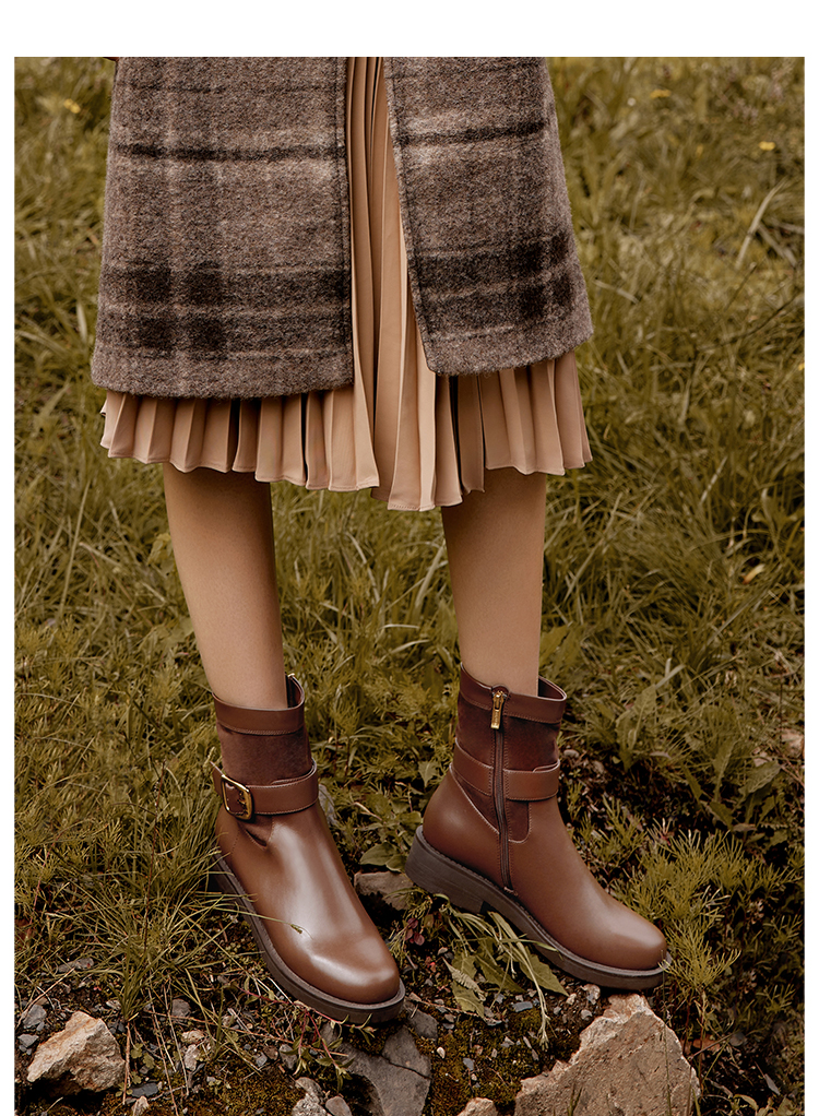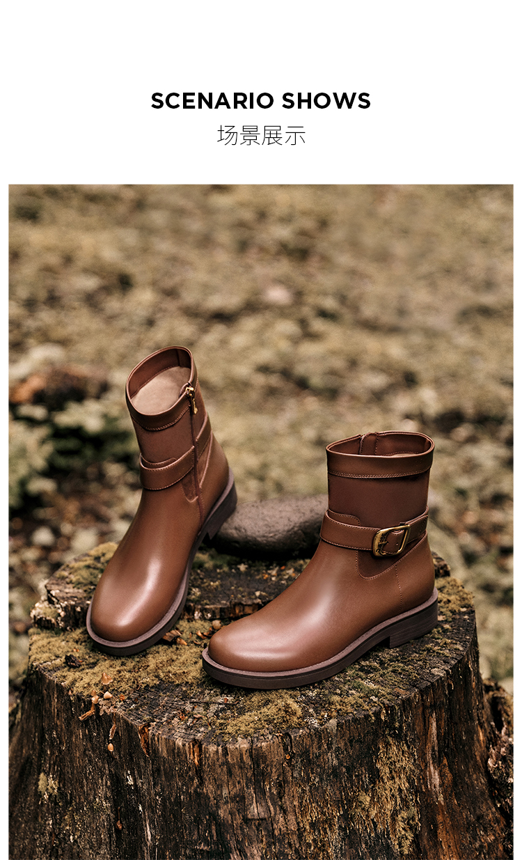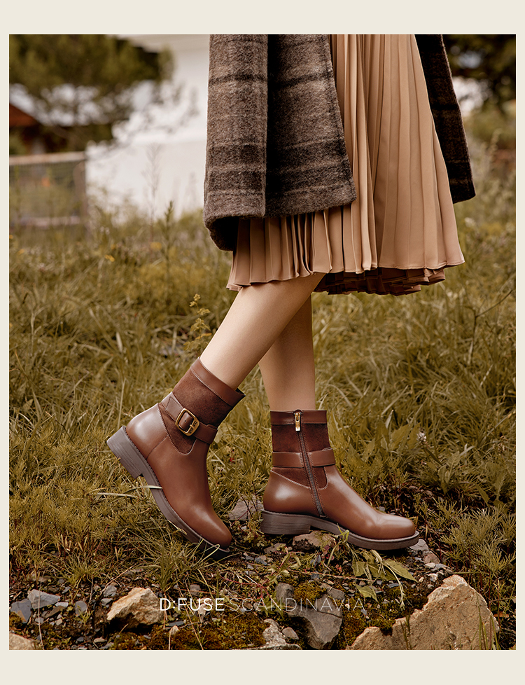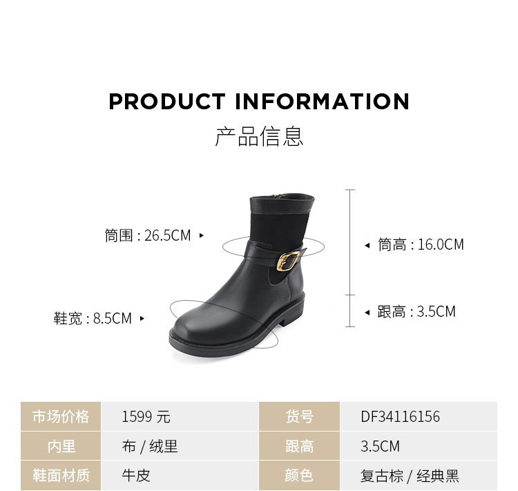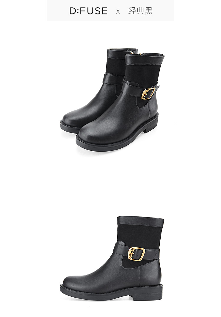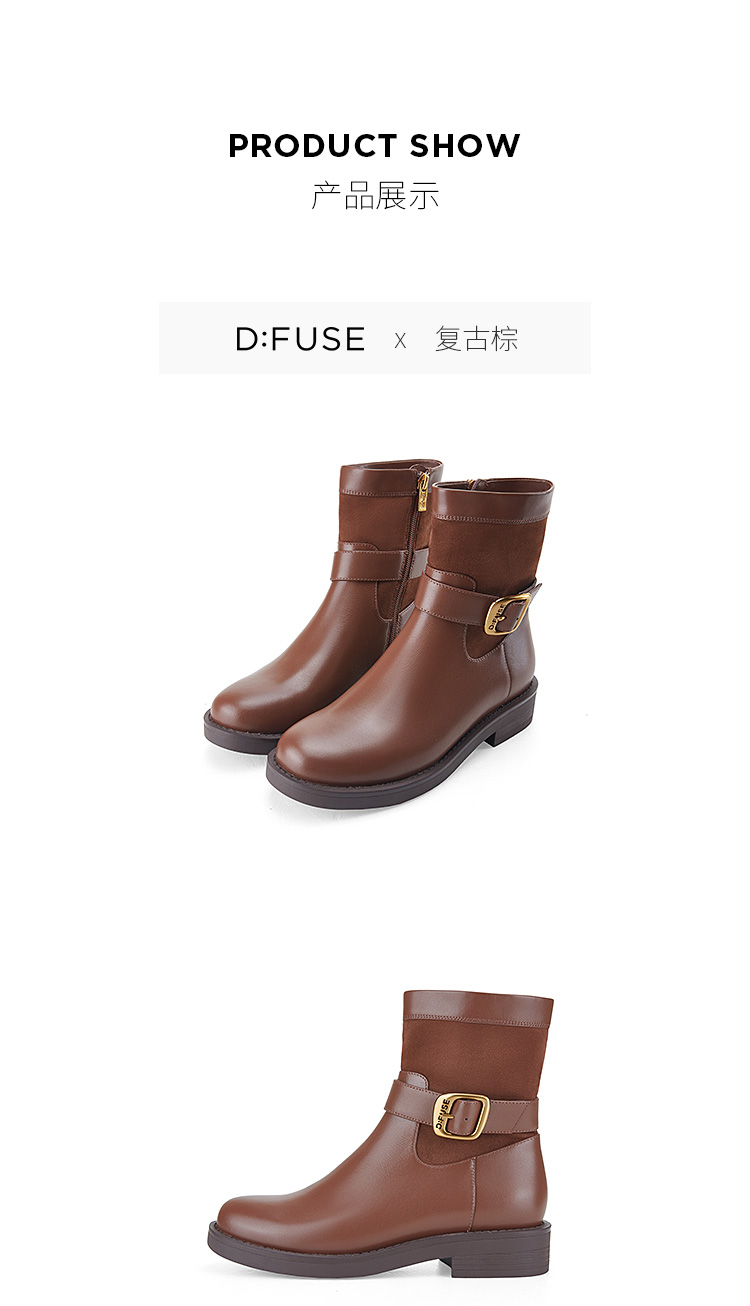 Dfuse迪芙斯冬季新款牛皮圆头复古方扣休闲短靴女DF34116156/DF34118156