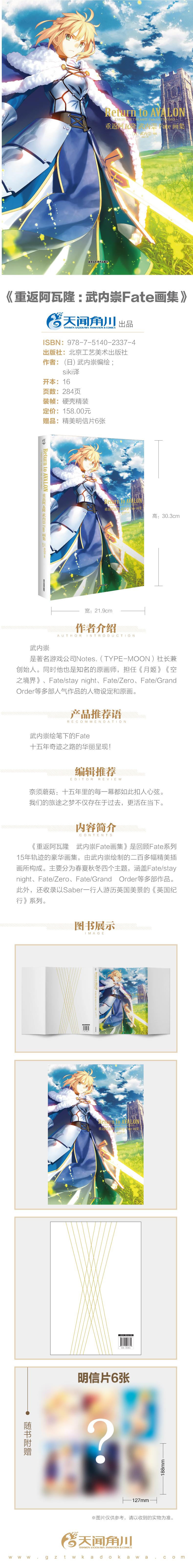 《重返阿瓦隆 武内崇Fate画集》是回顾Fate系列15年轨迹的豪华画集,由武内崇绘制的二百多幅精美插画所构成。主要分为春夏秋冬四个主题,涵盖Fate/stay night、Fate/Zero、Fate/Grand Order等多部作品。此外,还收录以Saber一行人游历英国美景的《英国纪行》系列。