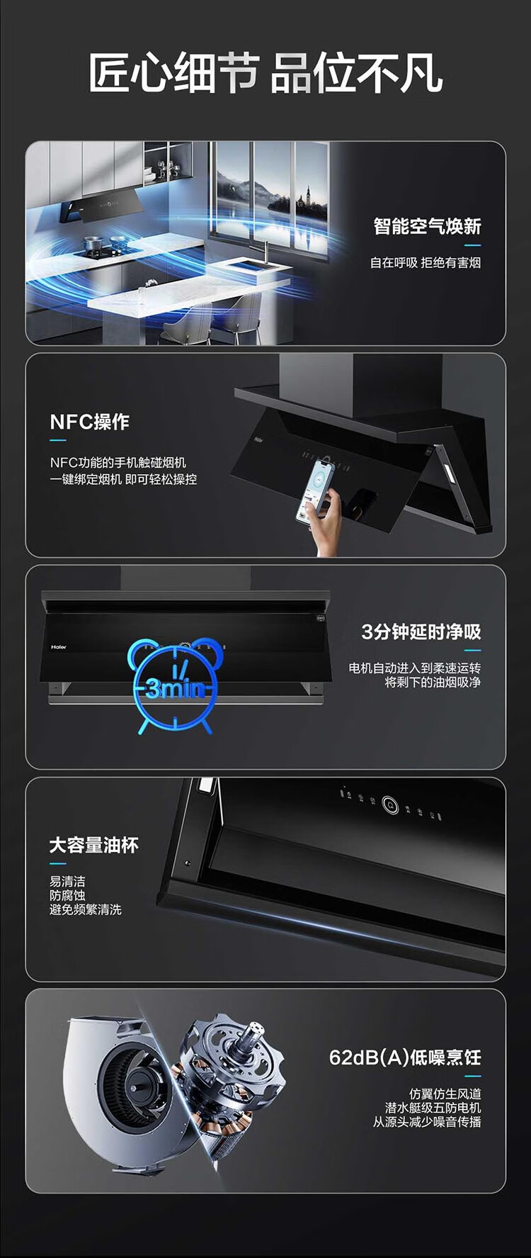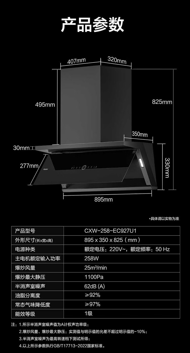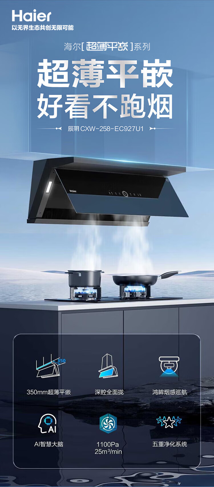 海尔(Haier)EC927U1 S+主推 平嵌大师系列 抽油烟机变频有效风 25m³/min 热熔洗 超薄近吸油烟机