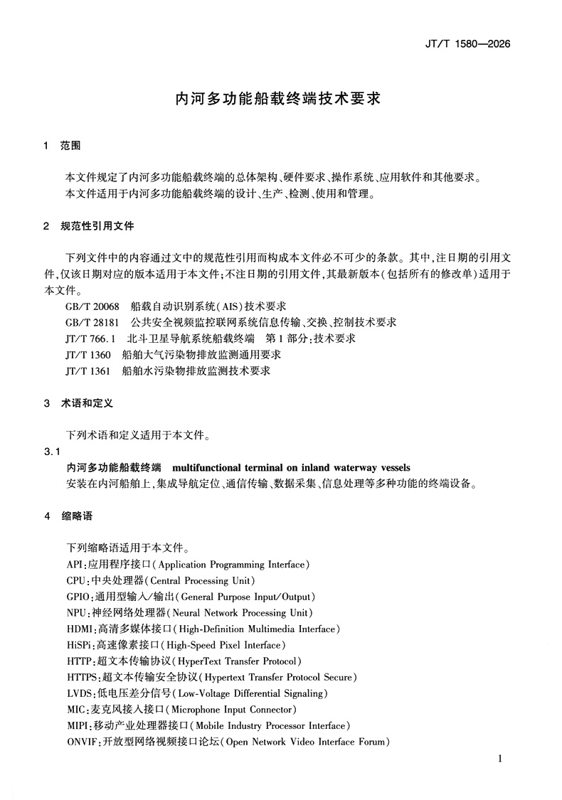书名:内河多功能船载终端技术要求(JT/T 1580—2026)