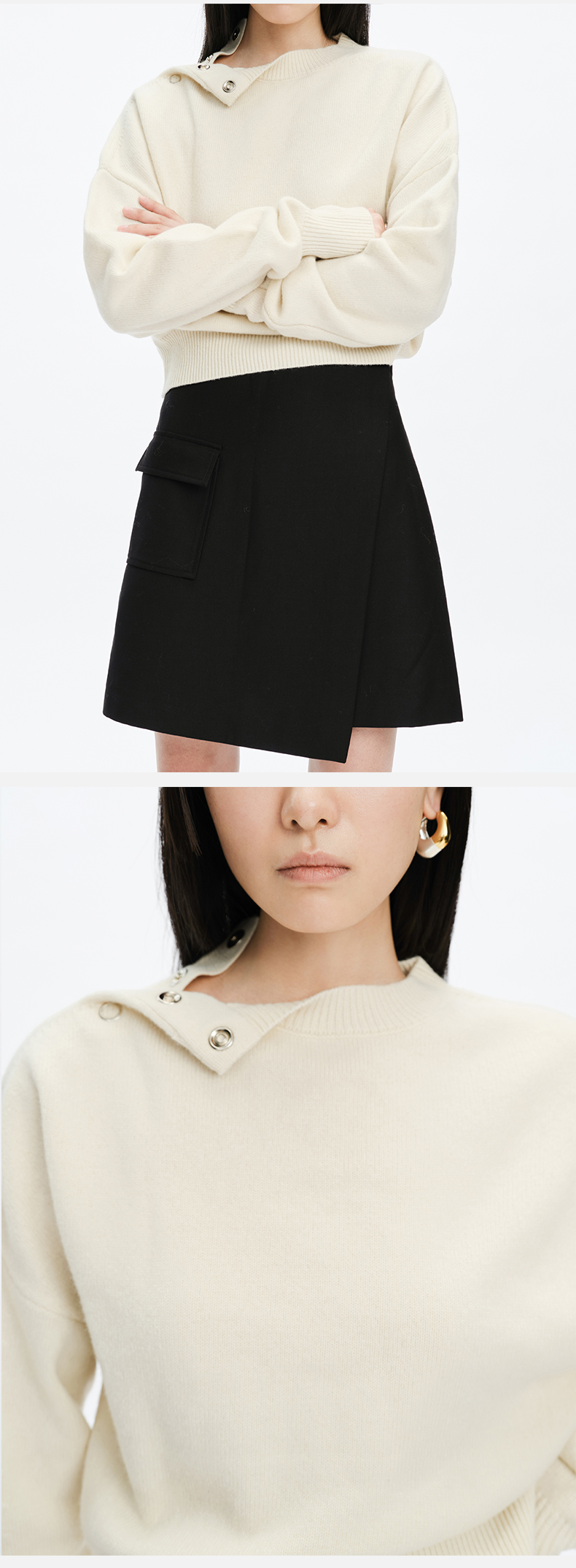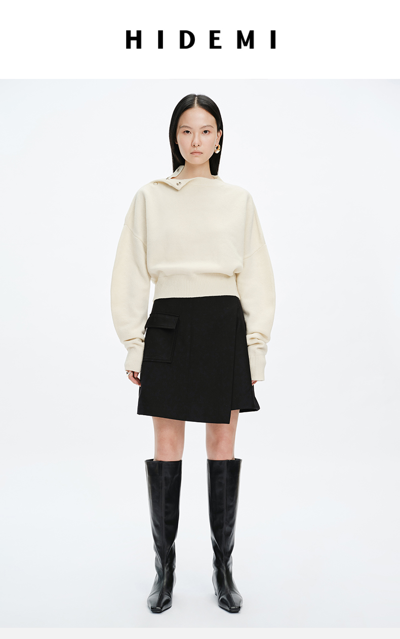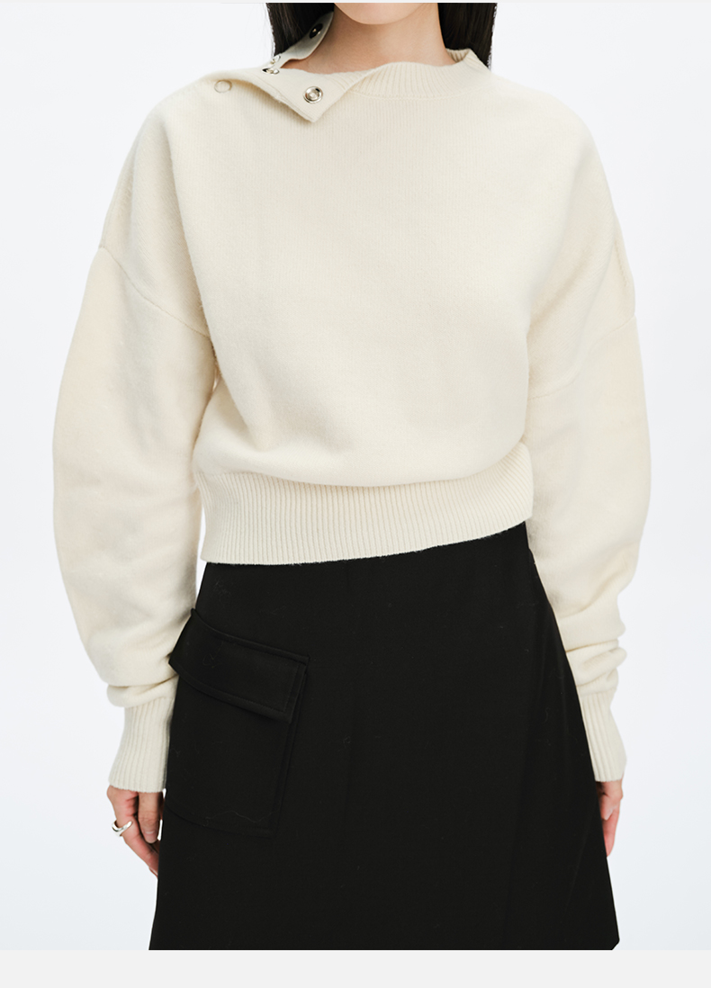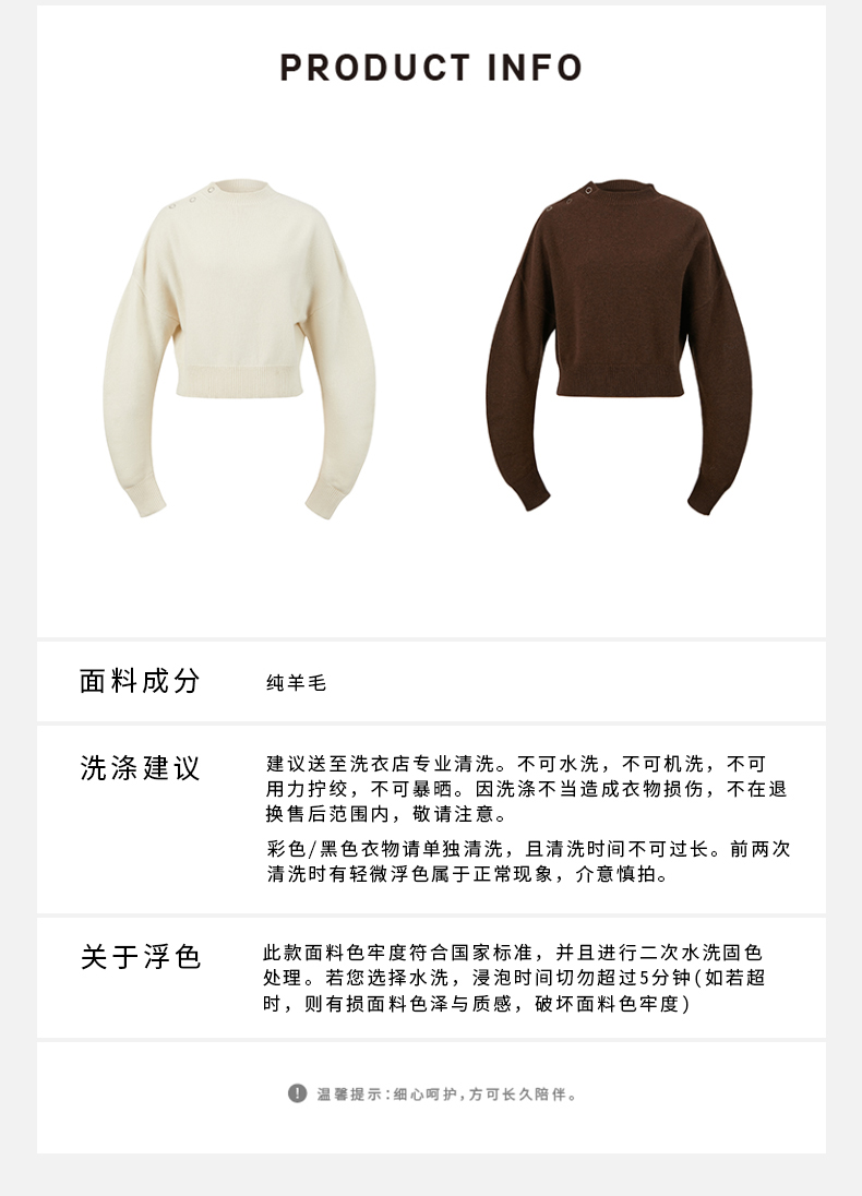 HIDEMI美利奴羊毛纽扣羊腿弧形袖极简毛衣 白色/巧克力色