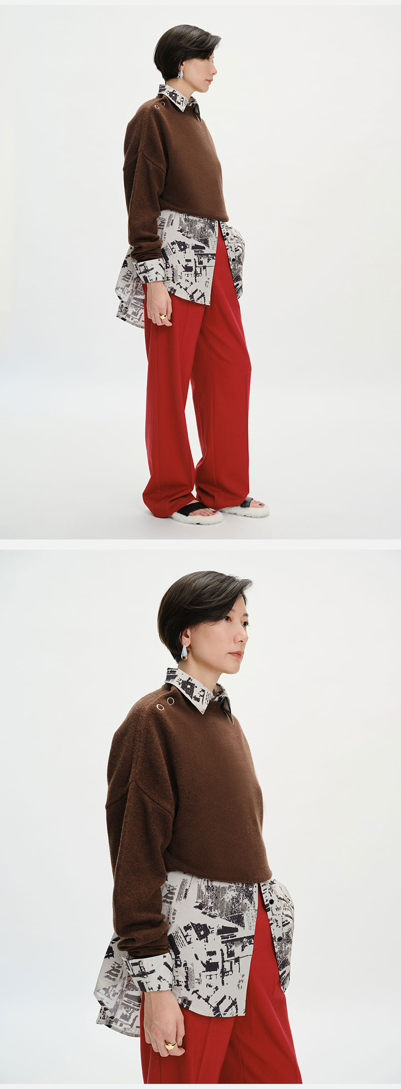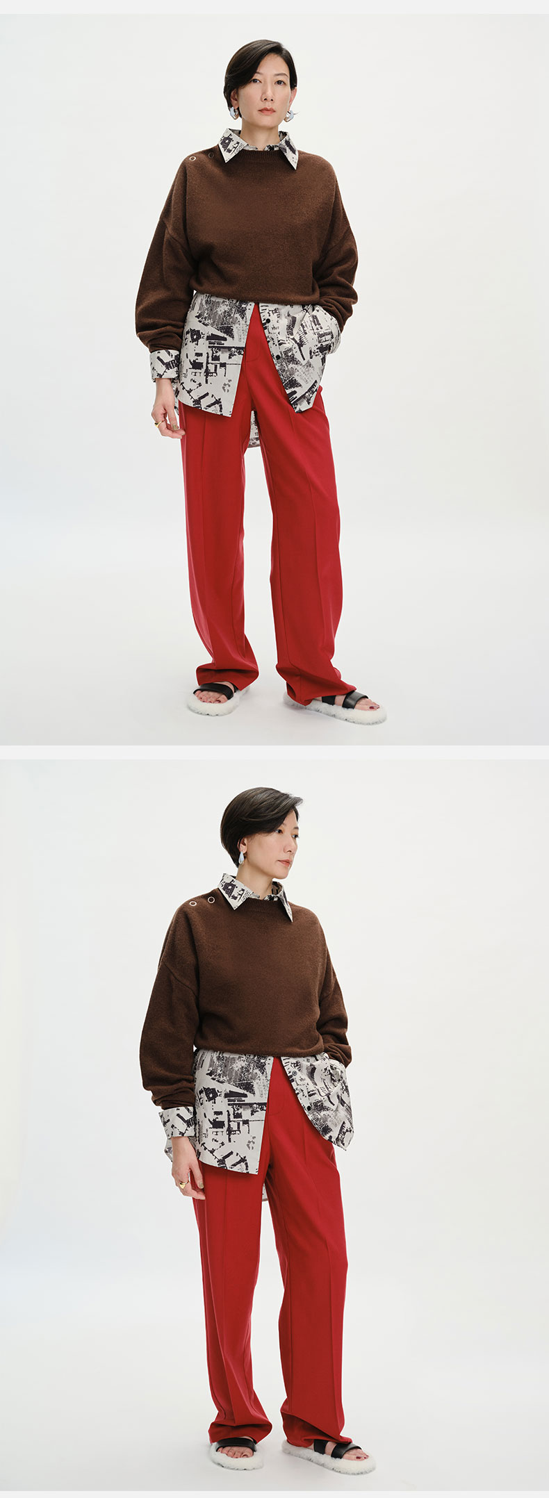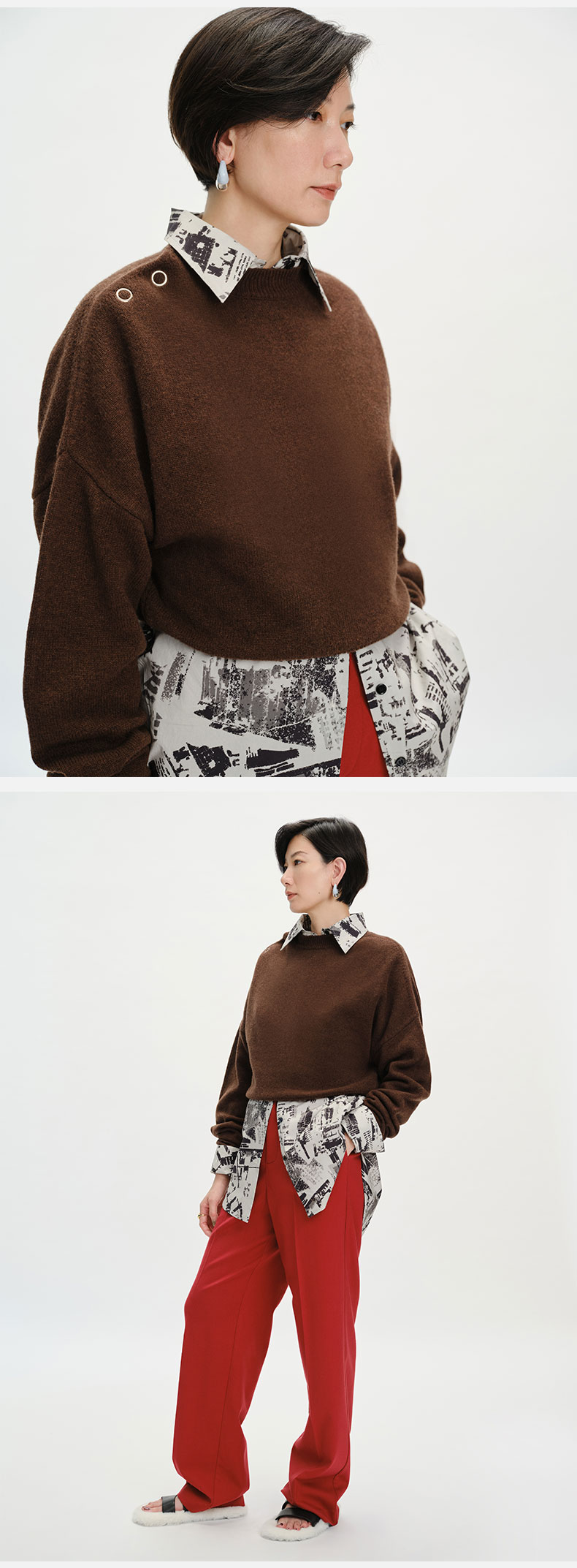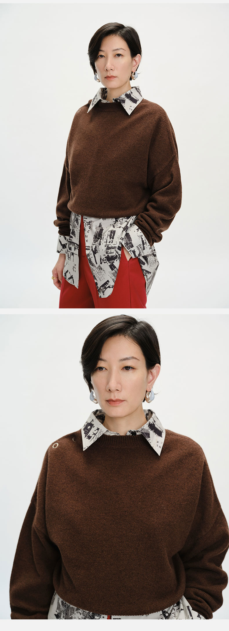 HIDEMI美利奴羊毛纽扣羊腿弧形袖极简毛衣 白色/巧克力色