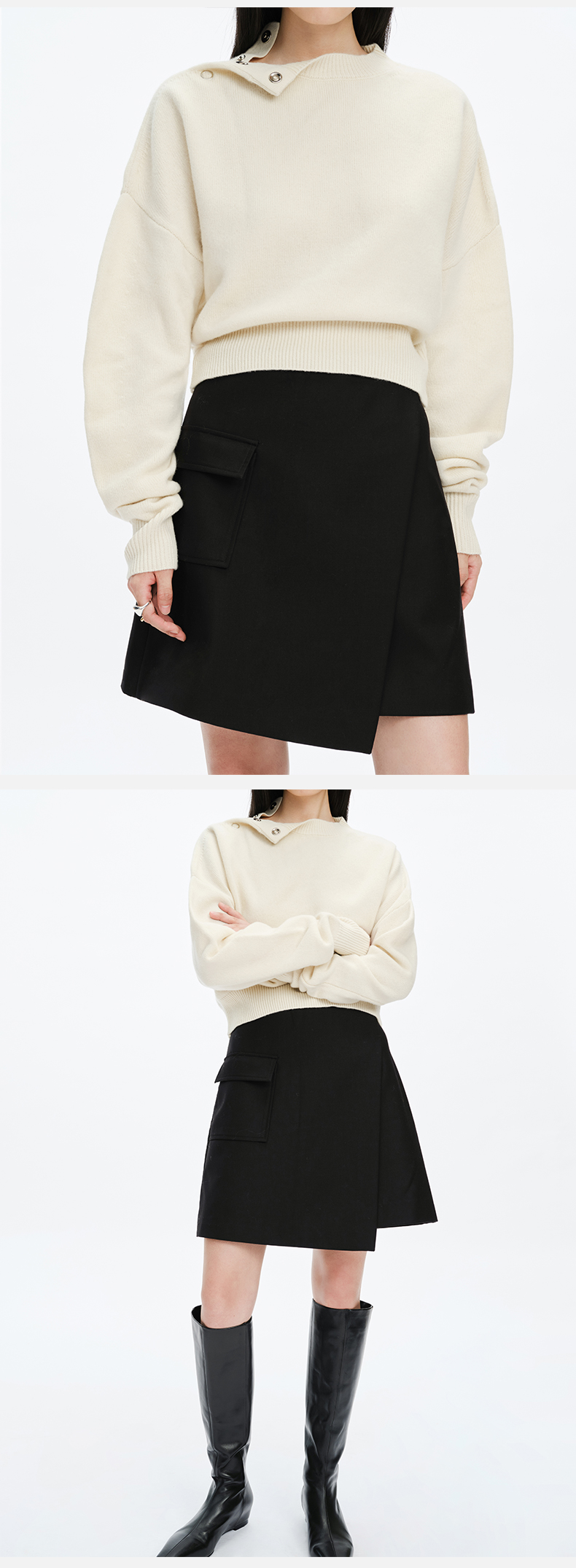 HIDEMI 简约设计感微荡立领半袖廓形套装 黑色/白色 上衣/半身裙