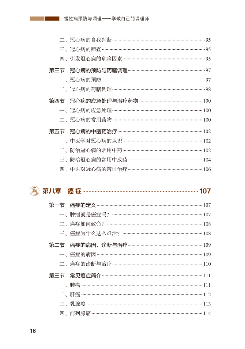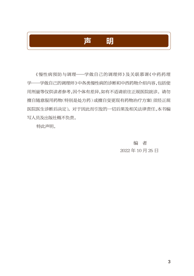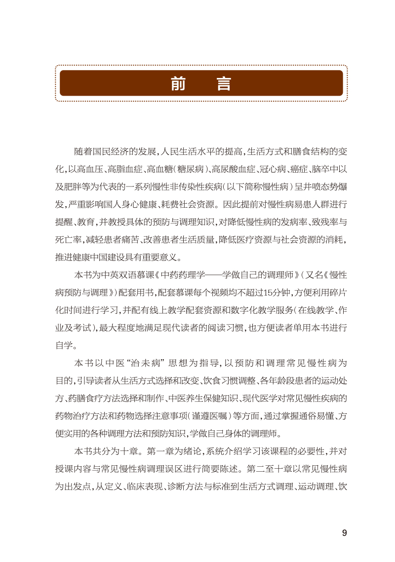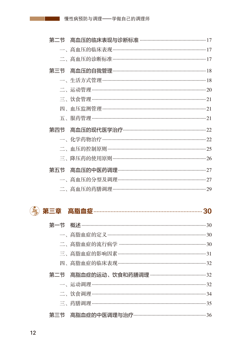 本书以中医“治未病”思想为指导,以预防和调理常见慢性病为目的,引导读者从生活方式选择和改变、饮食习惯调整、各年龄段患者的运动处方、药膳食疗方法选择和制作、中医养生保健知识、现代医学对常见慢性疾病的药物治疗方法和药物选择注意事项(谨遵医嘱)等方面,通过掌握通俗易懂、方便实用的各种调理方法和预防知识,学做自己身体的调理师。本书适合所有关心自己及家人健康及对常见慢性病(高血压、高血脂、高血糖、高尿酸血症、“四高”共病、冠心病、癌症、脑卒中、肥胖)有预防意识的人群。
