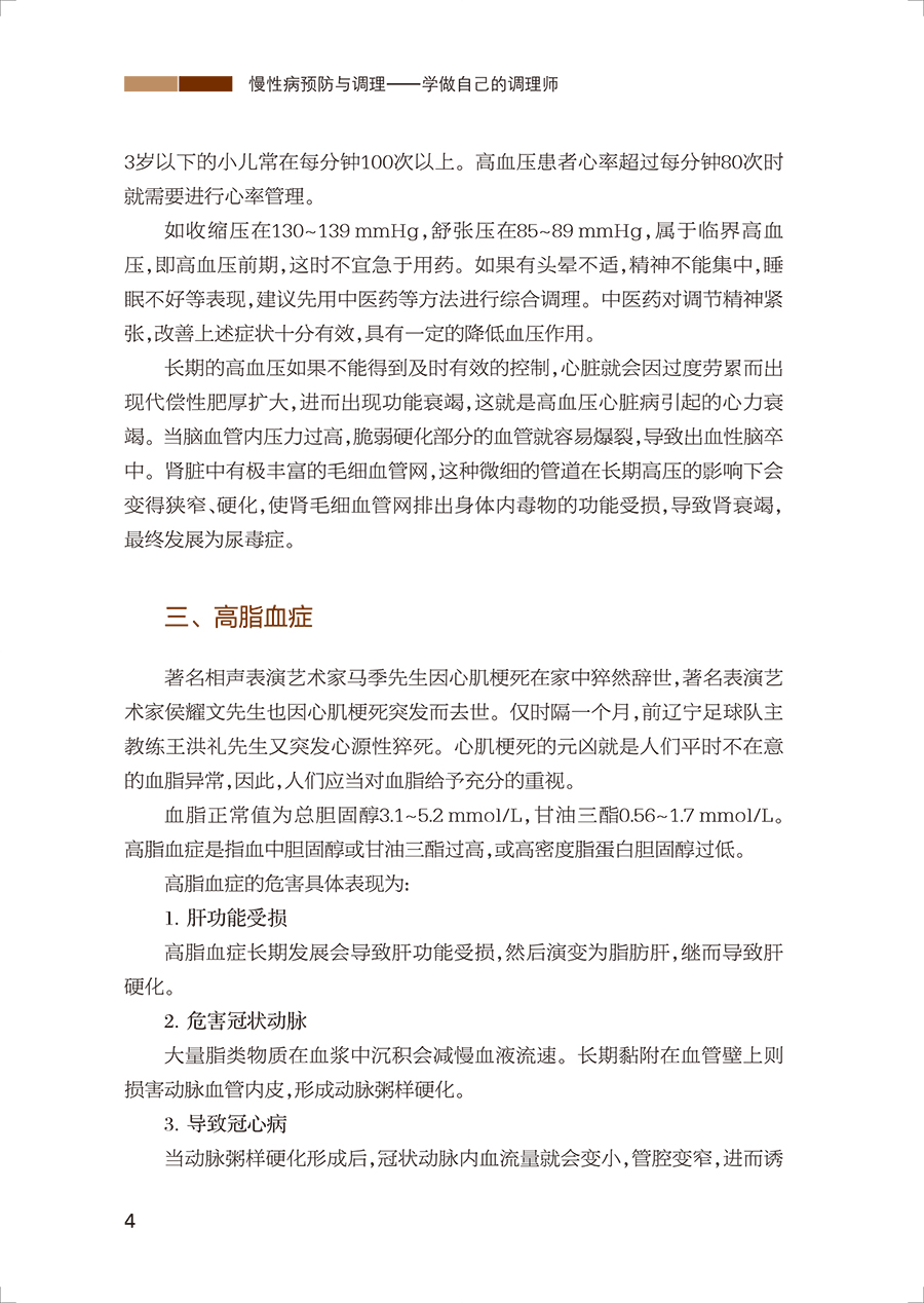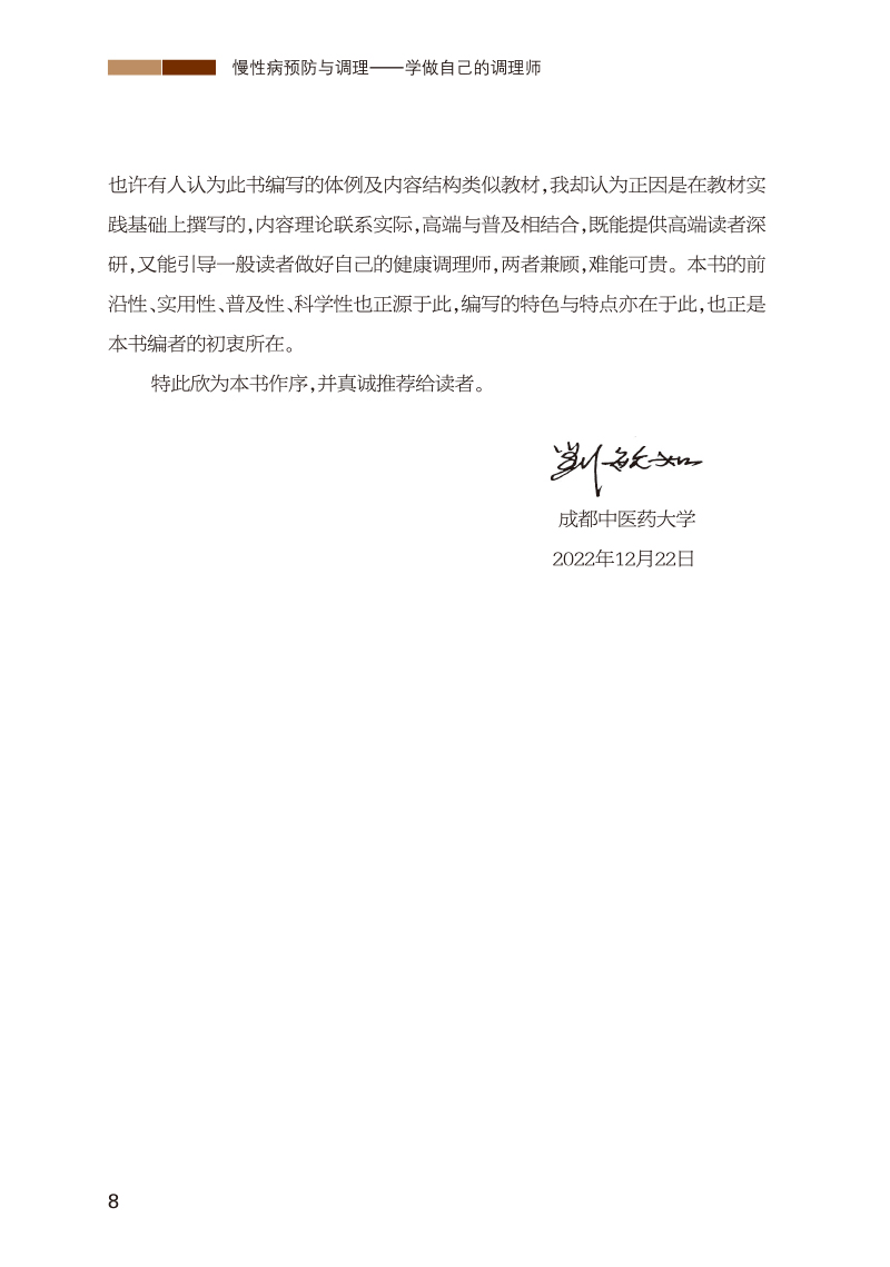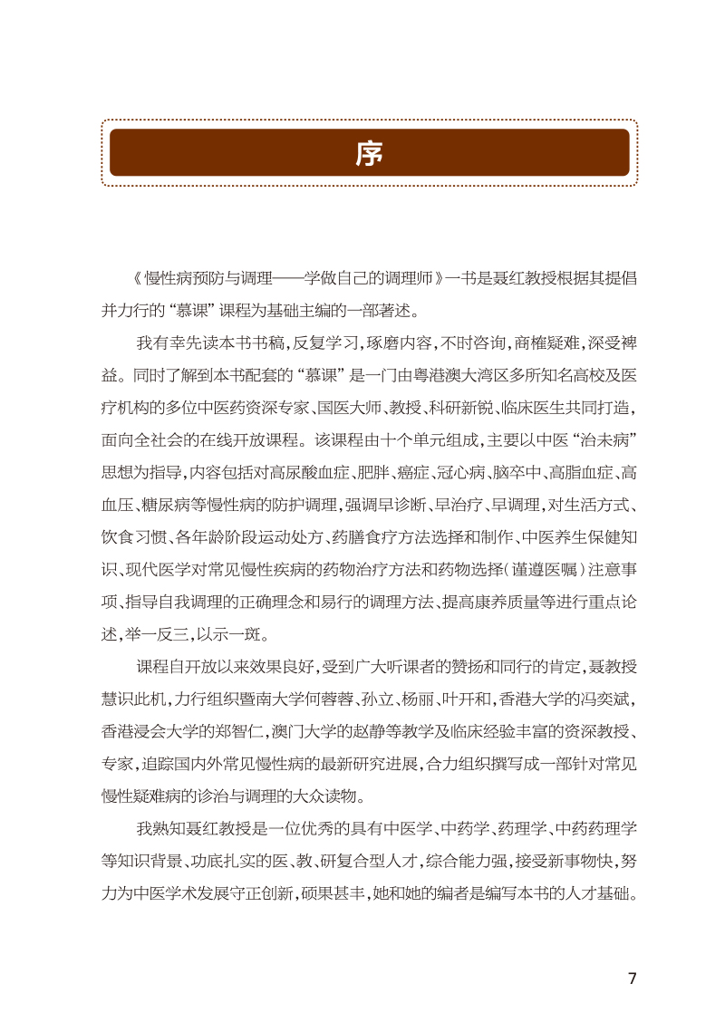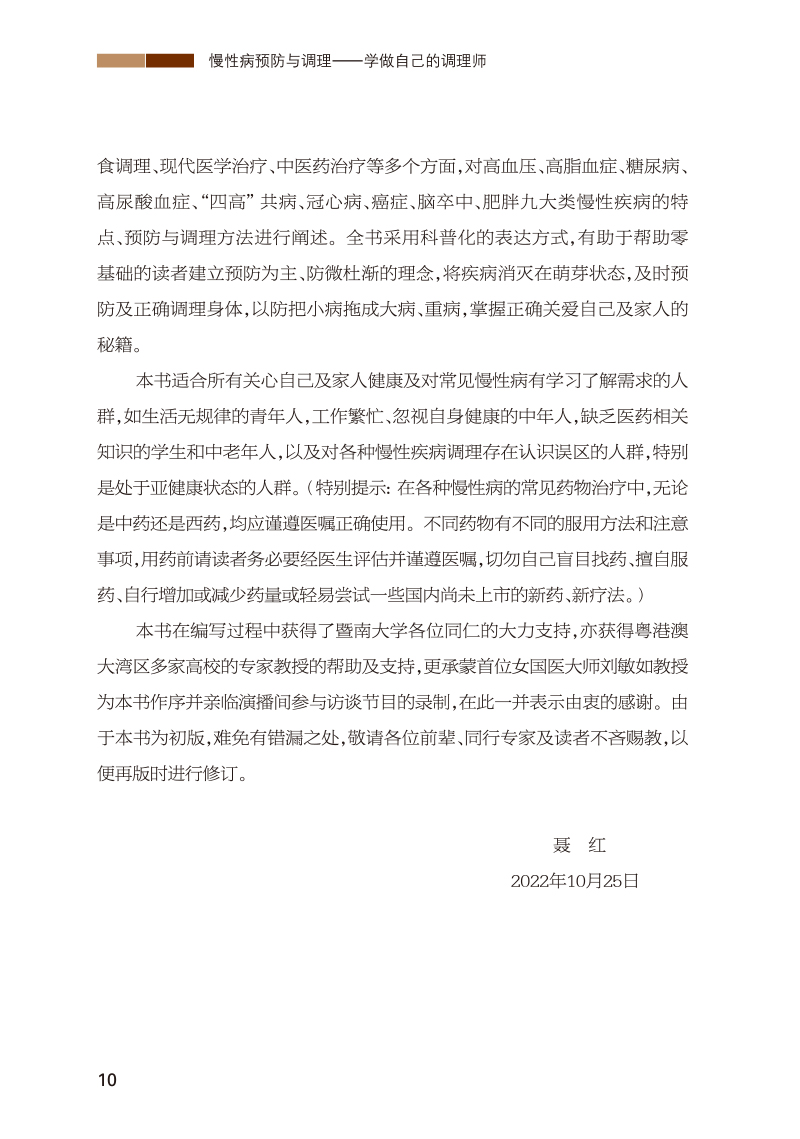本书以中医“治未病”思想为指导,以预防和调理常见慢性病为目的,引导读者从生活方式选择和改变、饮食习惯调整、各年龄段患者的运动处方、药膳食疗方法选择和制作、中医养生保健知识、现代医学对常见慢性疾病的药物治疗方法和药物选择注意事项(谨遵医嘱)等方面,通过掌握通俗易懂、方便实用的各种调理方法和预防知识,学做自己身体的调理师。本书适合所有关心自己及家人健康及对常见慢性病(高血压、高血脂、高血糖、高尿酸血症、“四高”共病、冠心病、癌症、脑卒中、肥胖)有预防意识的人群。