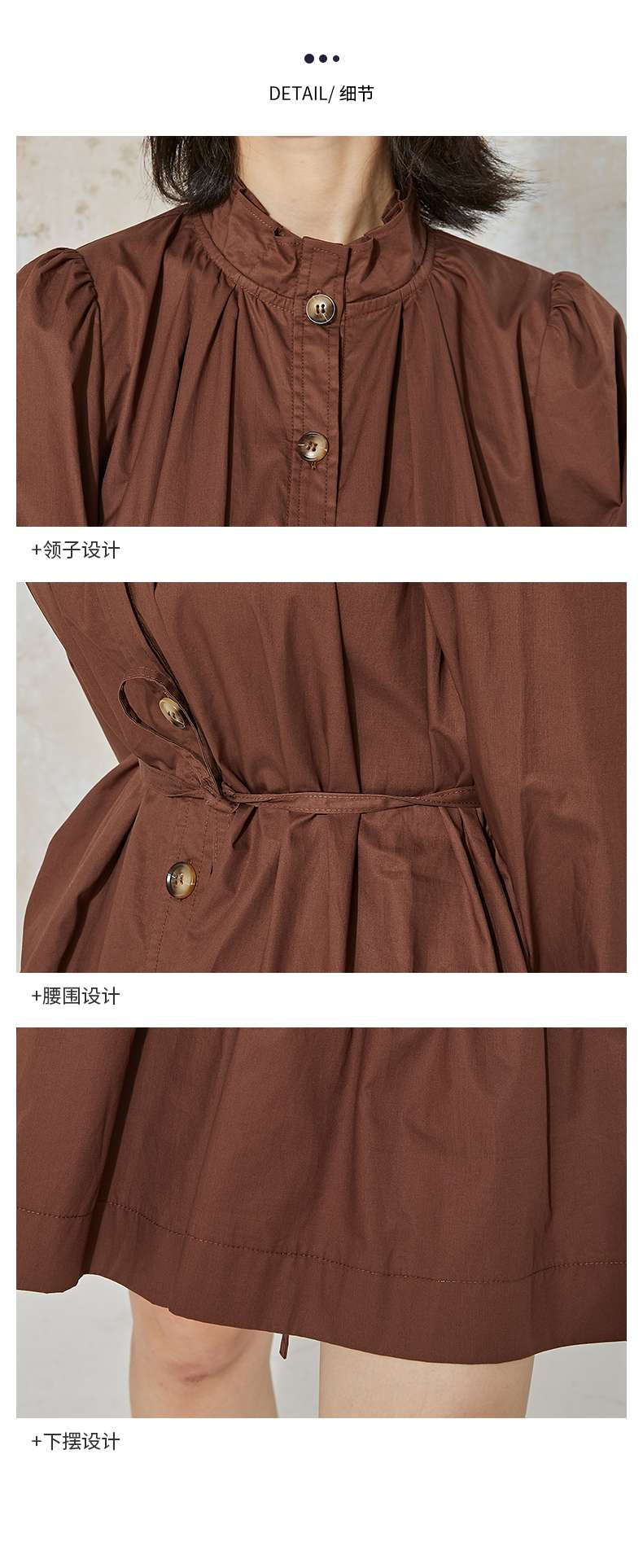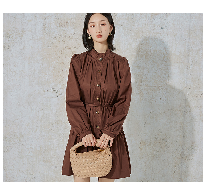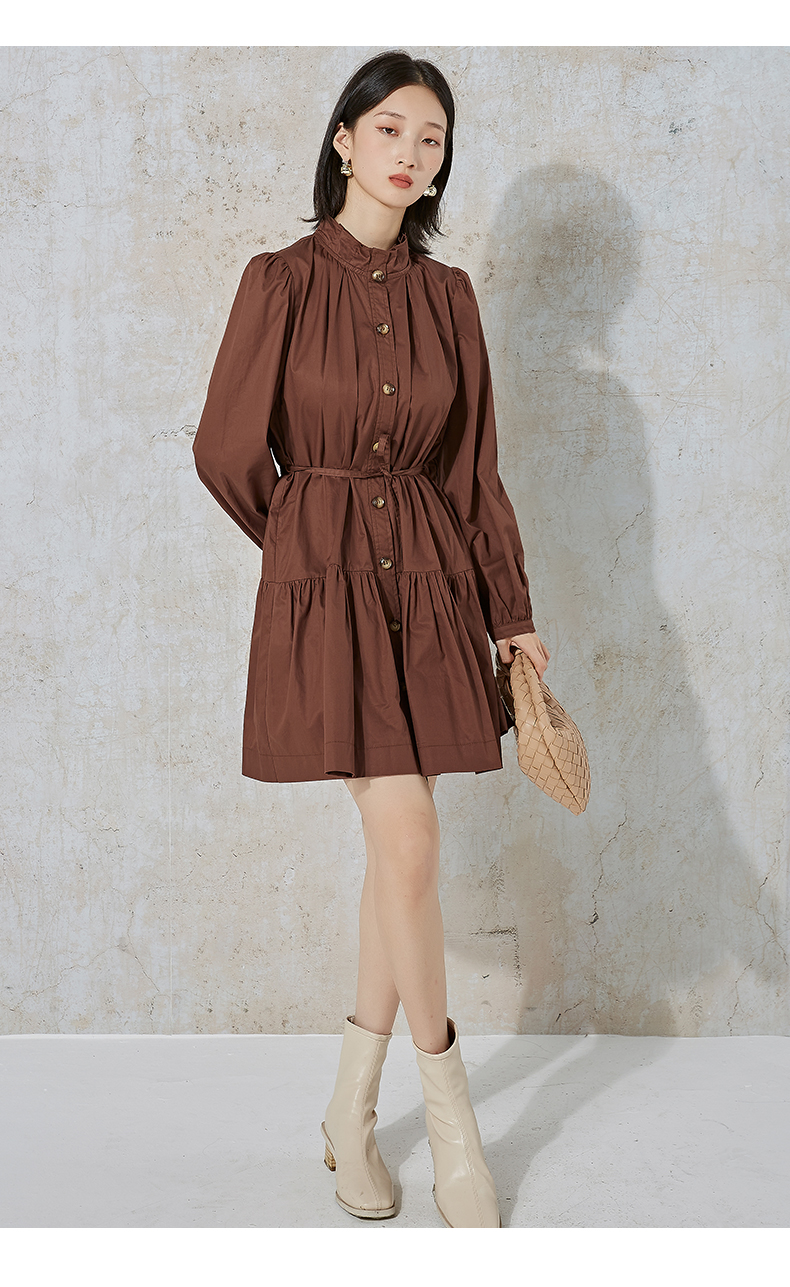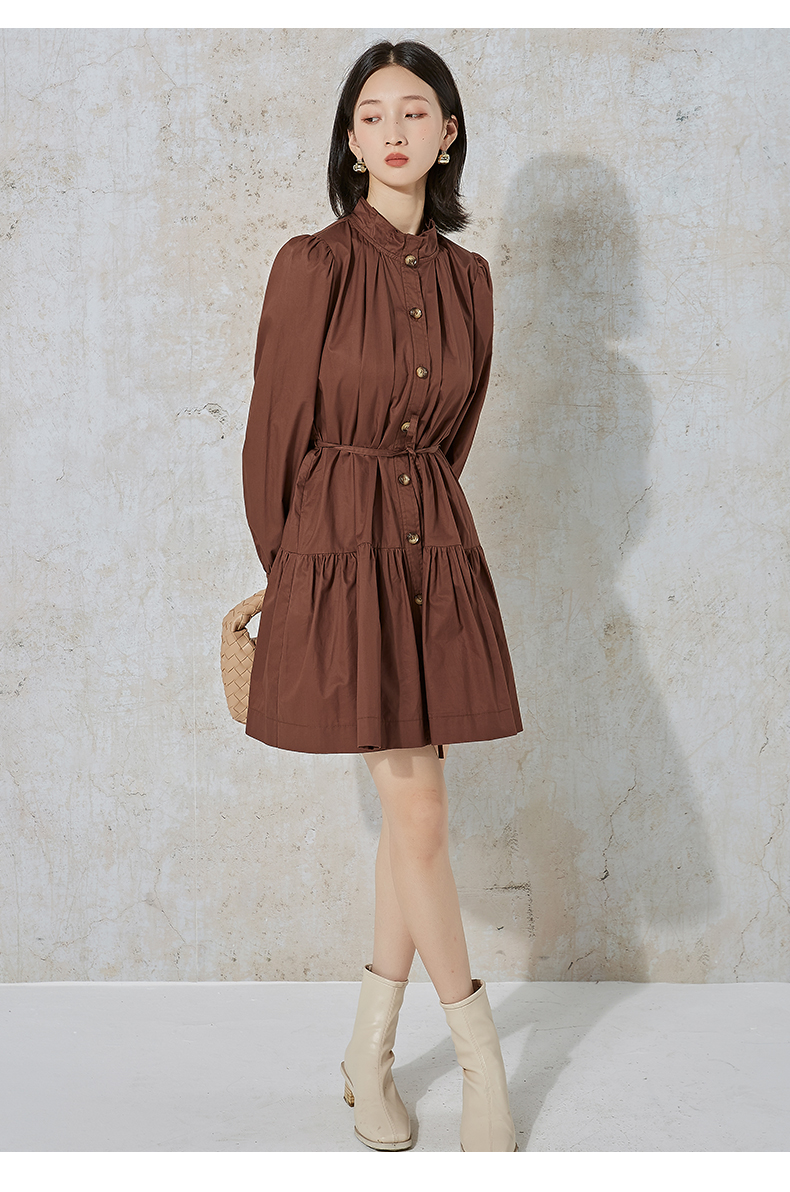 NUTS春秋季纯色设计感气质收腰褶皱A字显瘦长袖连衣裙女231103172B